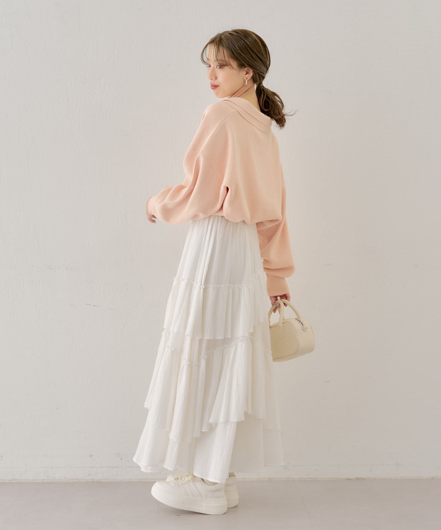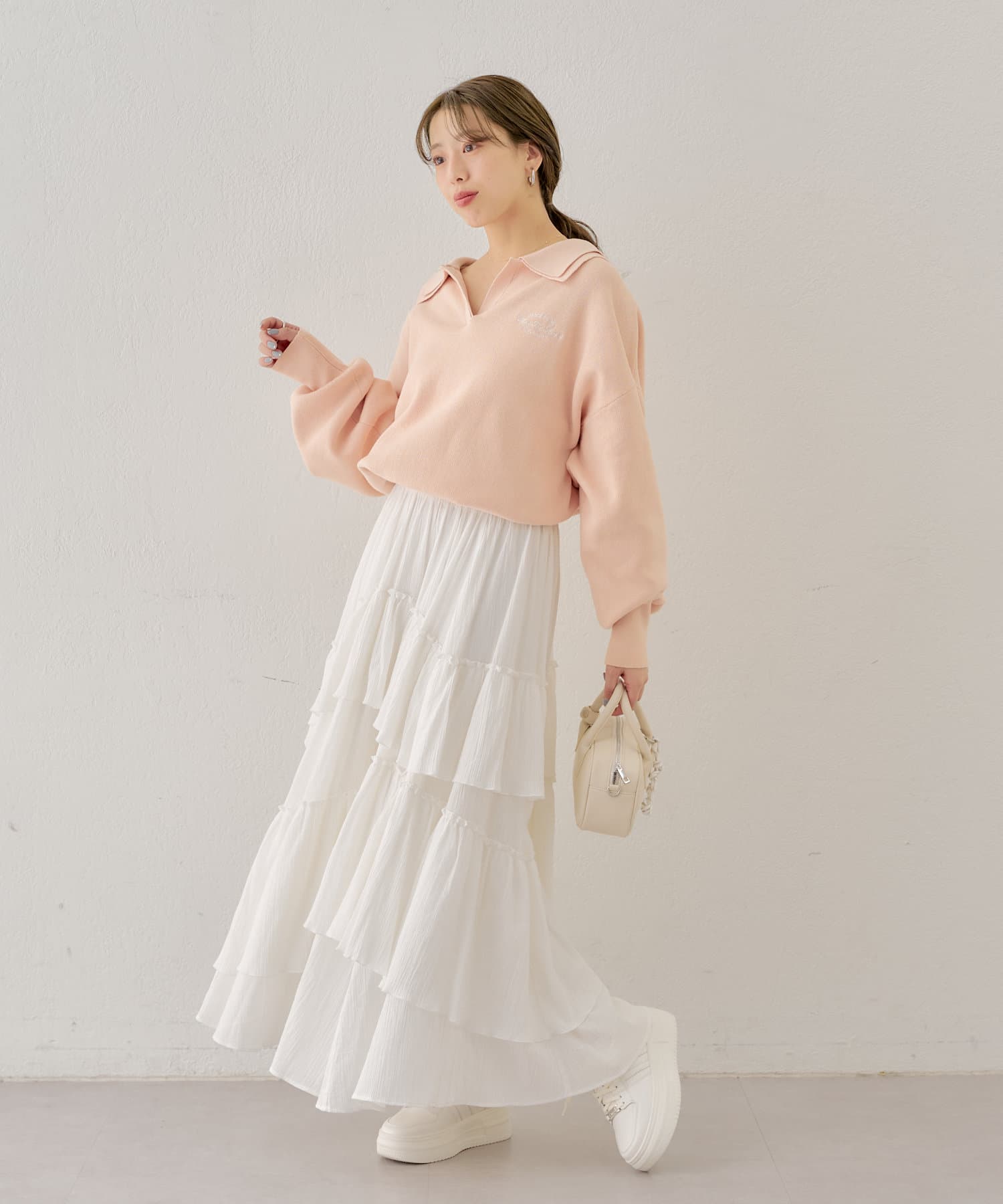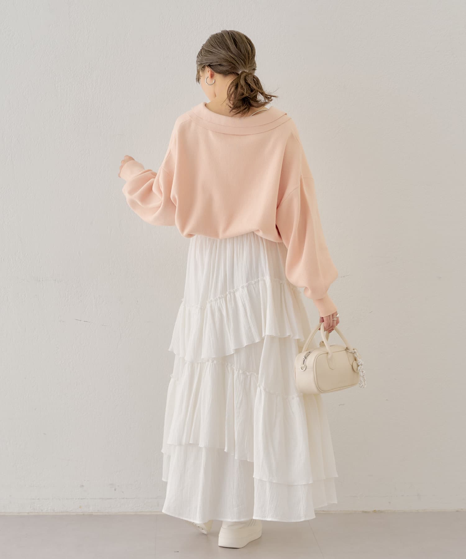 ・襟付きのアイテムと合わせていただくと大人フェミニンな印象に。