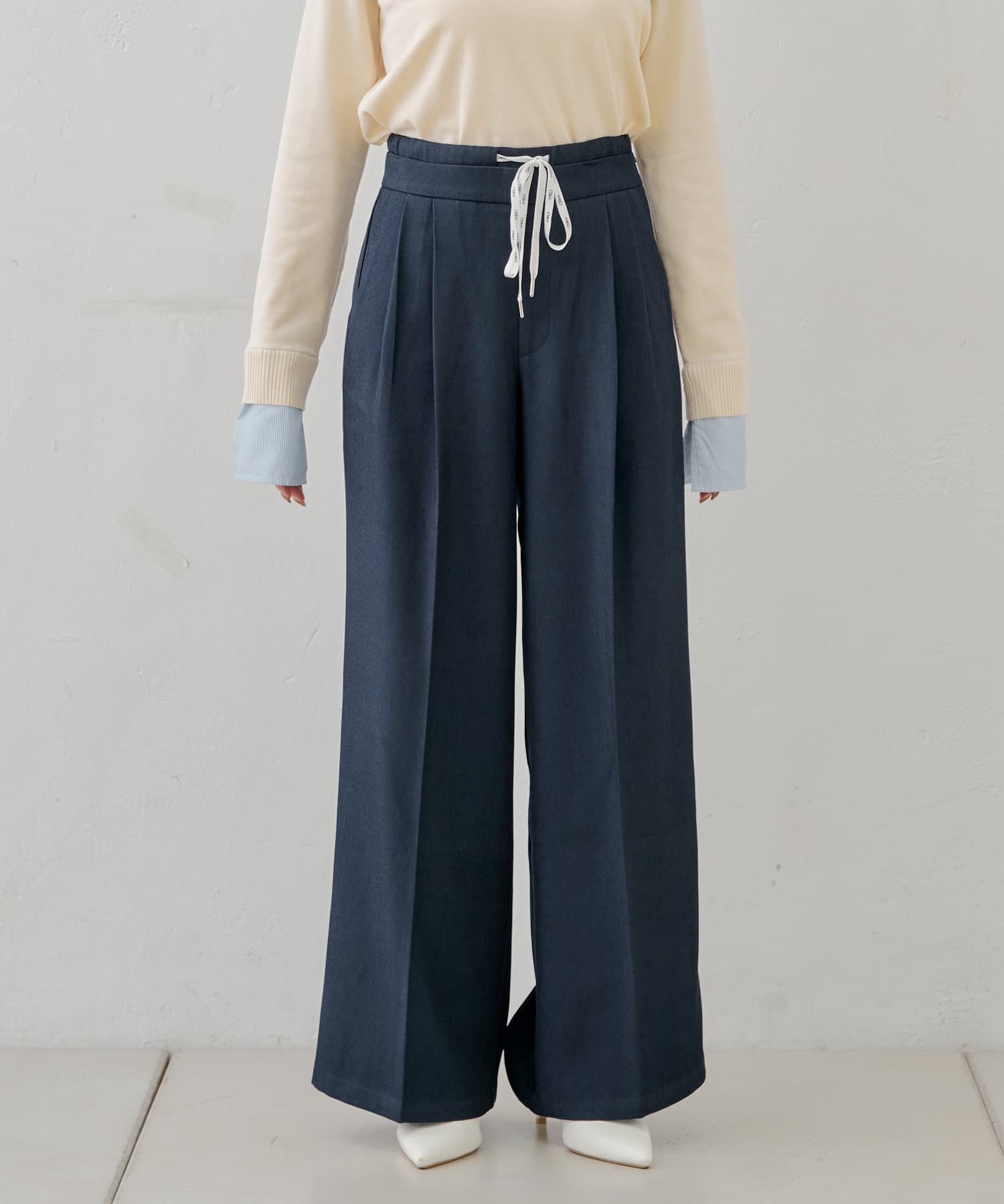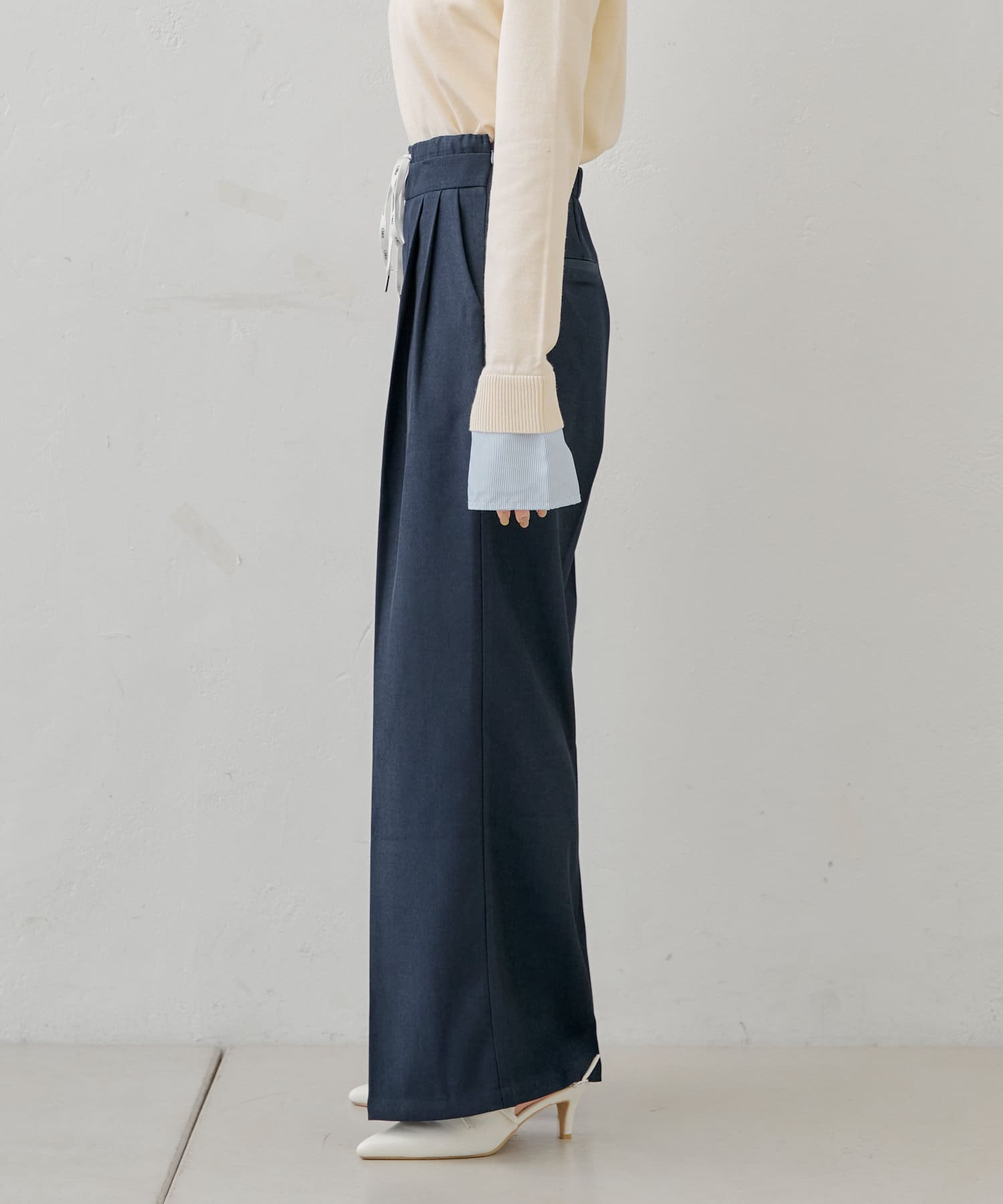 ロゴ紐付きのレイヤード風スラックスパンツ
