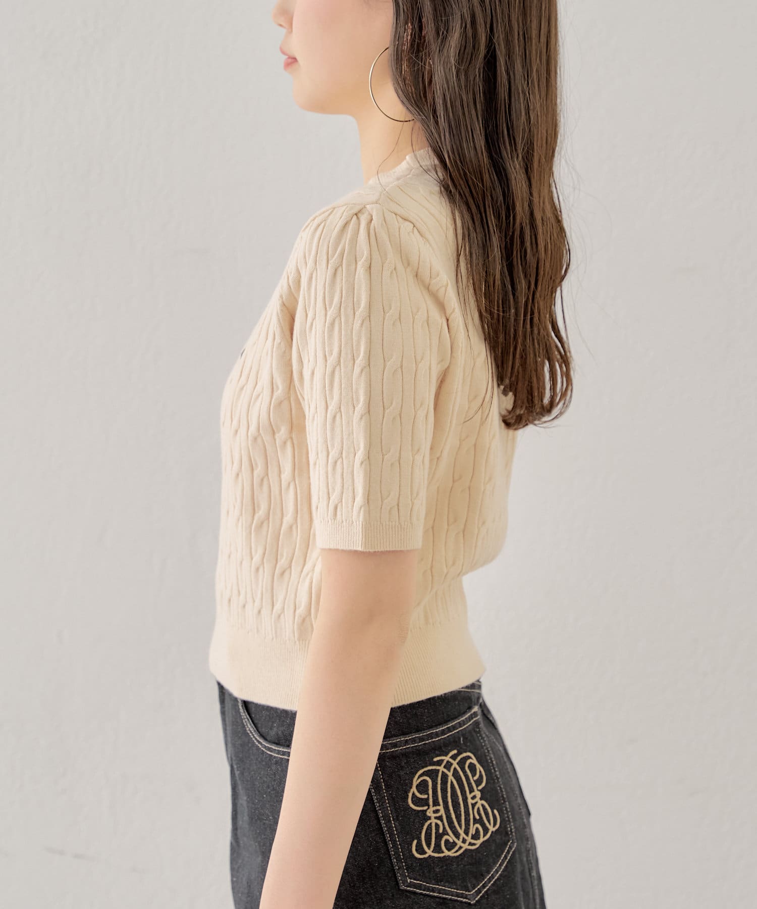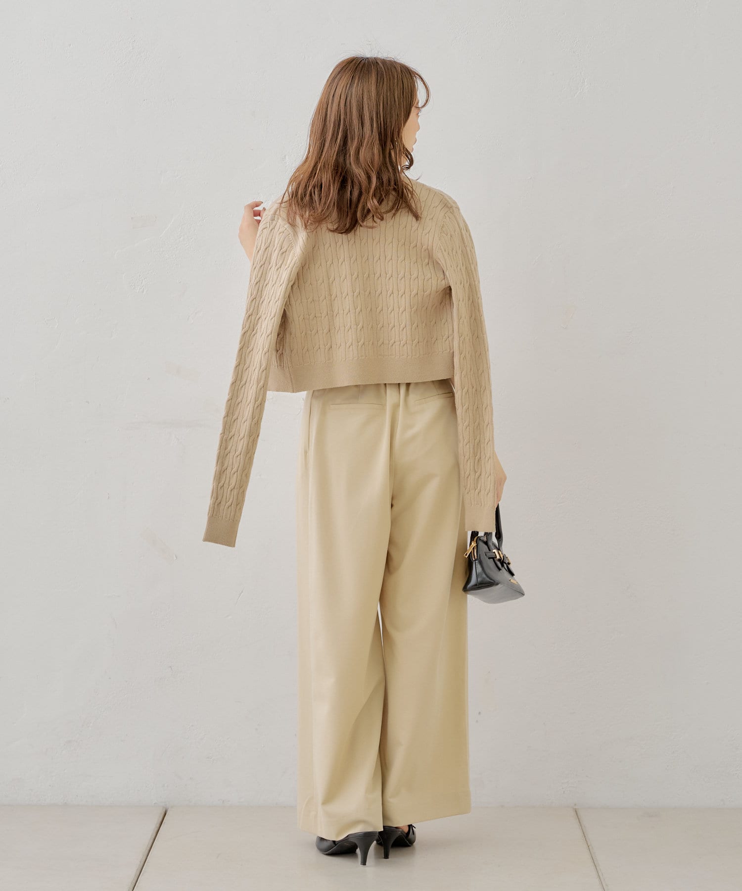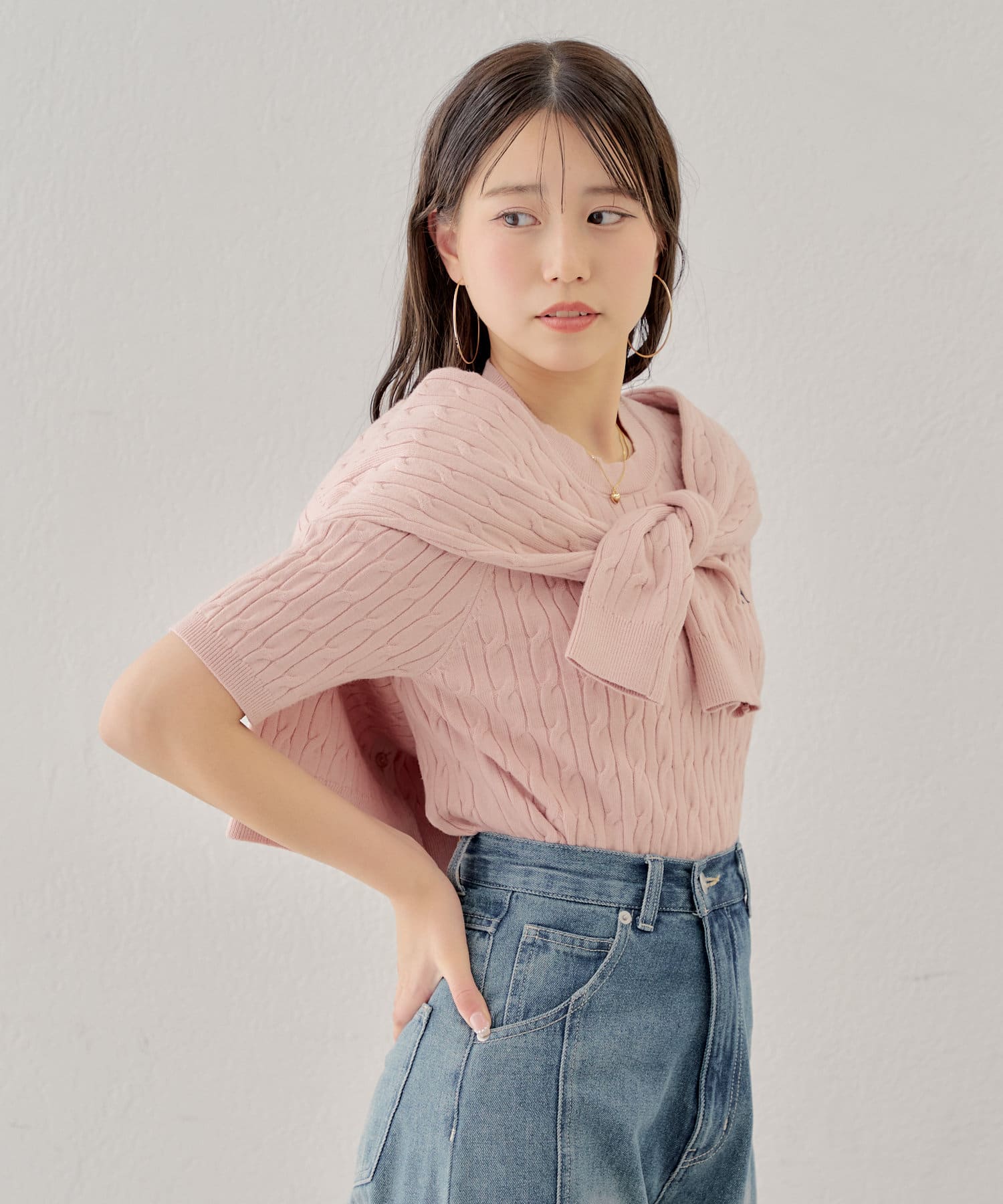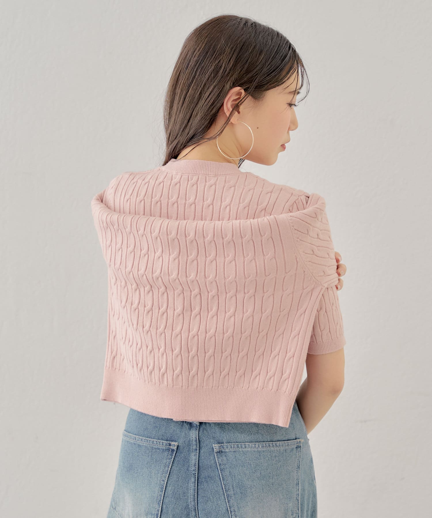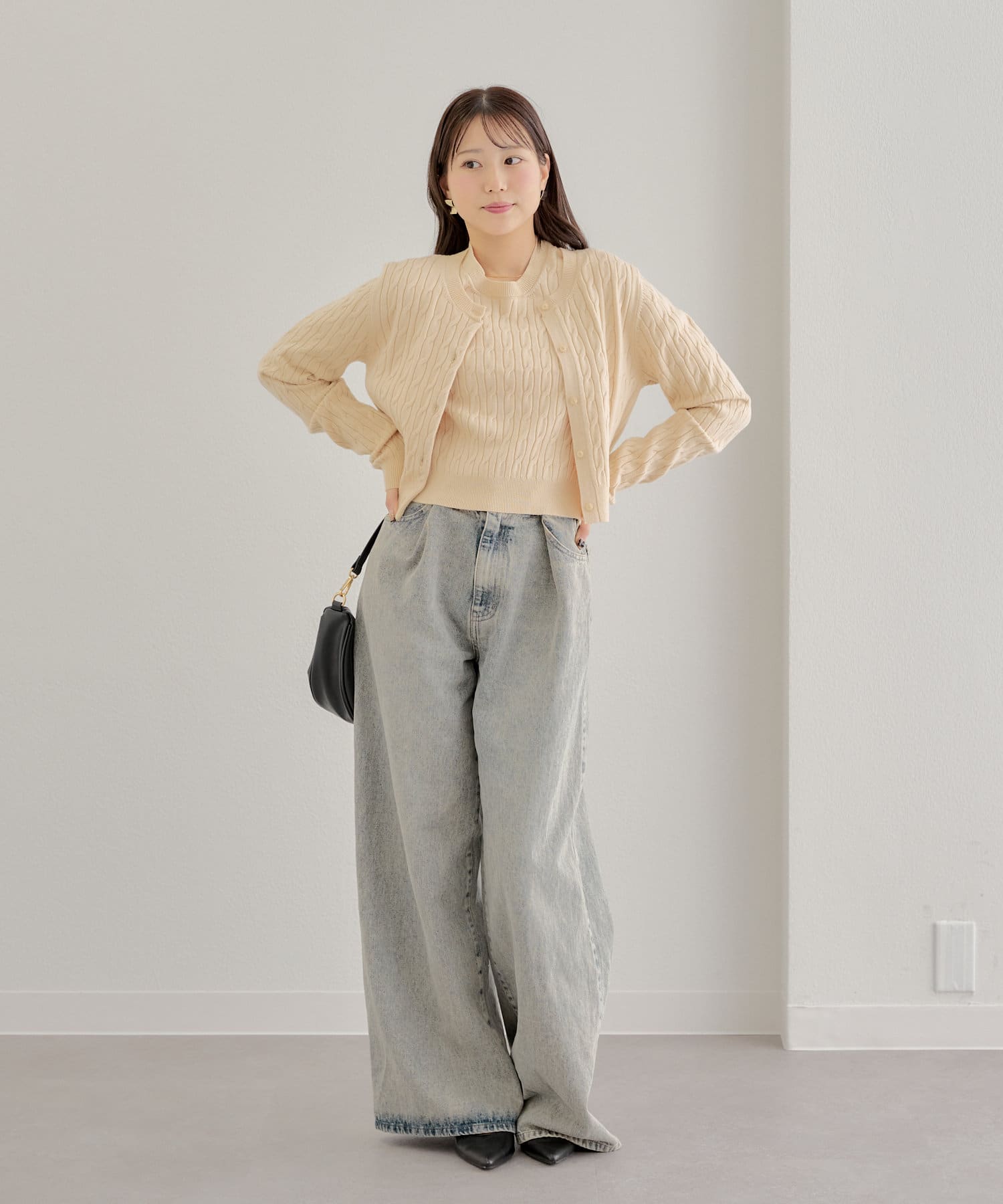 ケーブル柄のカーディガンと半袖ニットの着回し力抜群セット