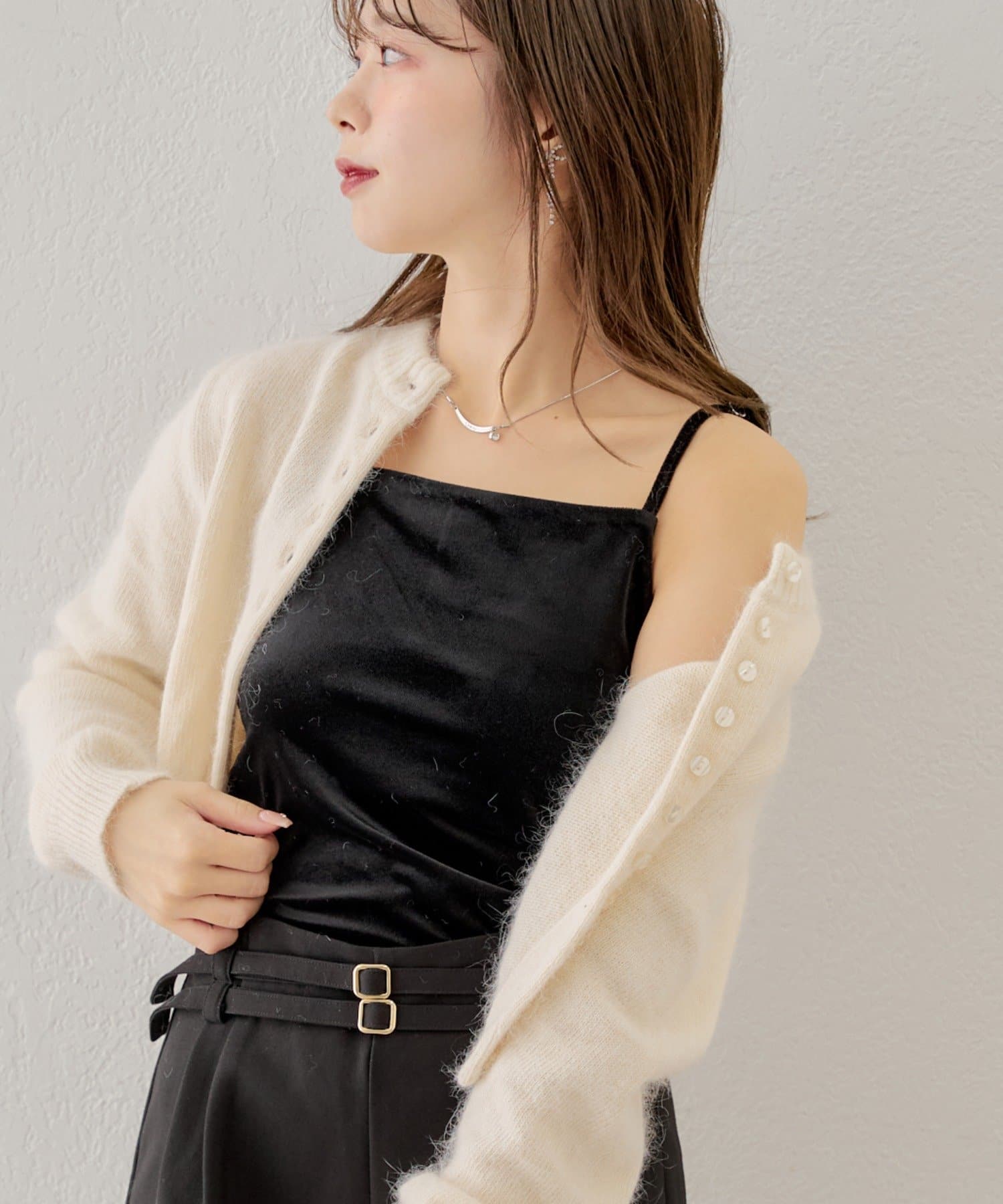 ベロア素材が高見えの、トレンドの肌見せアイテムにも合わせやすいカップ付きキャミソール