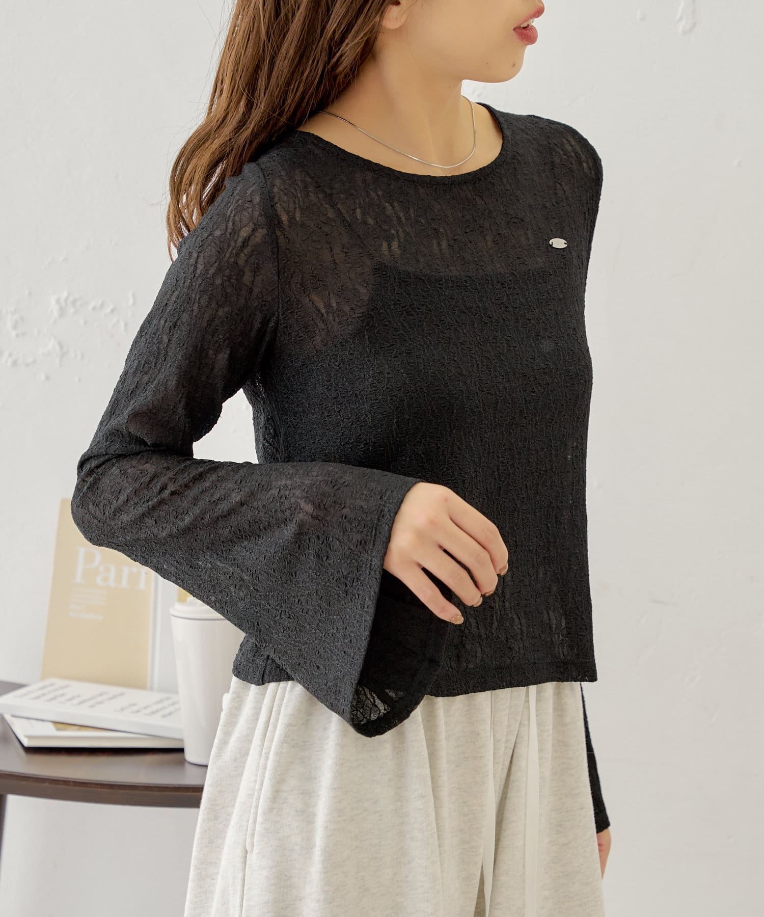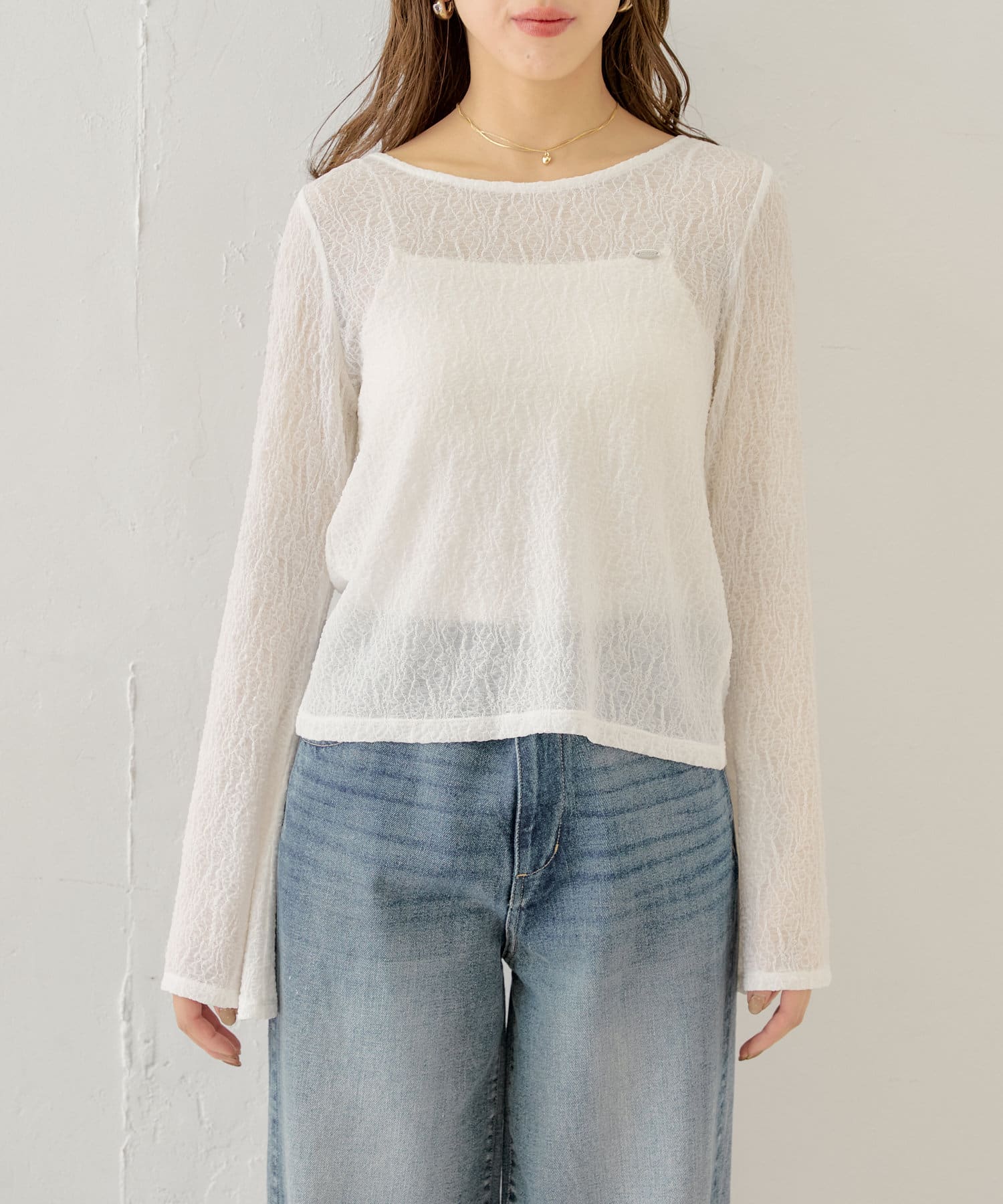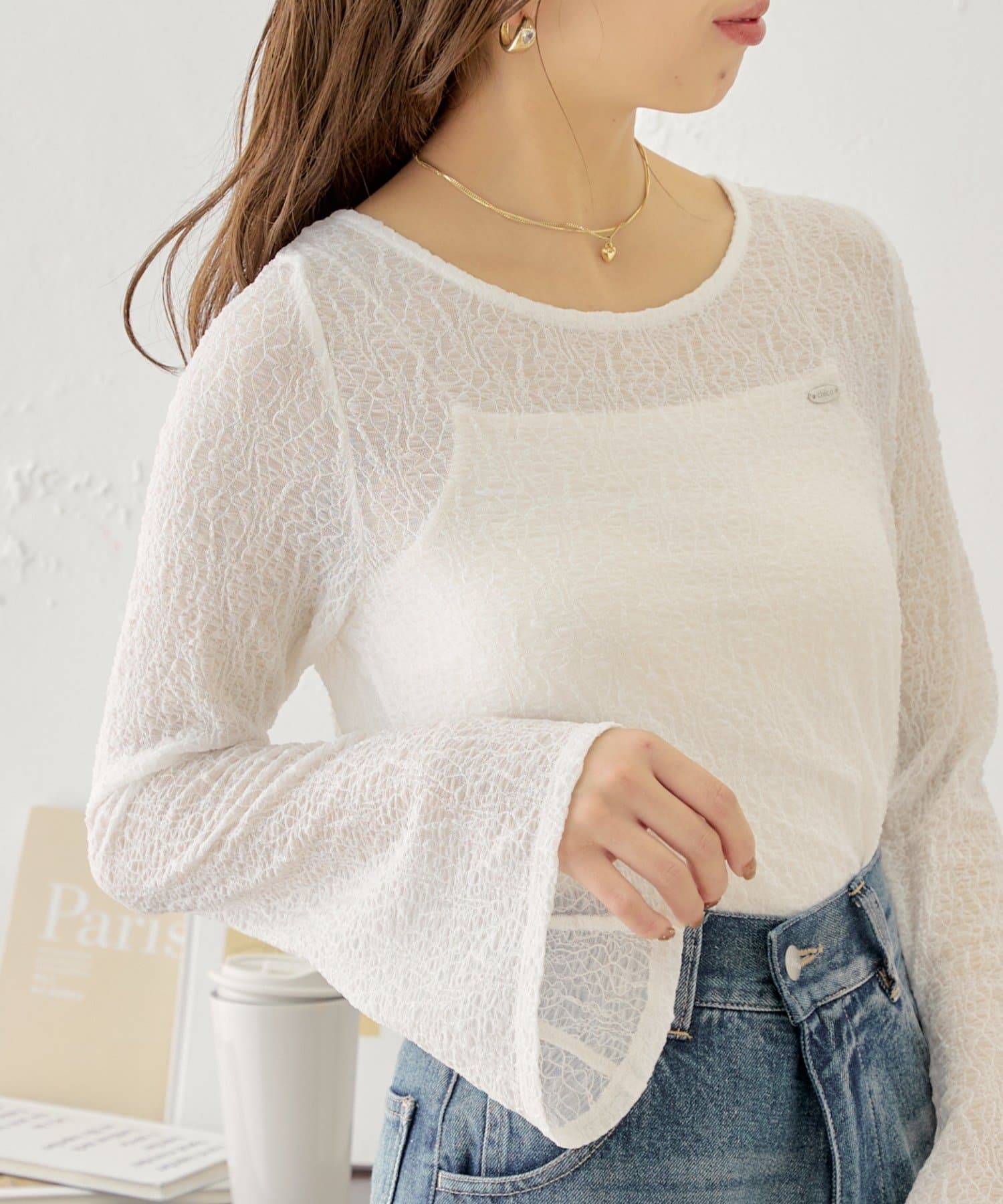 ・キャミソールはカップ付きなのでシアー素材のアイテムと合わせても下着が透ける心配なく着ていただけます。