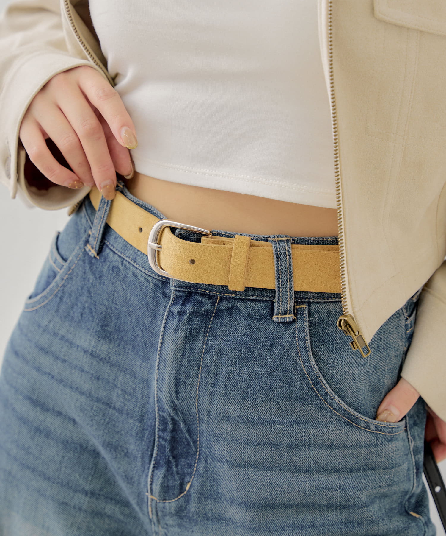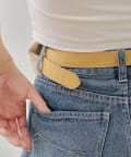 ・バックルがワンポイント入ることでコーデを引き立てるベルトです。