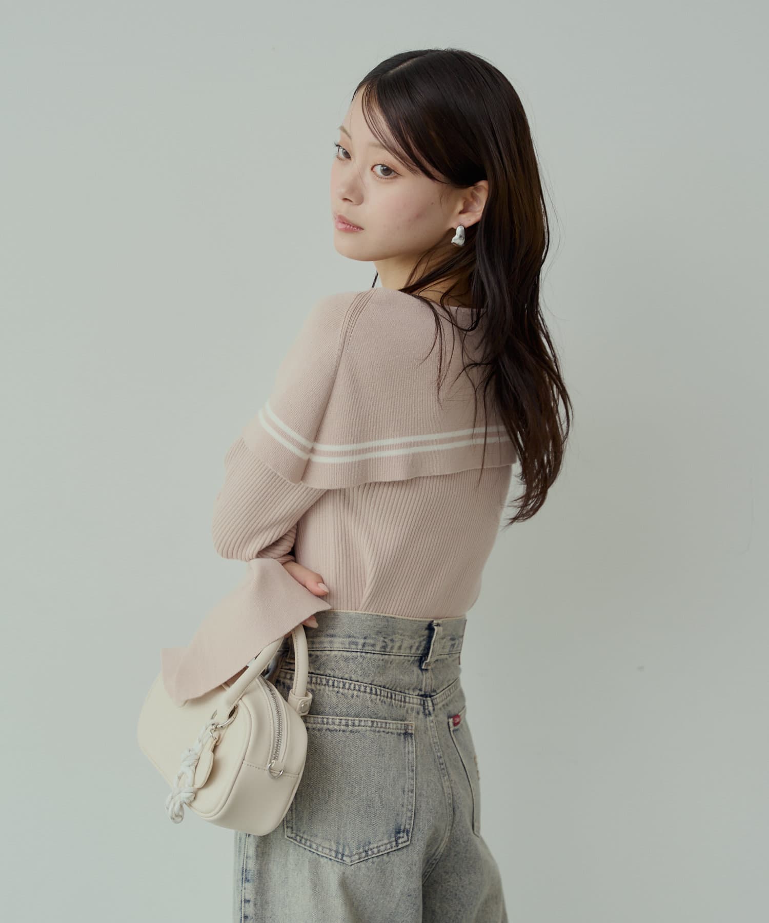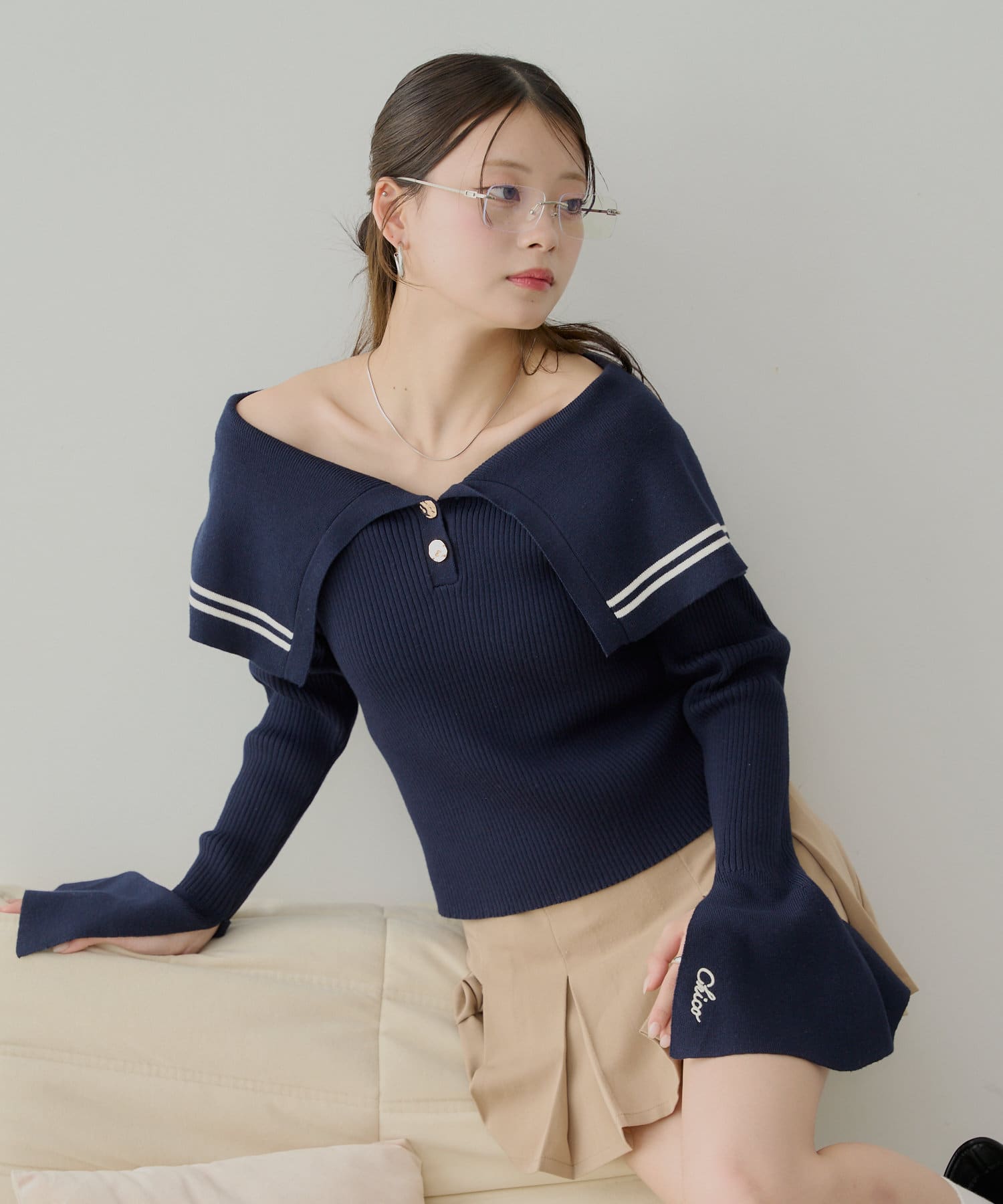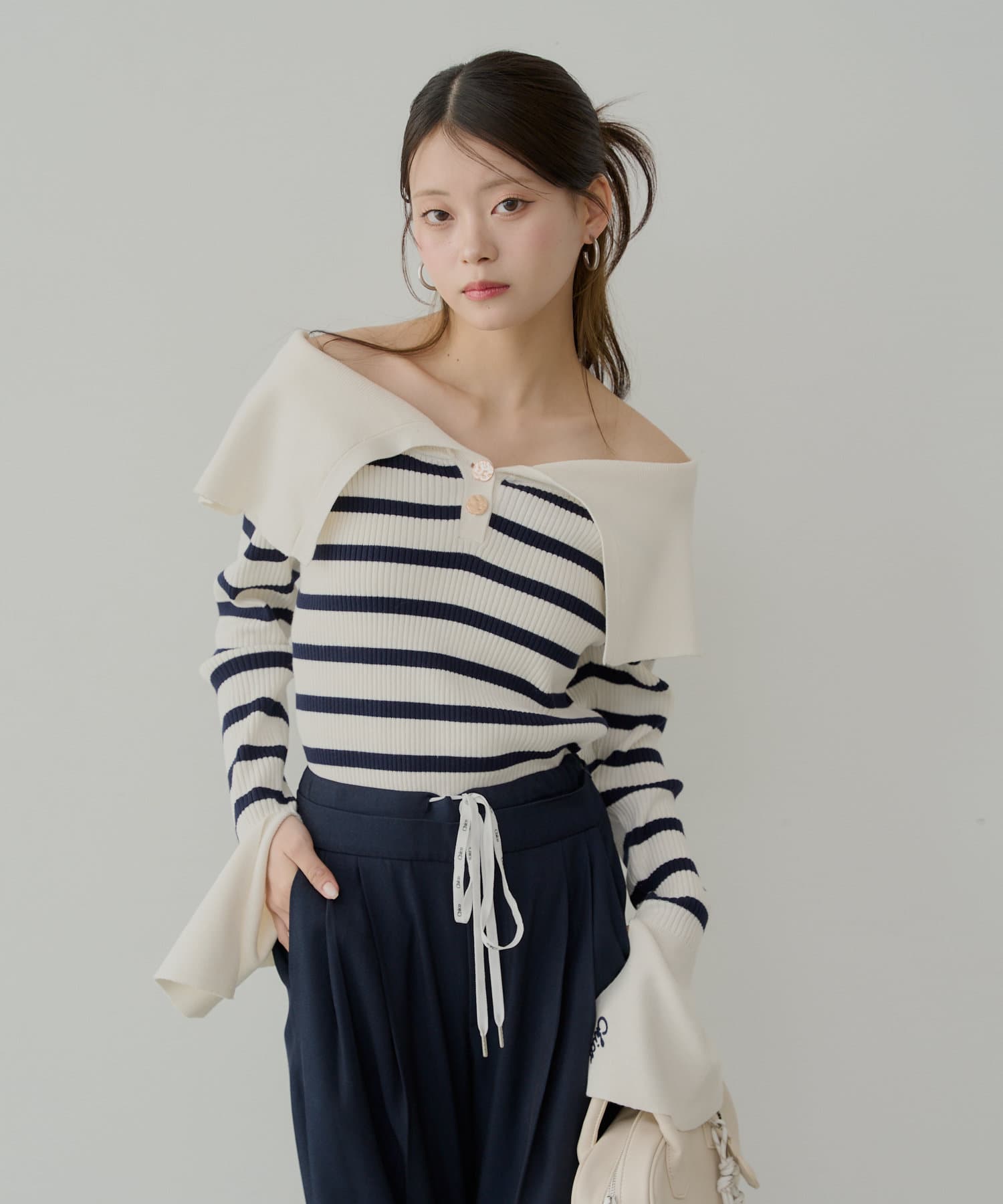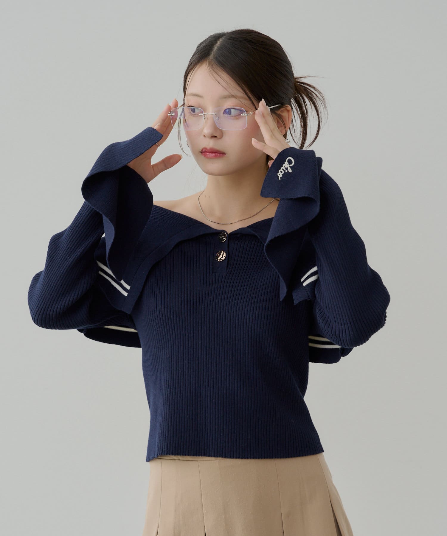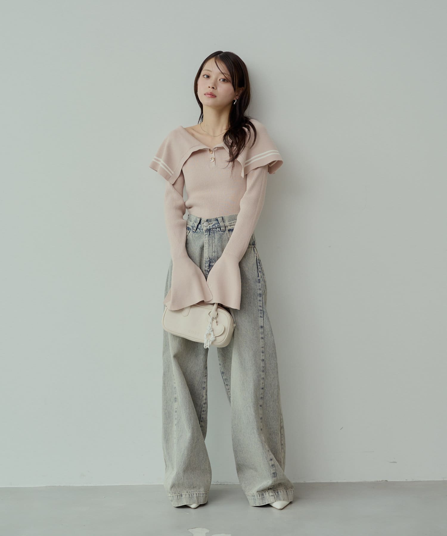 袖口のフレアとビックカラーデザインが目を惹くリブニット