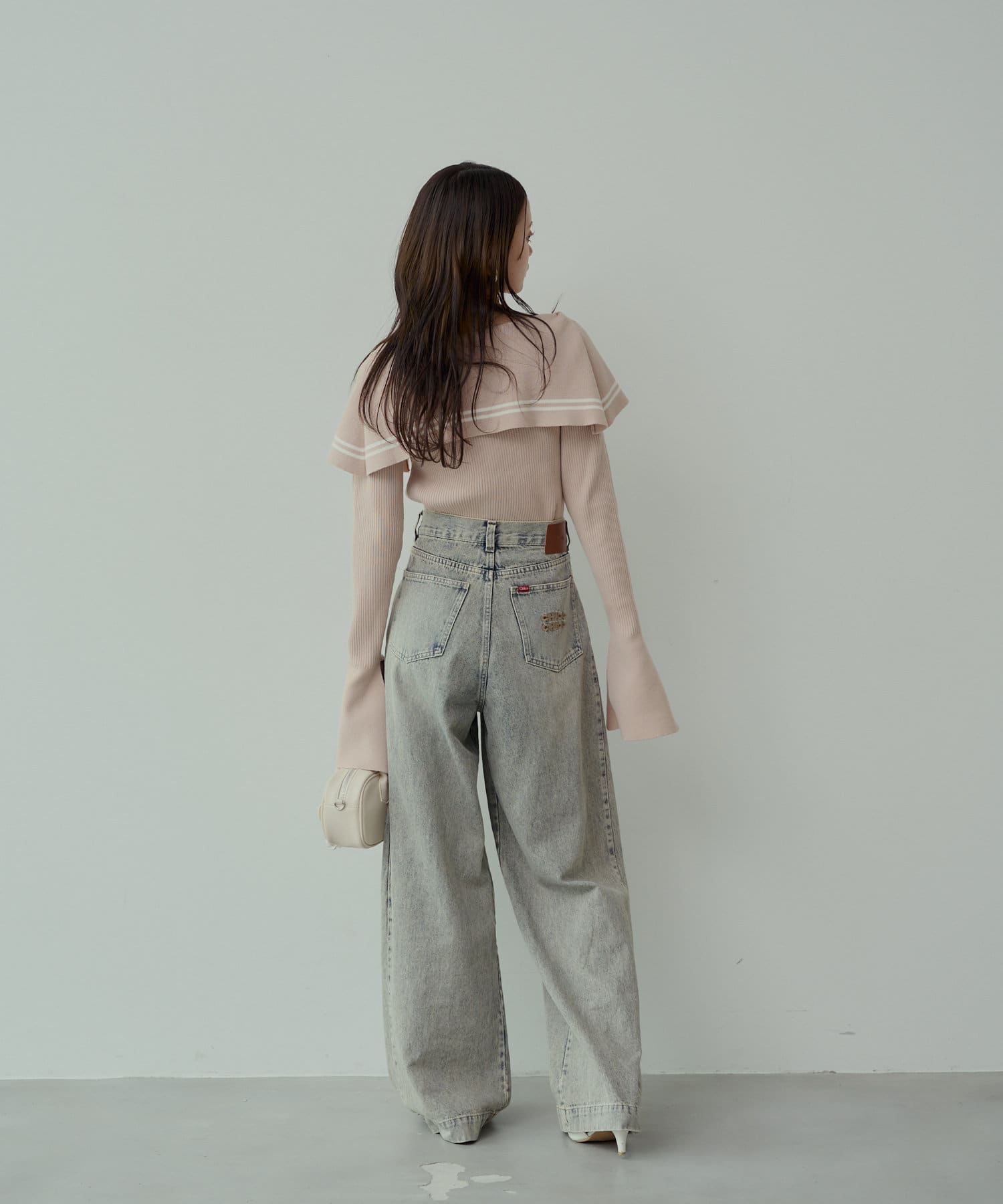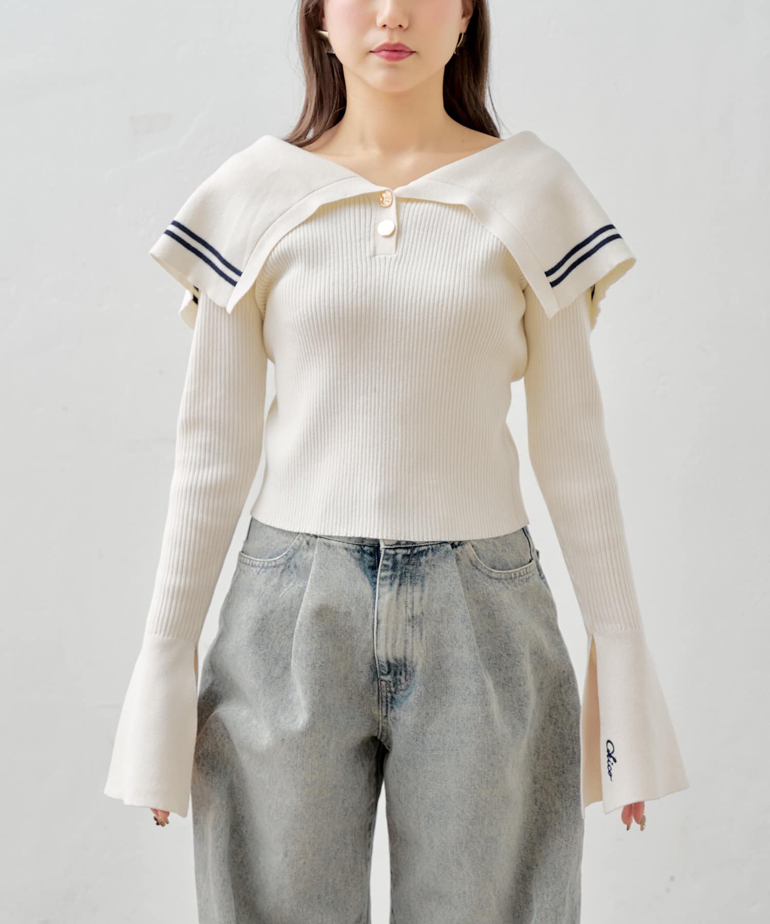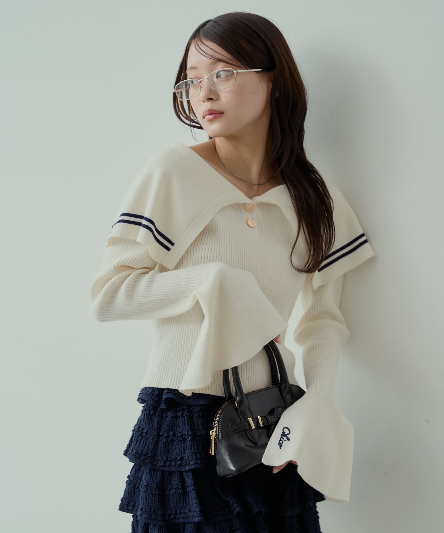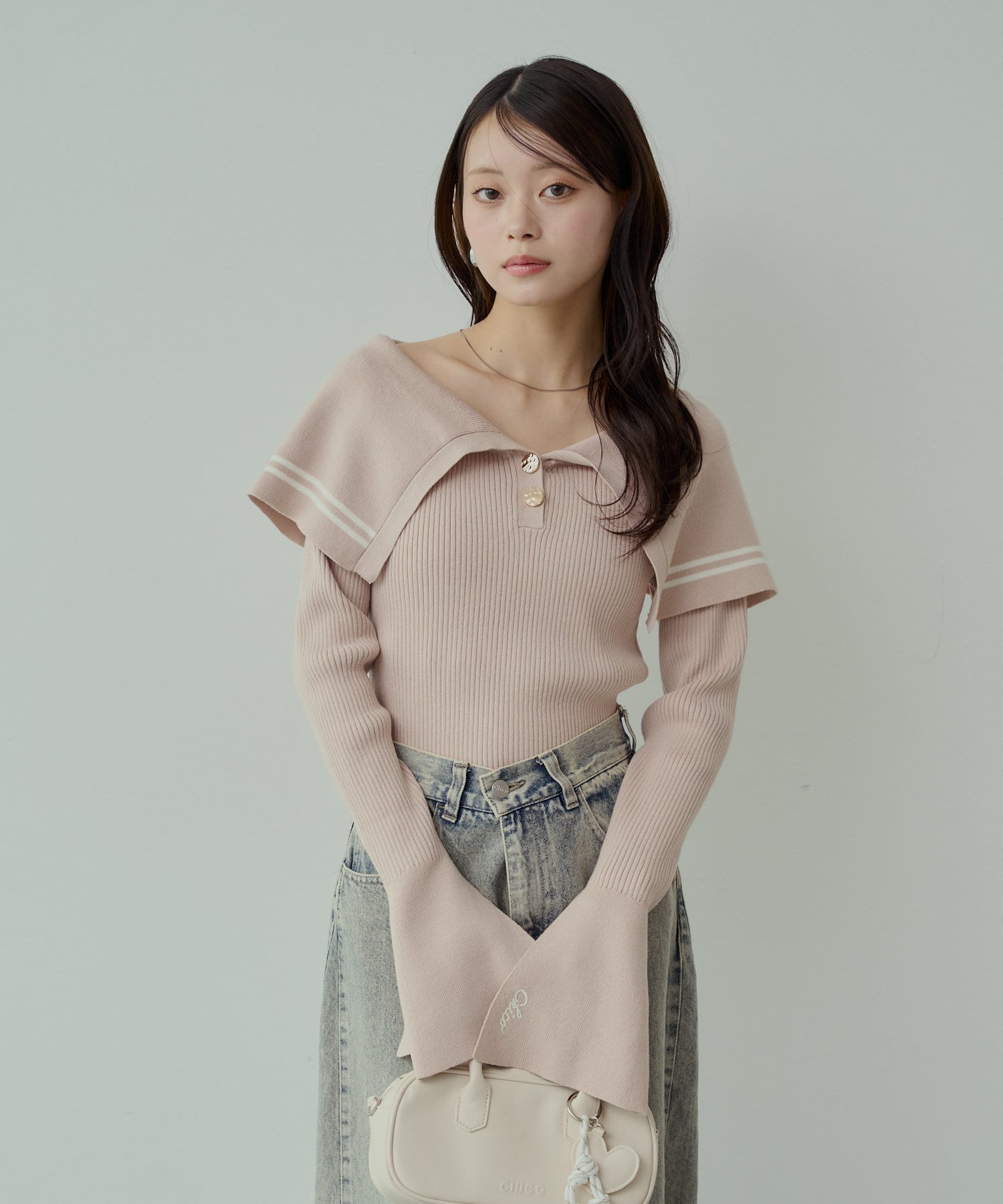 袖口のフレアとビックカラーデザインが目を惹くリブニット