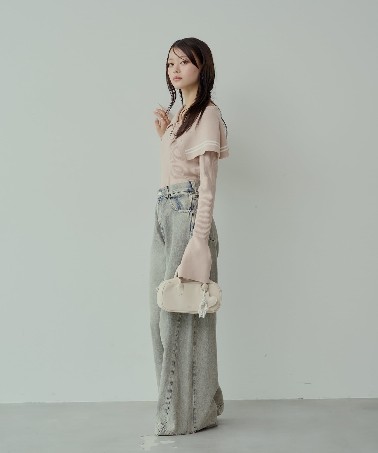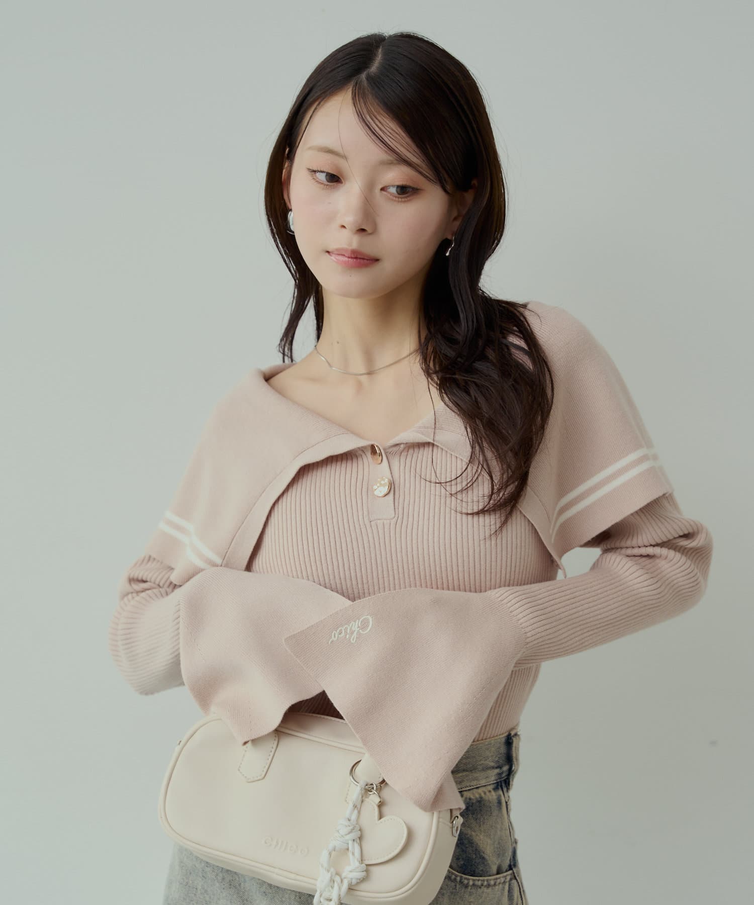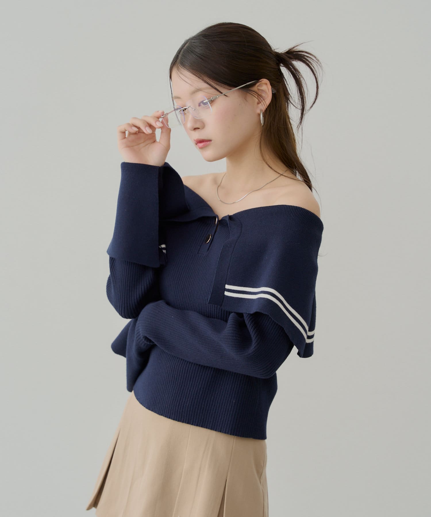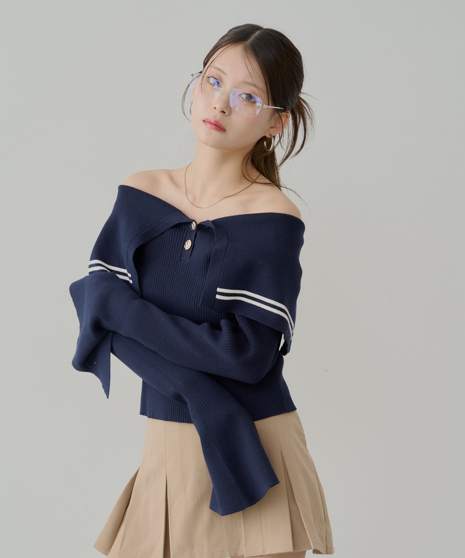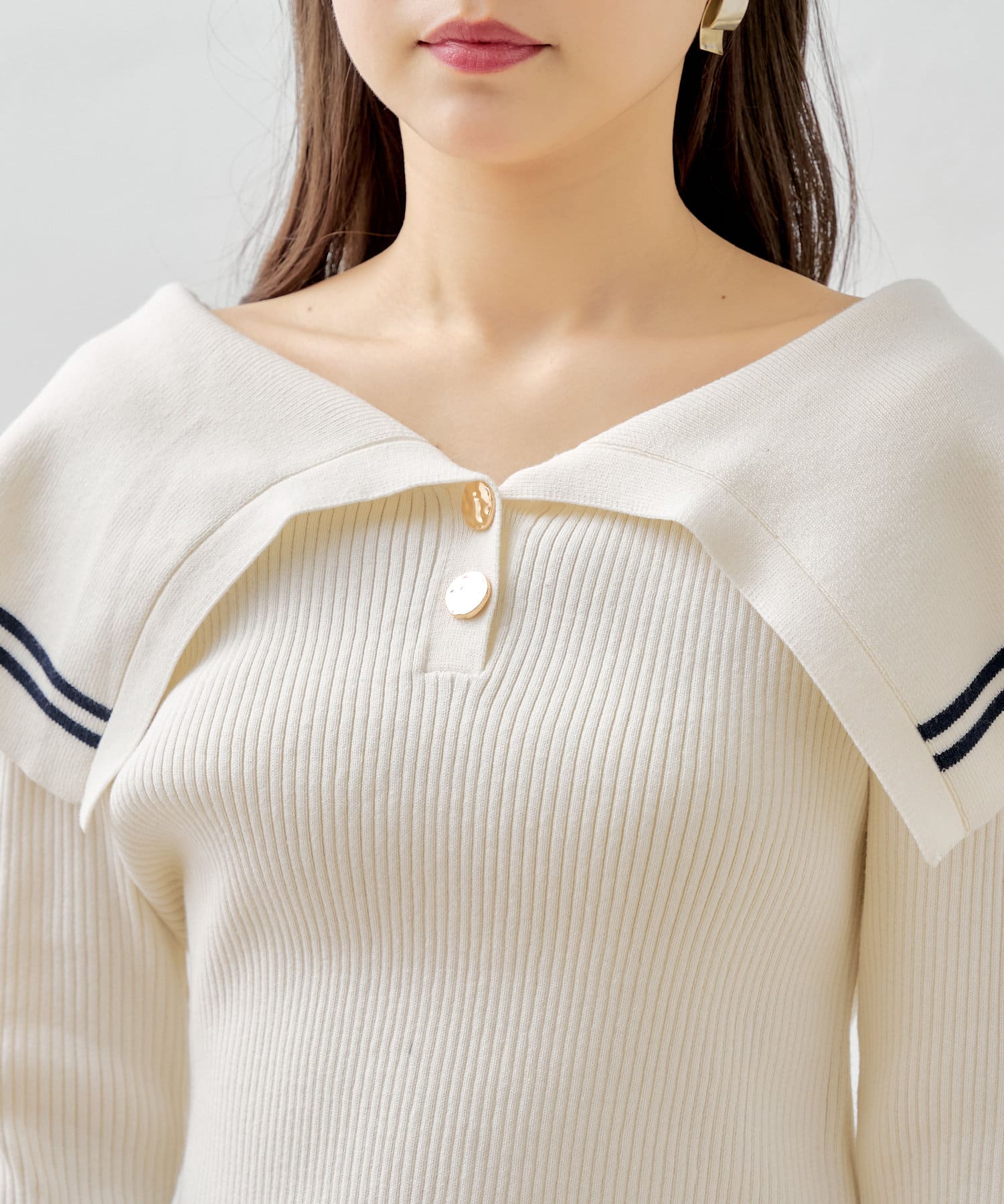 袖口のフレアとビックカラーデザインが目を惹くリブニット