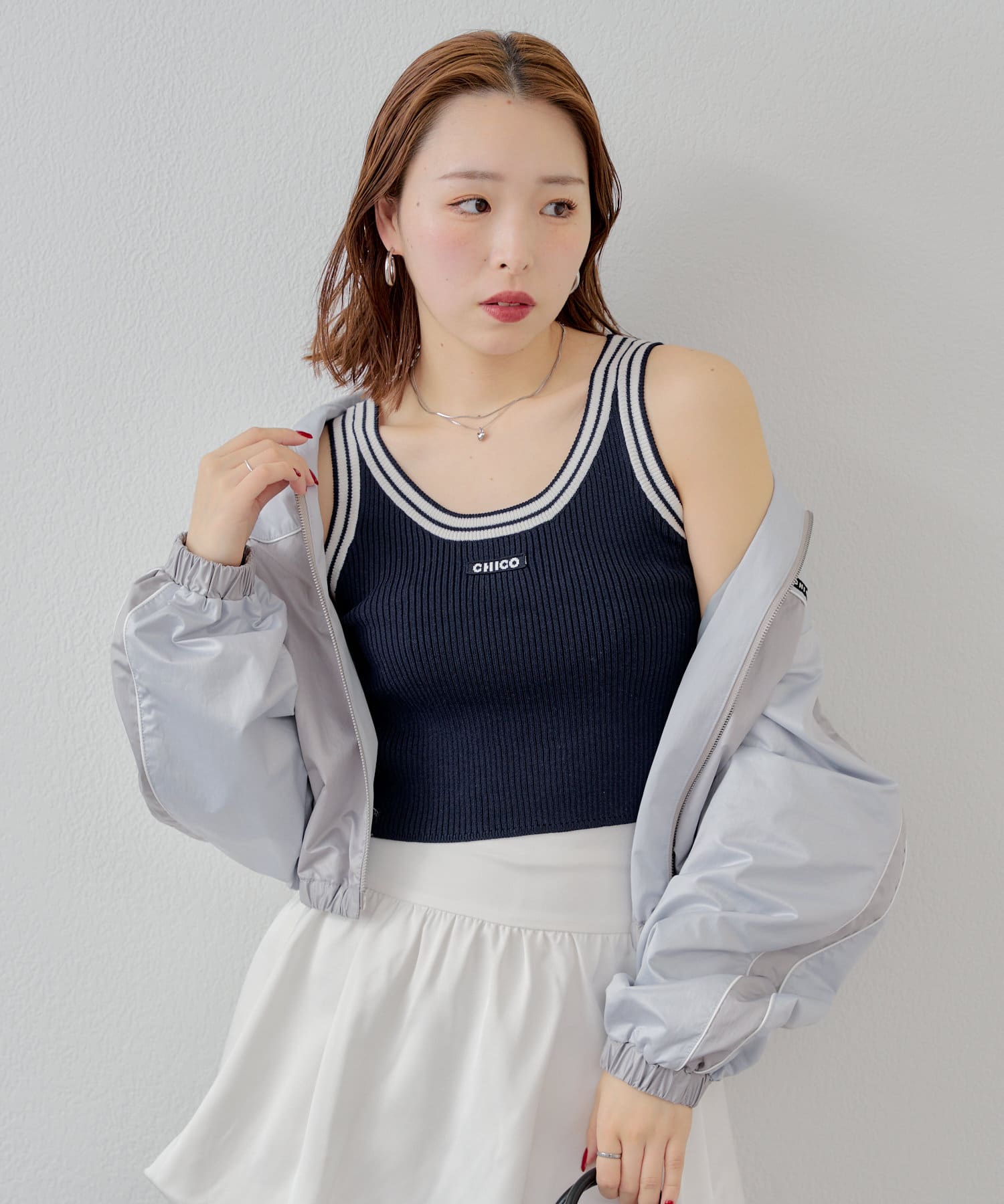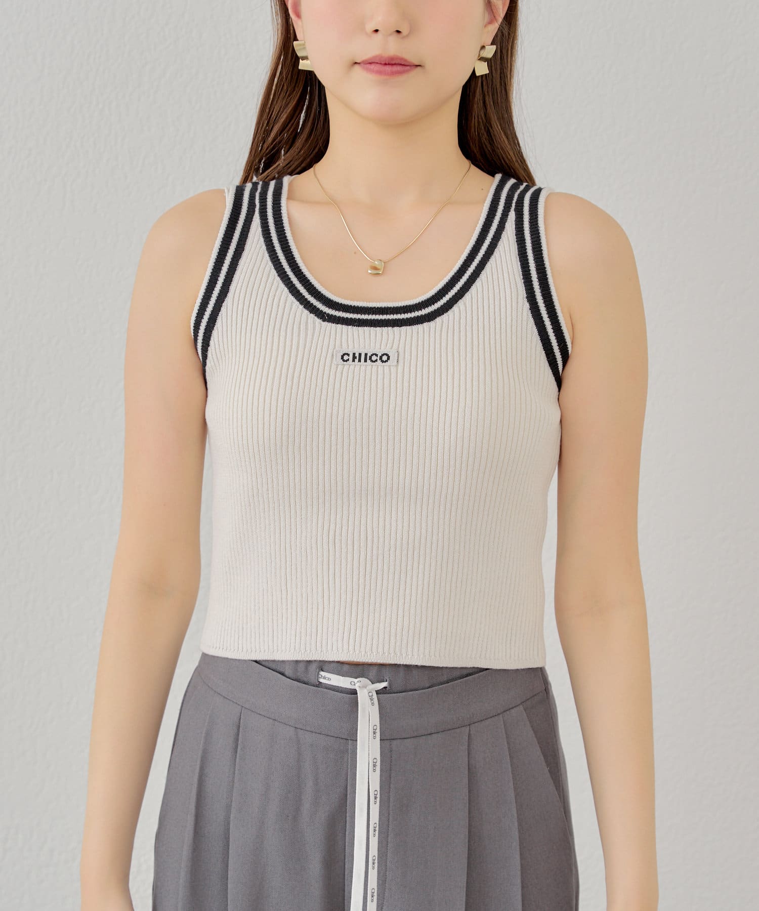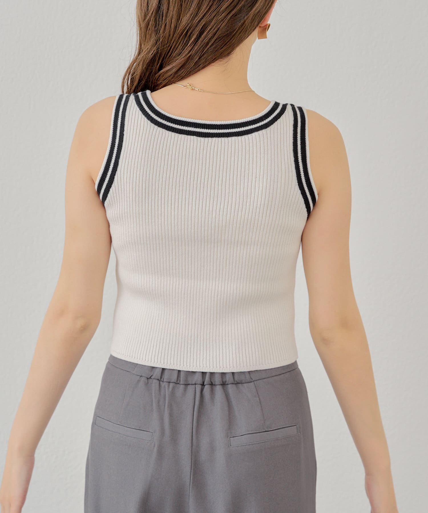 ・女性らしいニット素材とカジュアルなラインデザインがMIXしていることで1枚で着映えするタンクトップに仕上がっております。