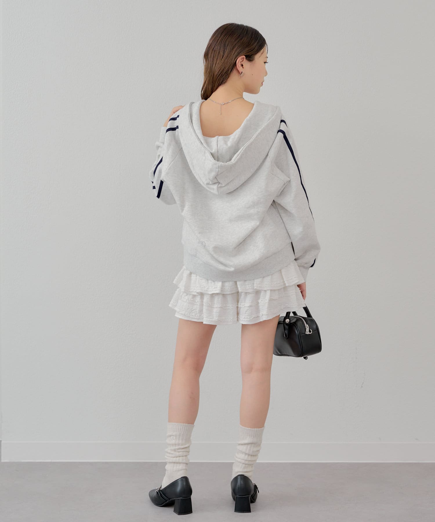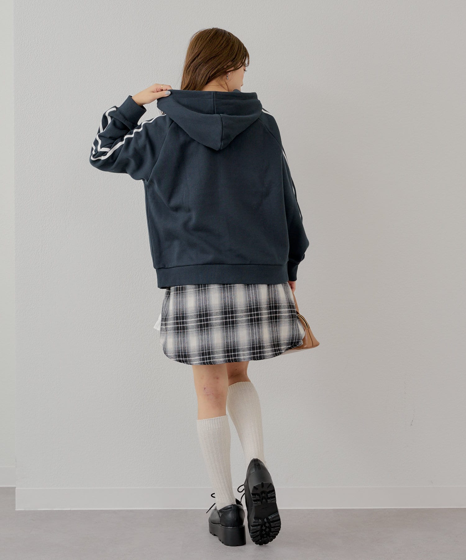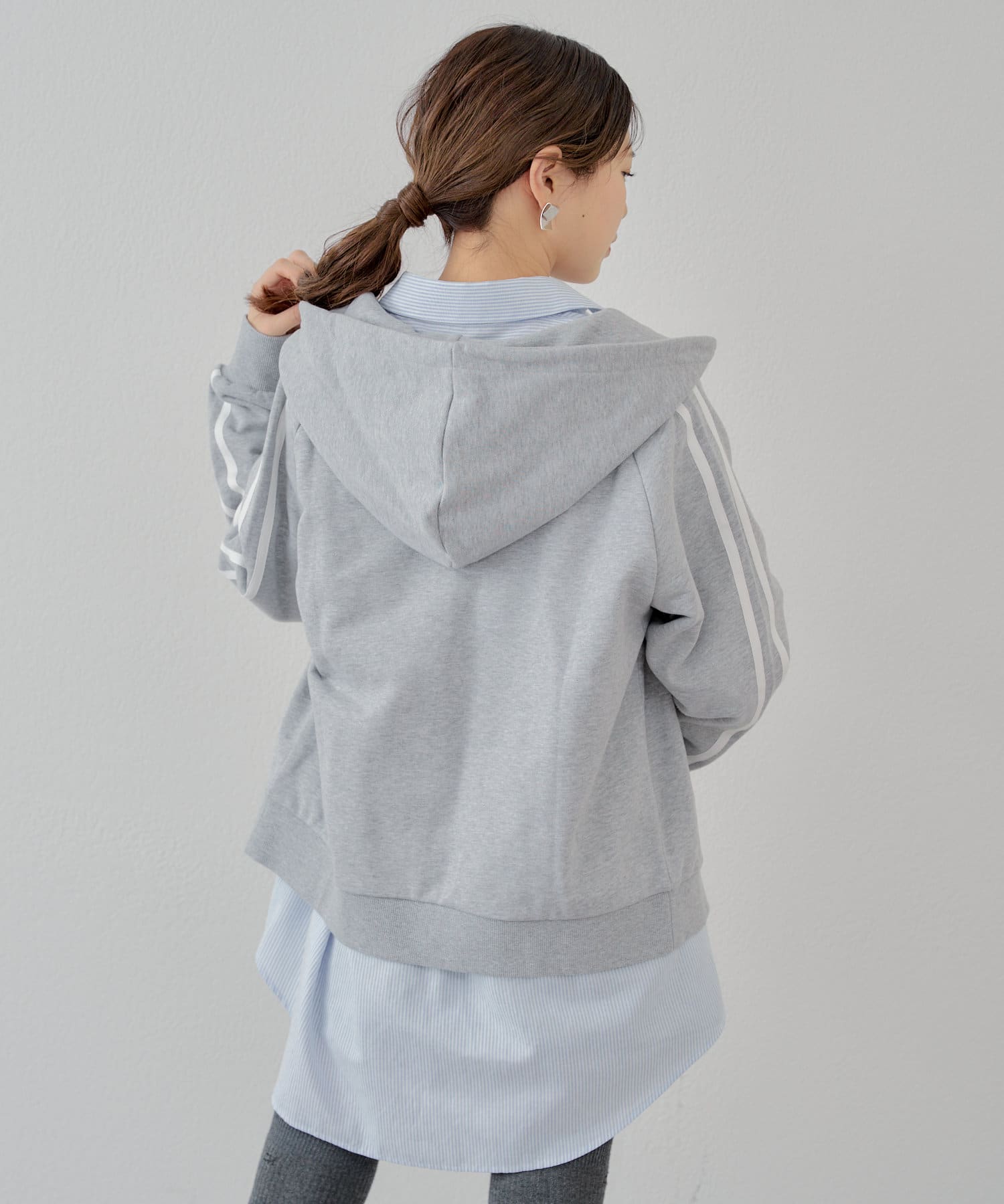 ・フードをアウターから出したレイヤードスタイルは今季のトレンドシルエットです。