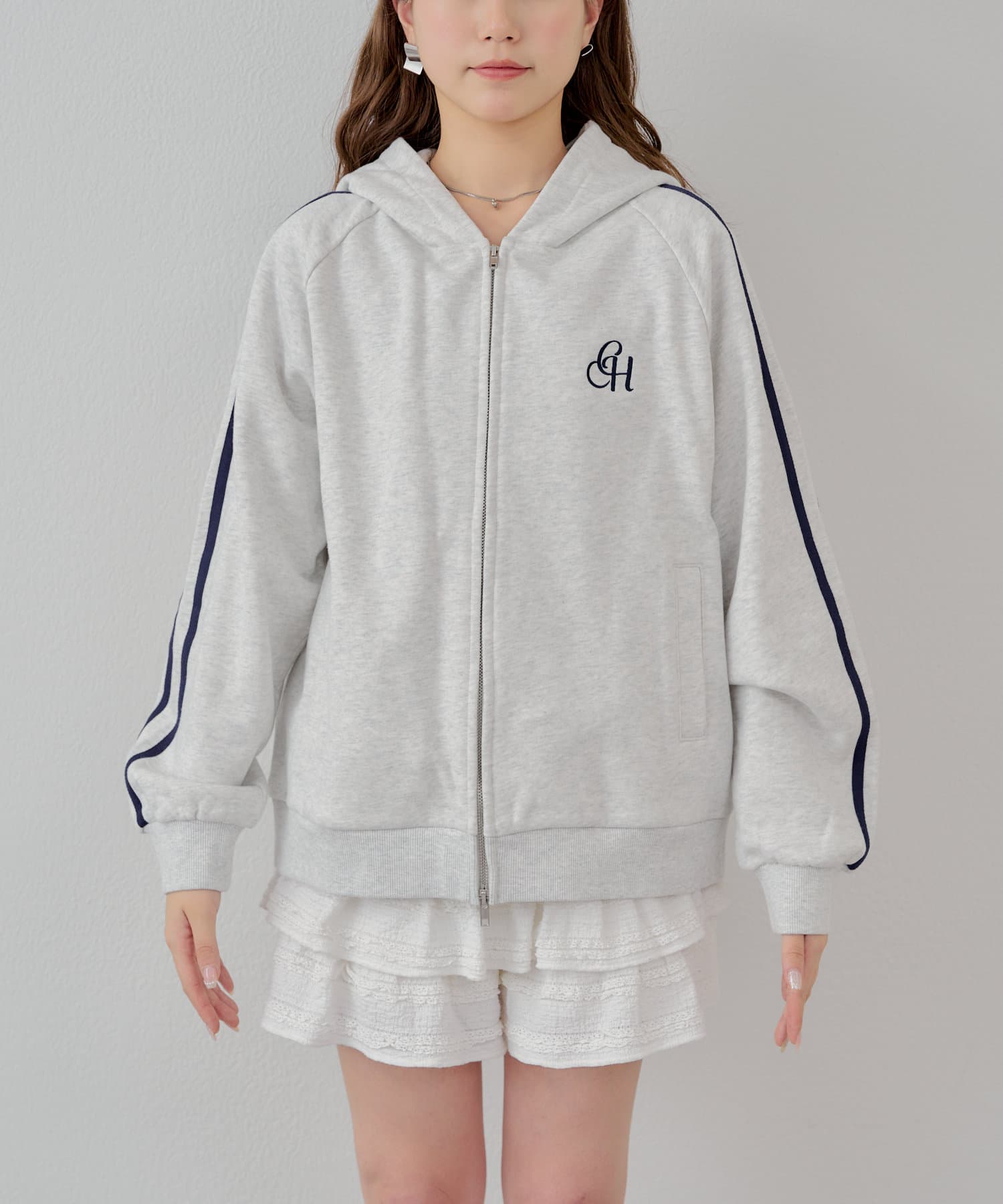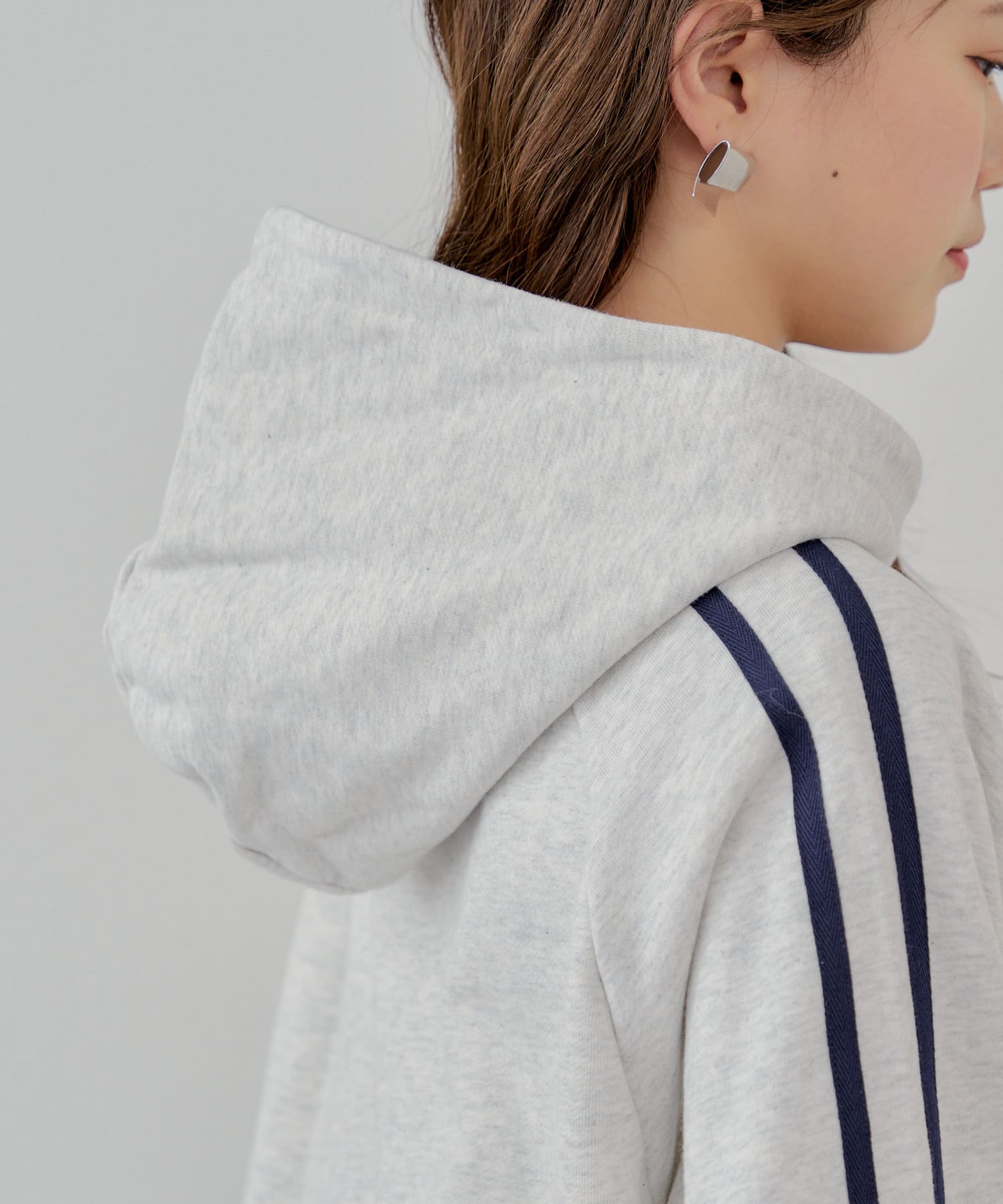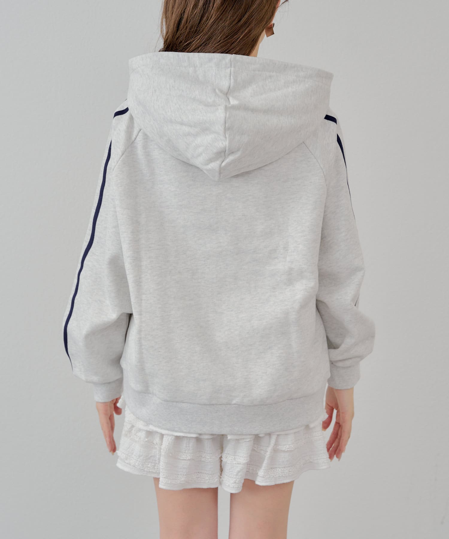 ラインデザインが目を惹くルーズなフードパーカー