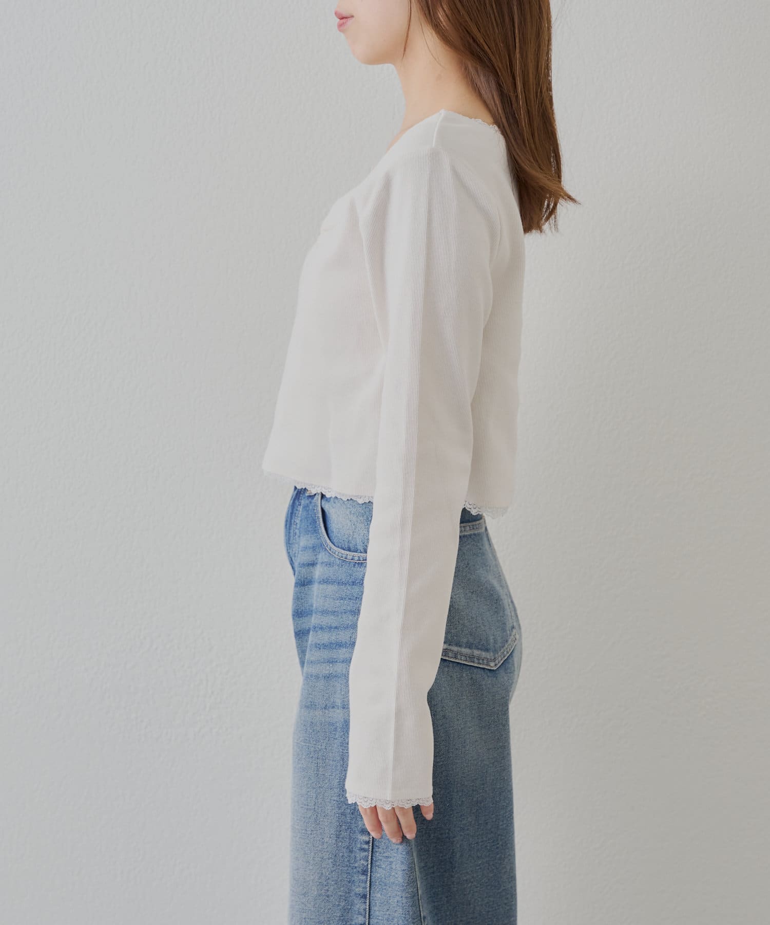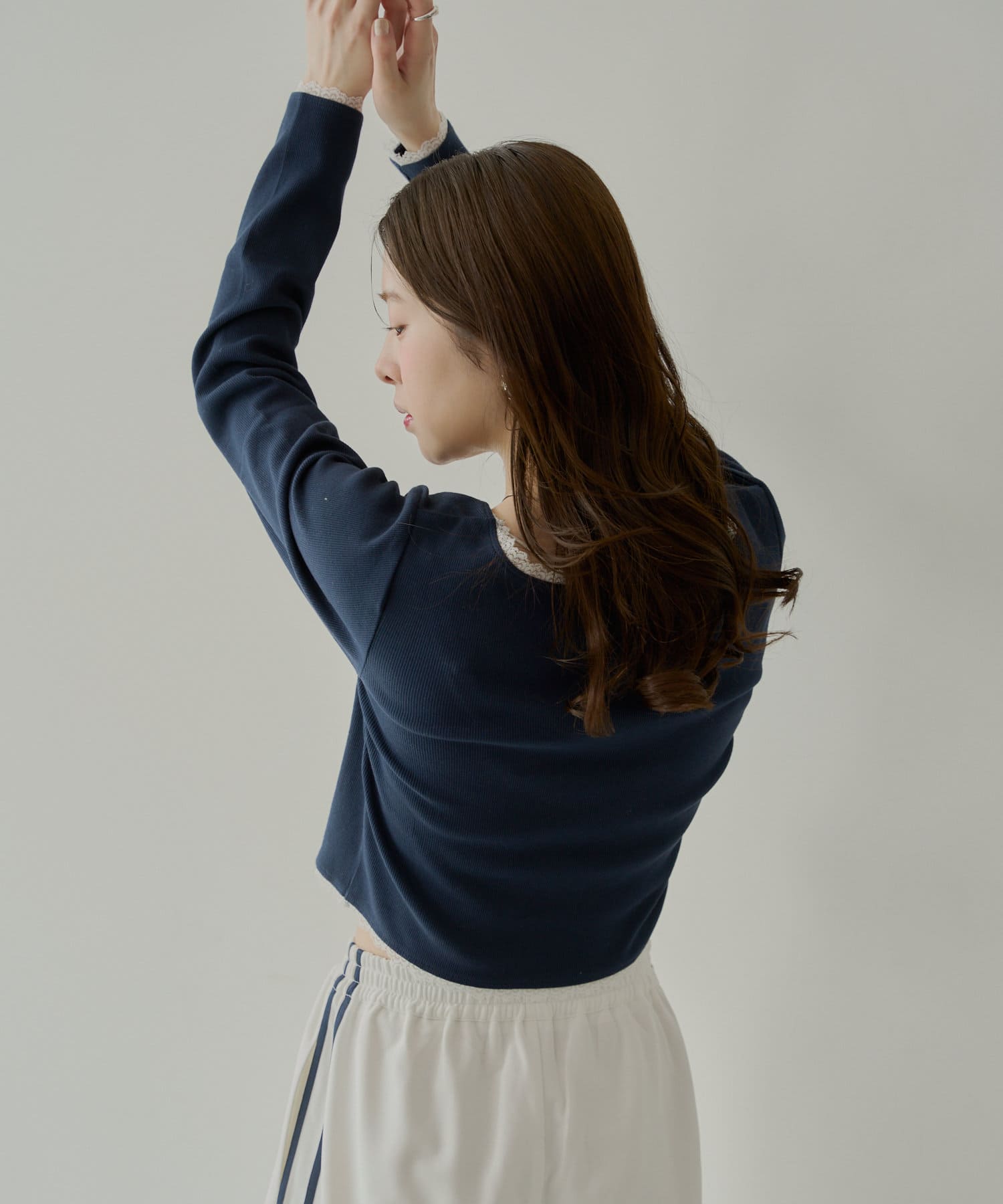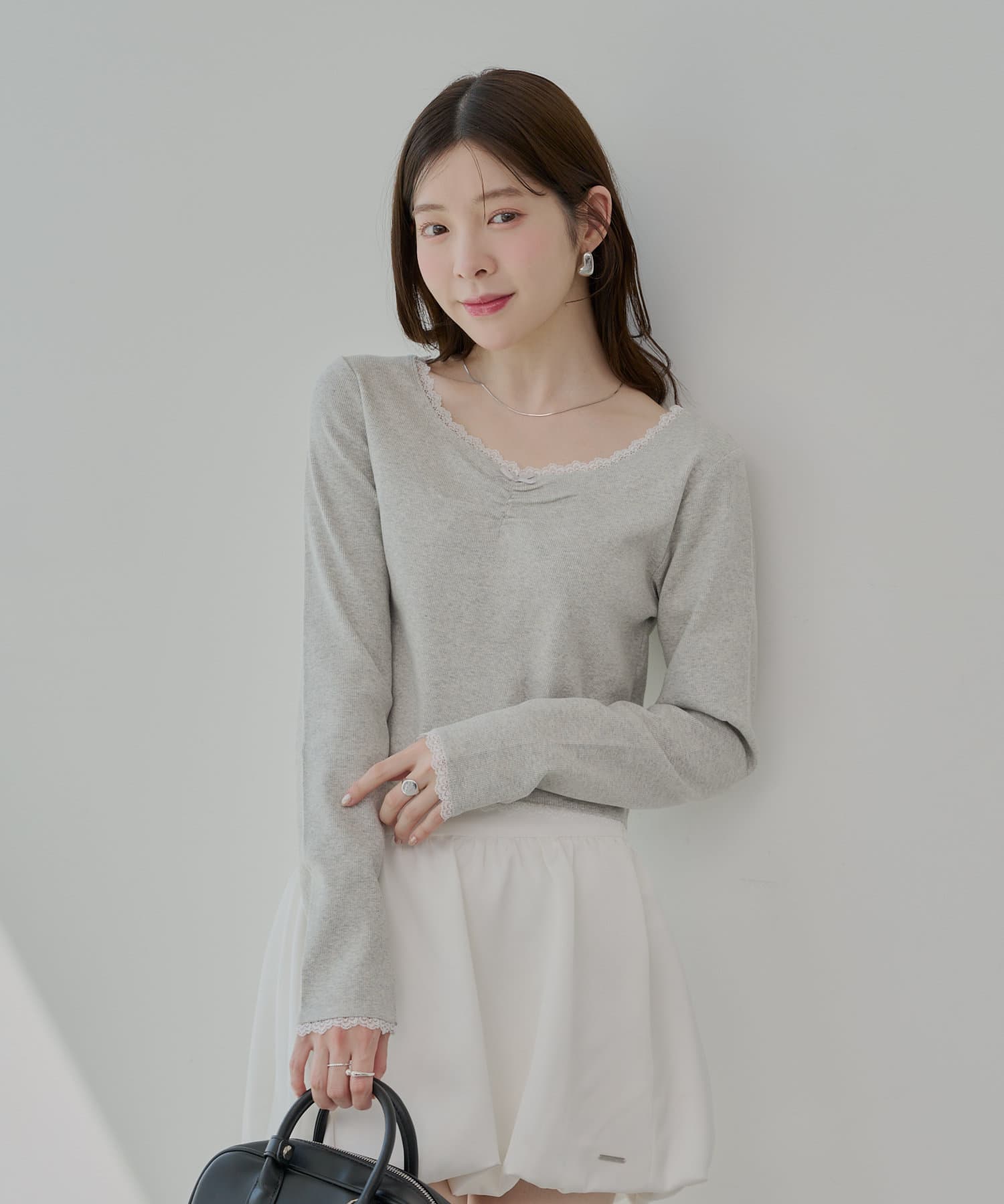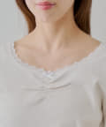・首元と袖口、裾にあしらわれた繊細なレースが上品でフェミニンな印象をプラスしてくれます。