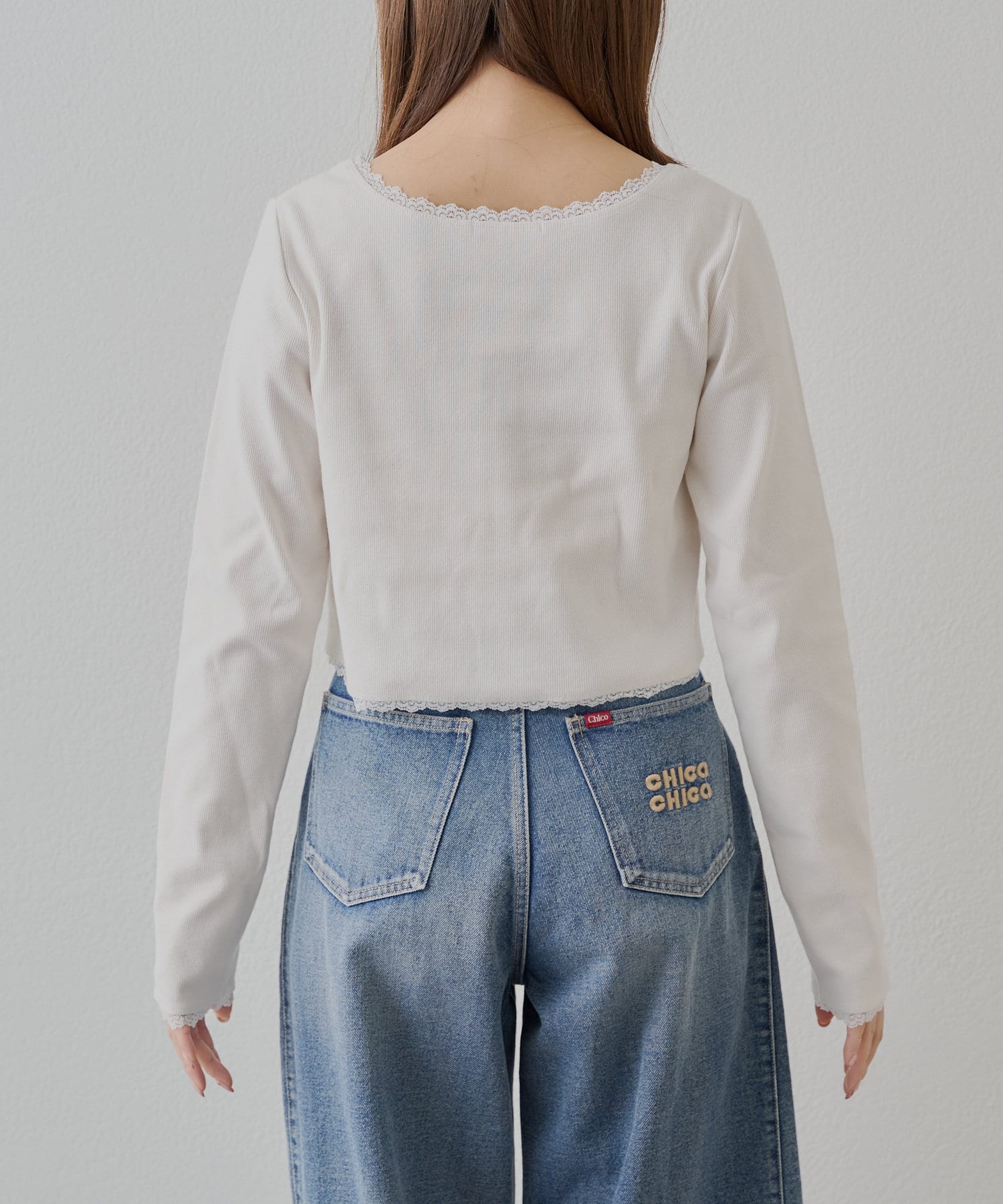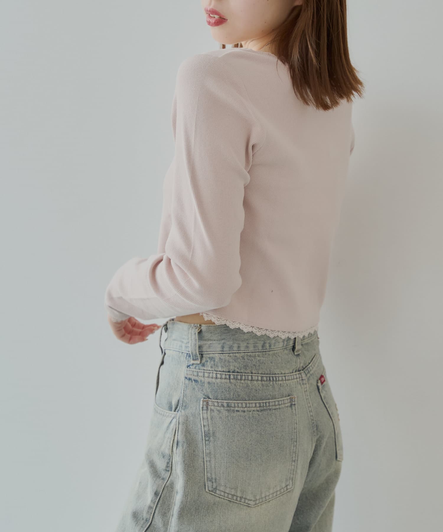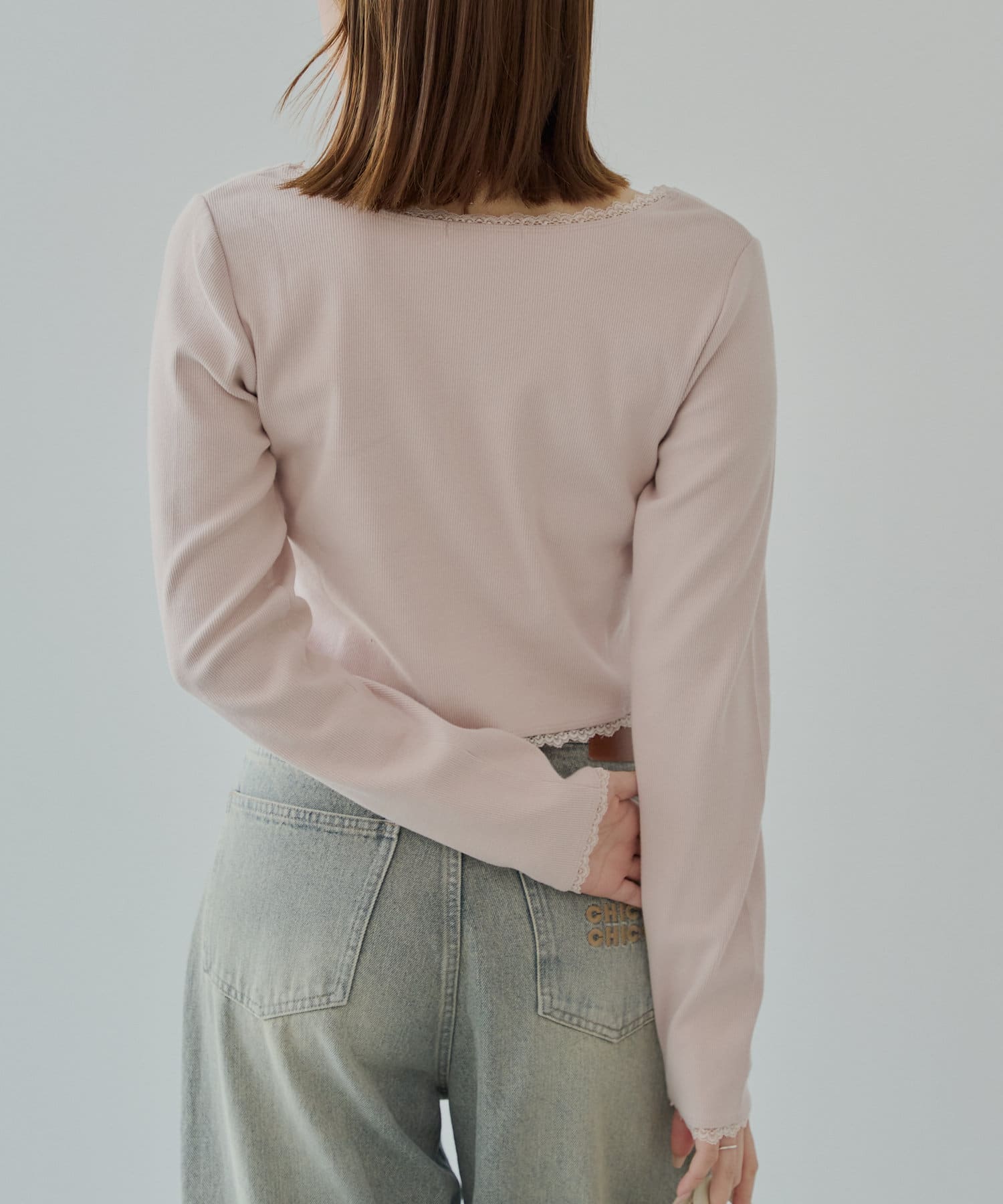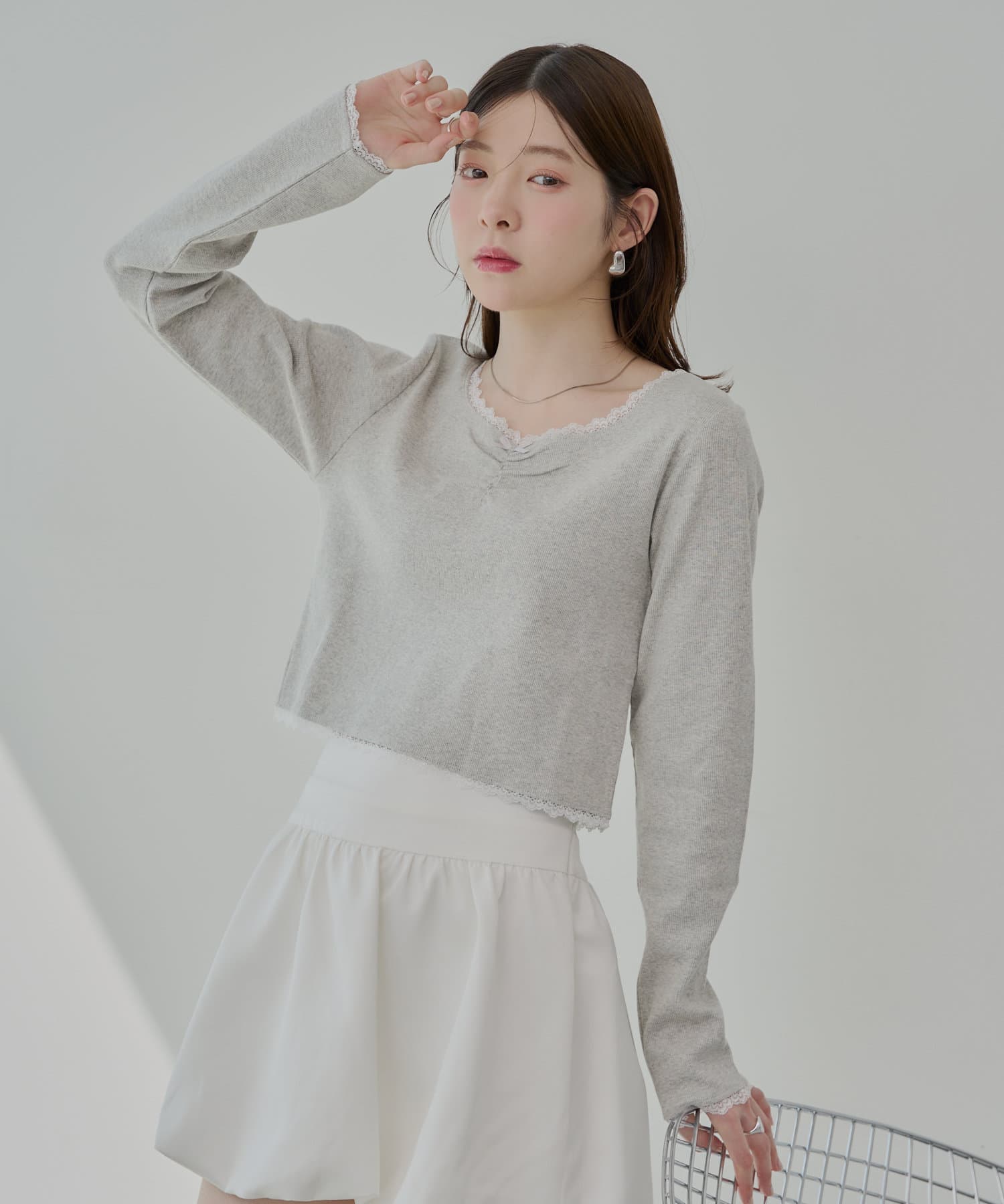 ・首元と袖口、裾にあしらわれた繊細なレースが上品でフェミニンな印象をプラスしてくれます。