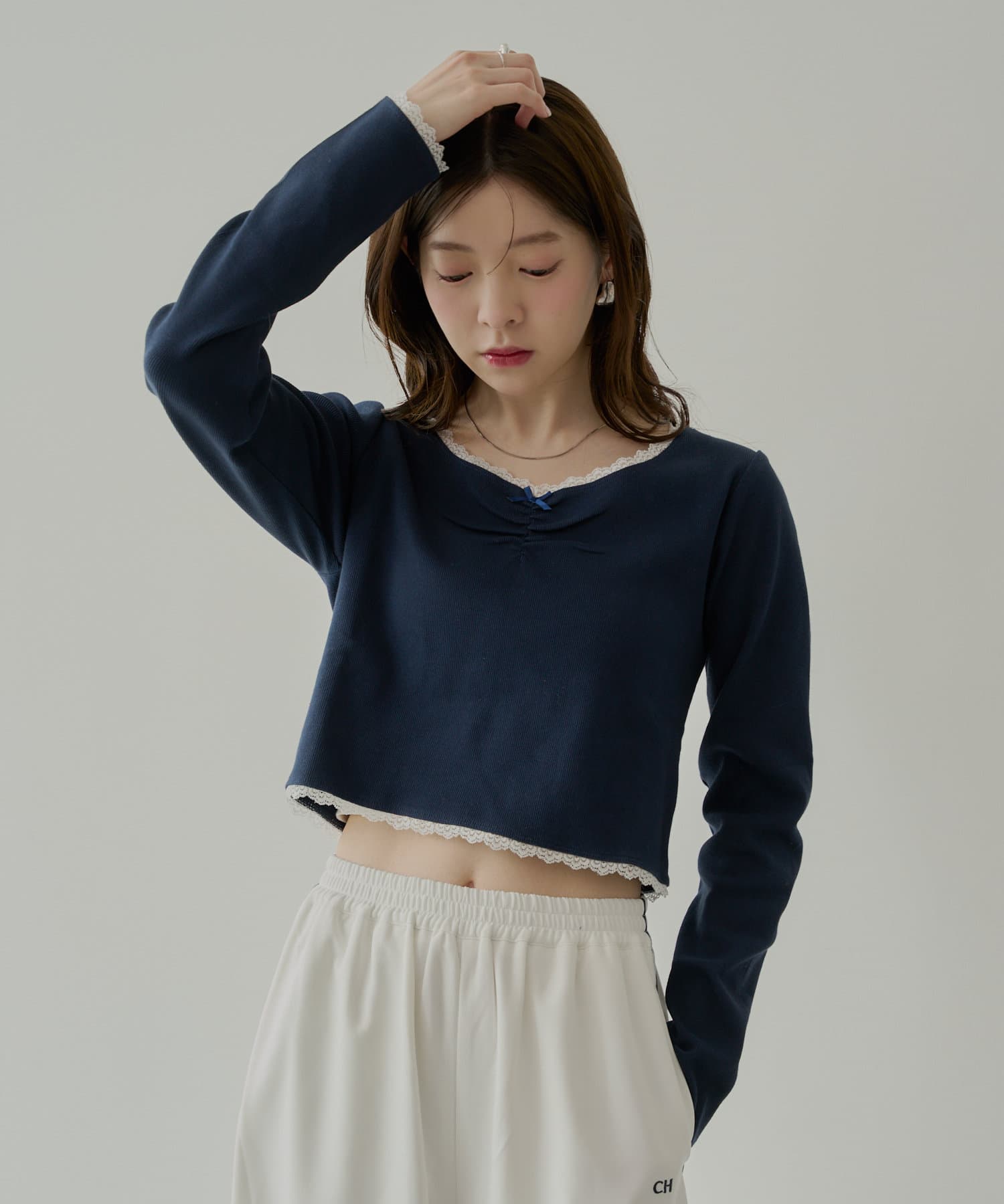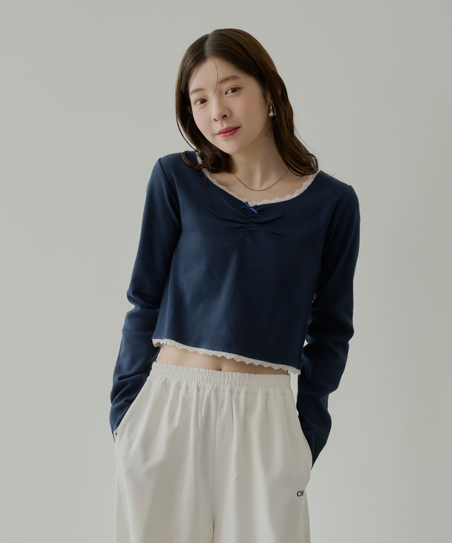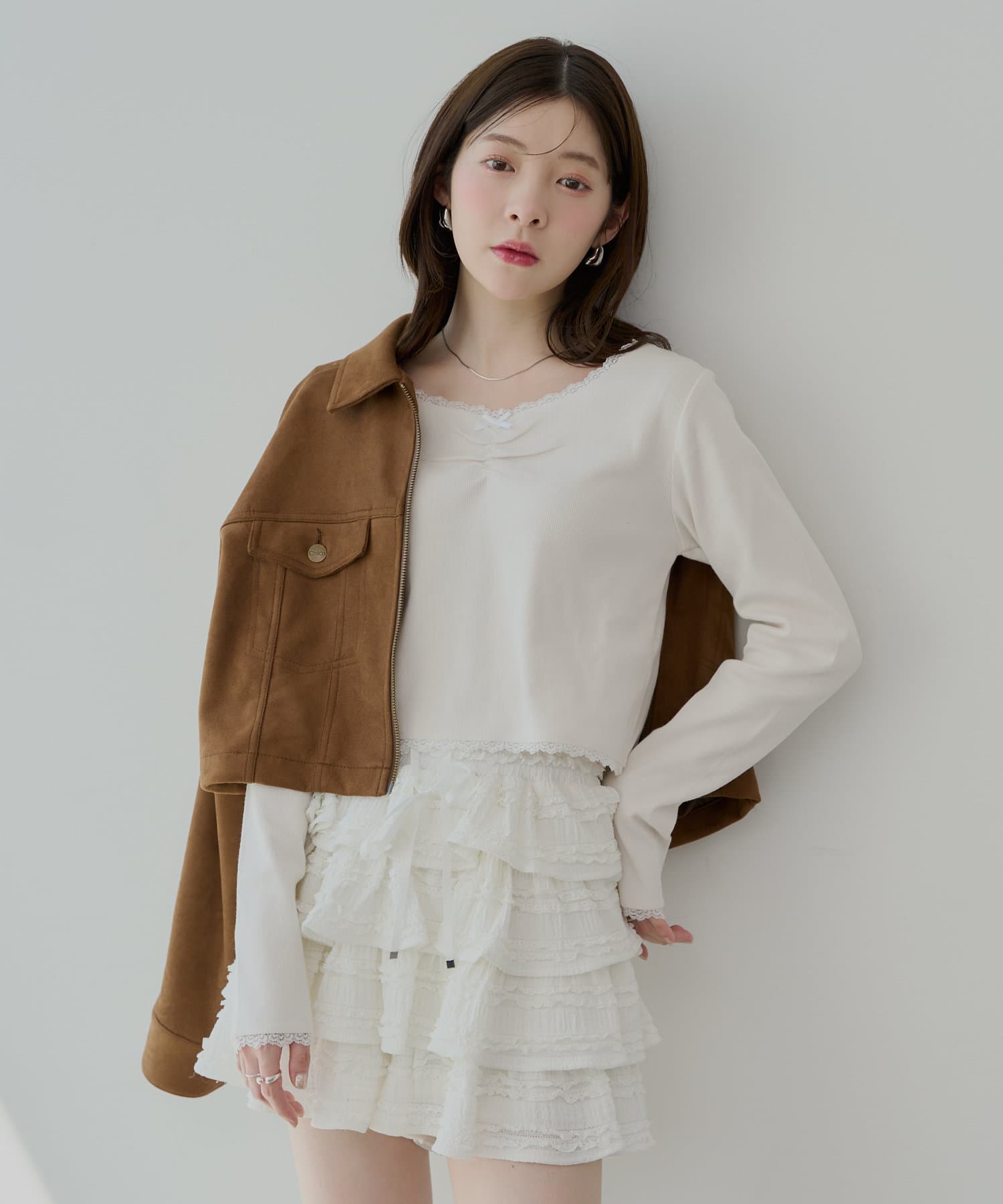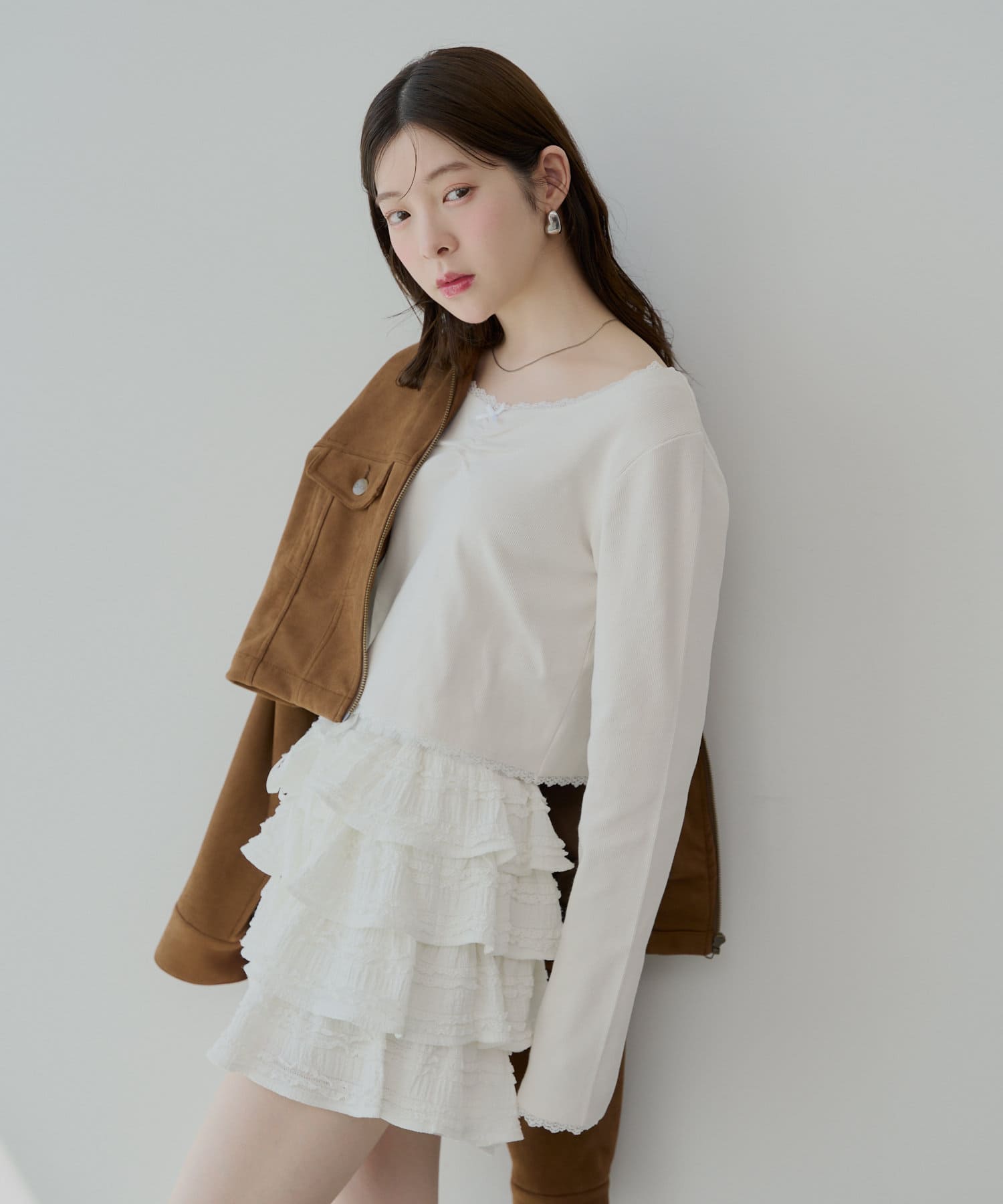 ・胸元の小さなリボンは、さりげないアクセントとなり、着こなしに華やかさを添えてくれます。