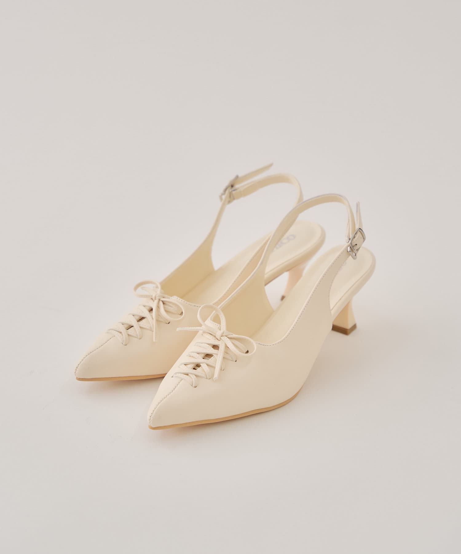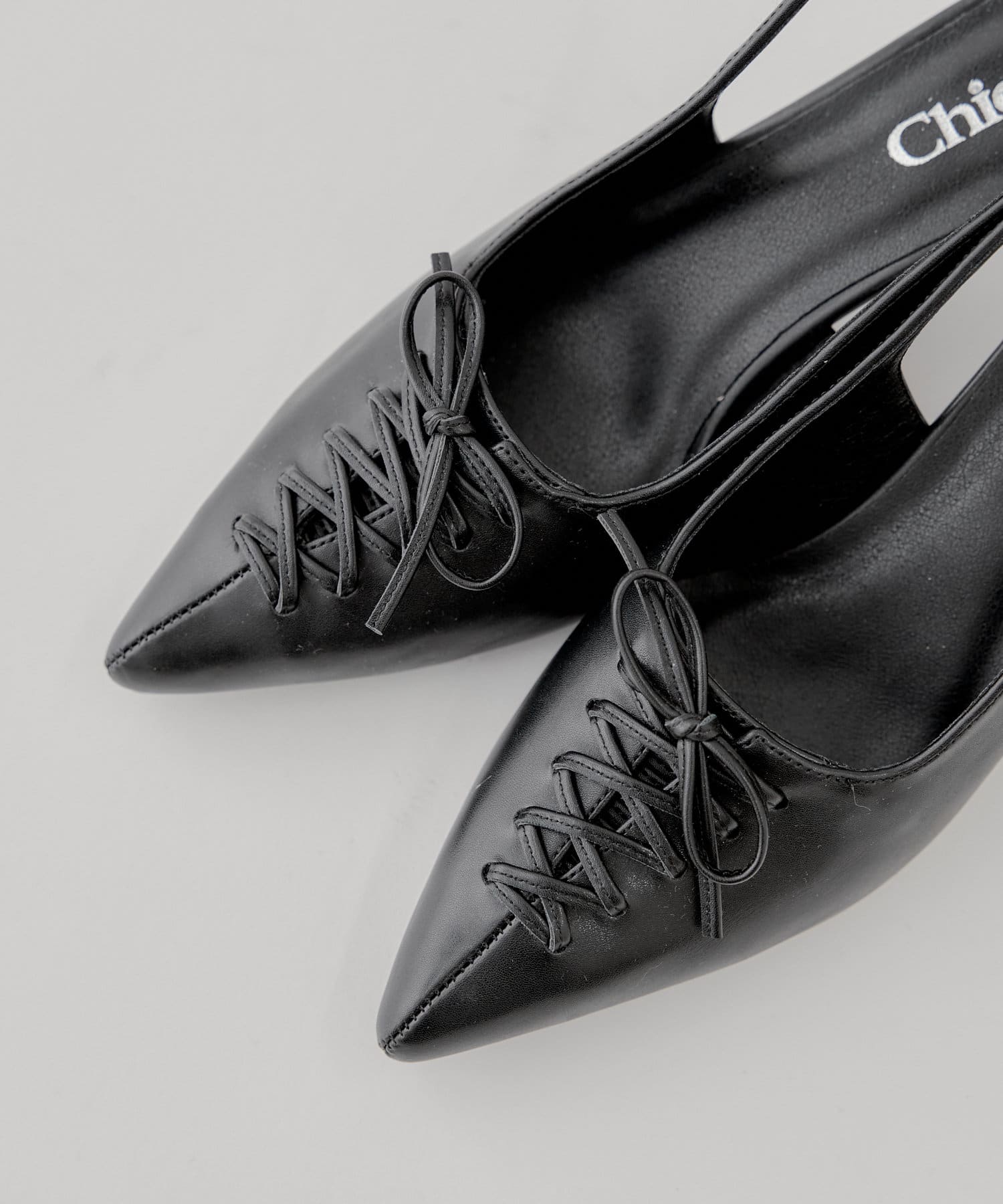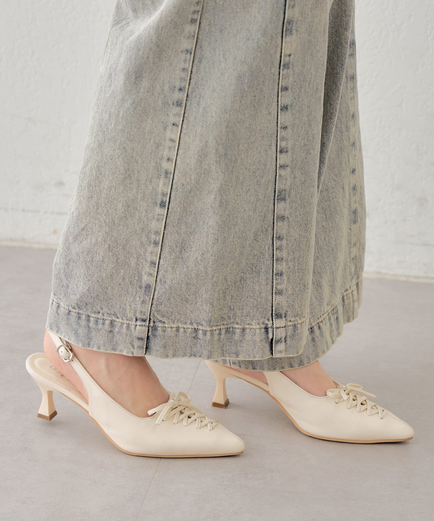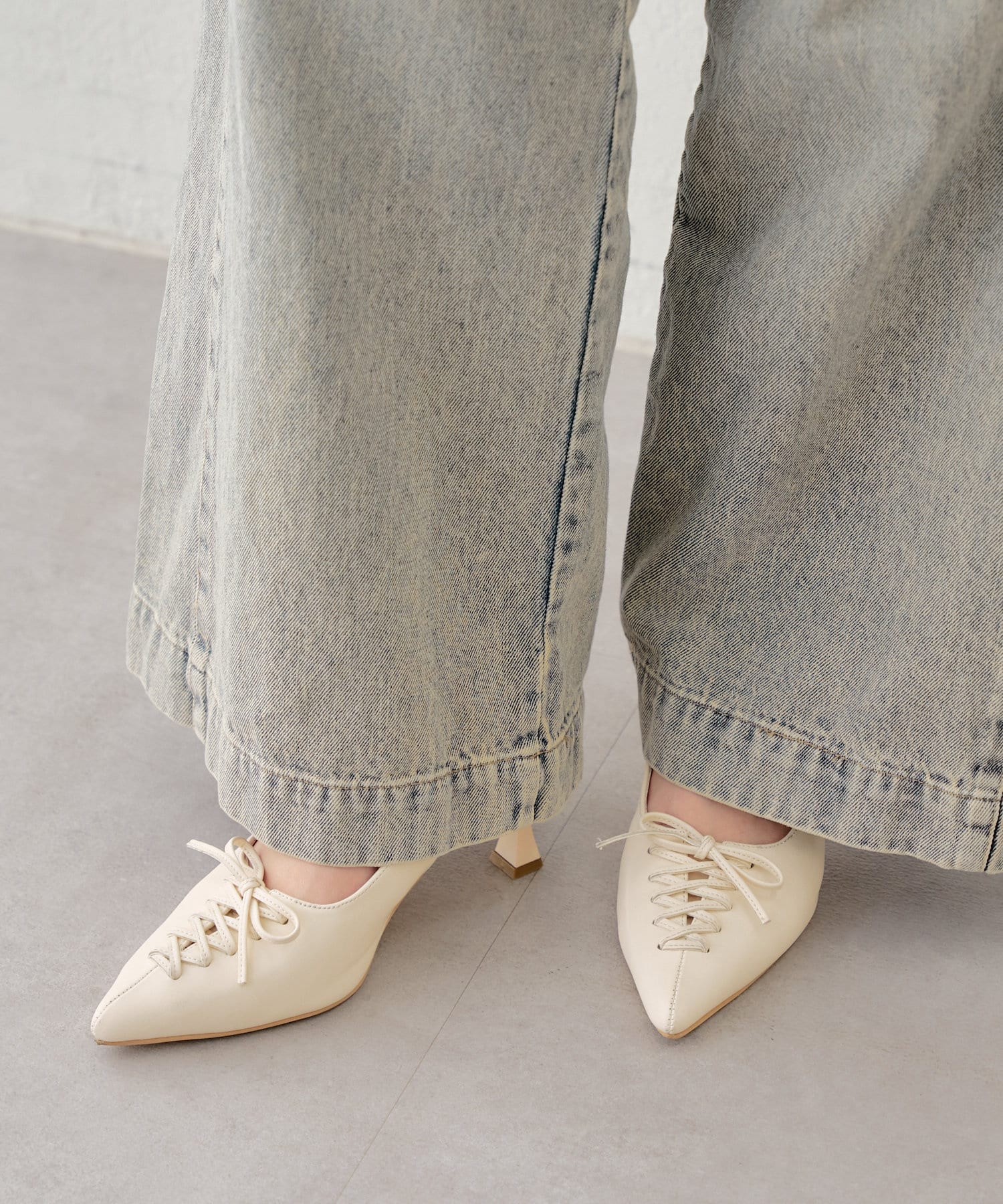 レースアップデザインが目を惹くポインテッドトゥミュール