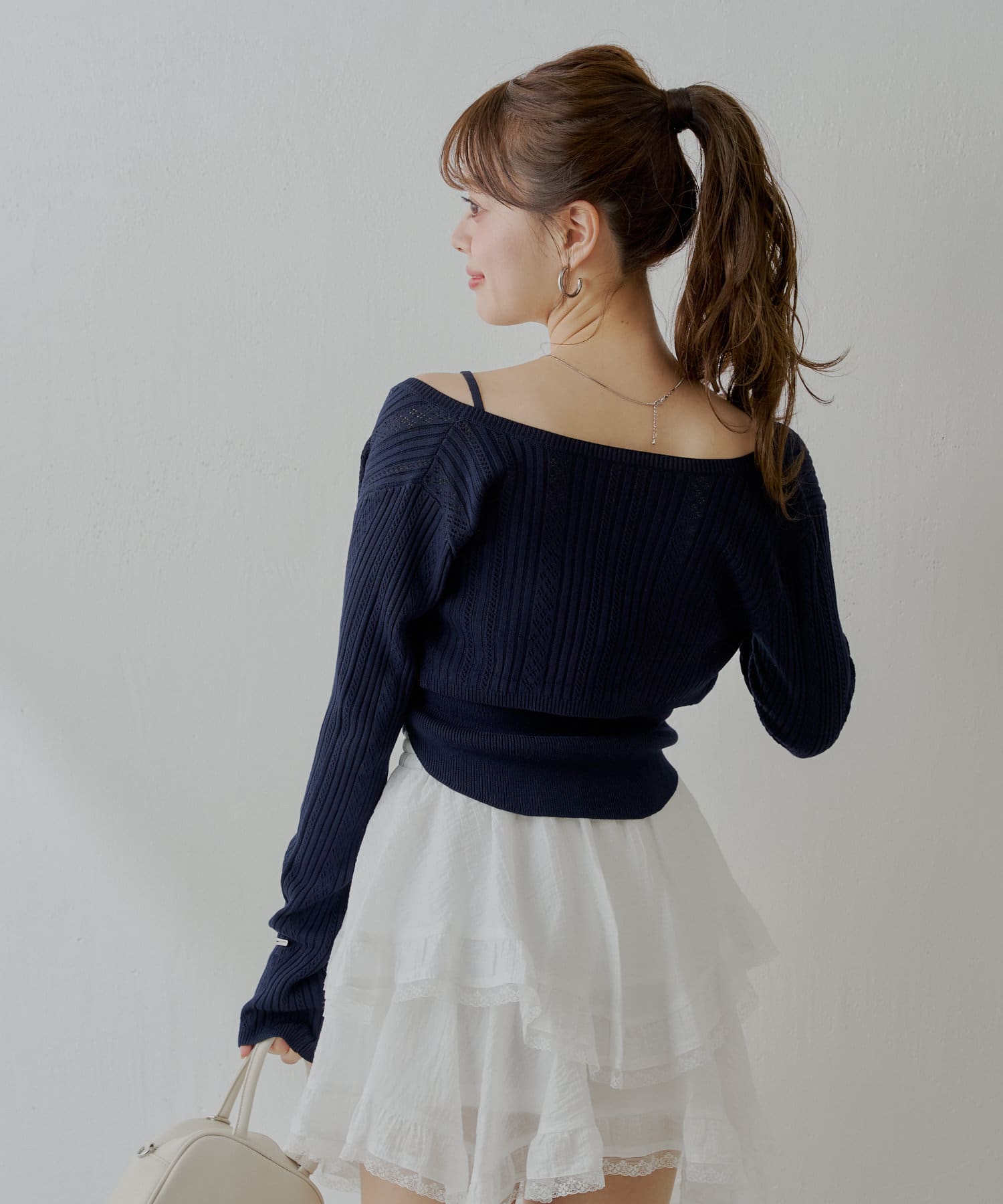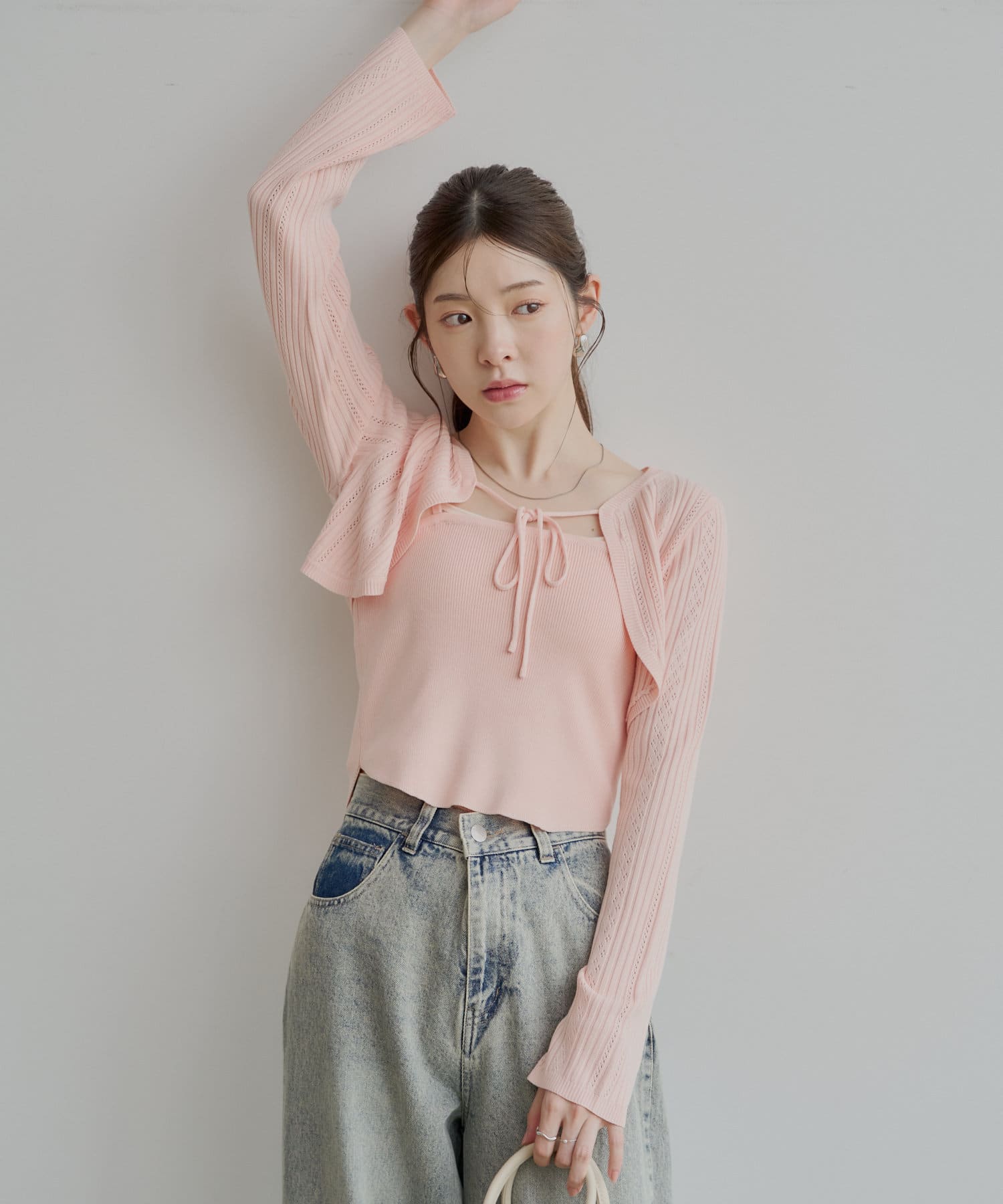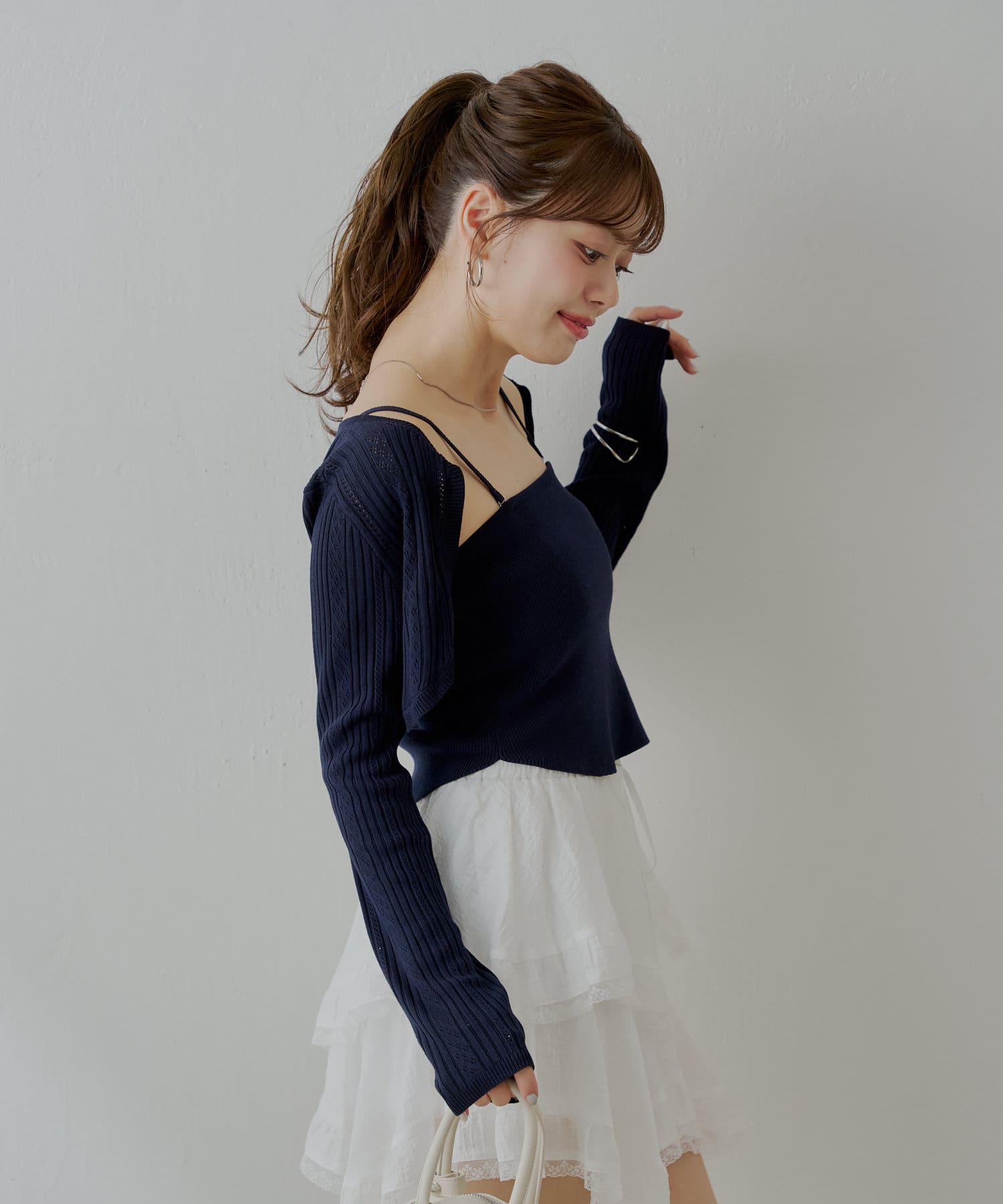 ・繊細な透かし編みが施されたボレロは、女性らしさを演出してくれます。