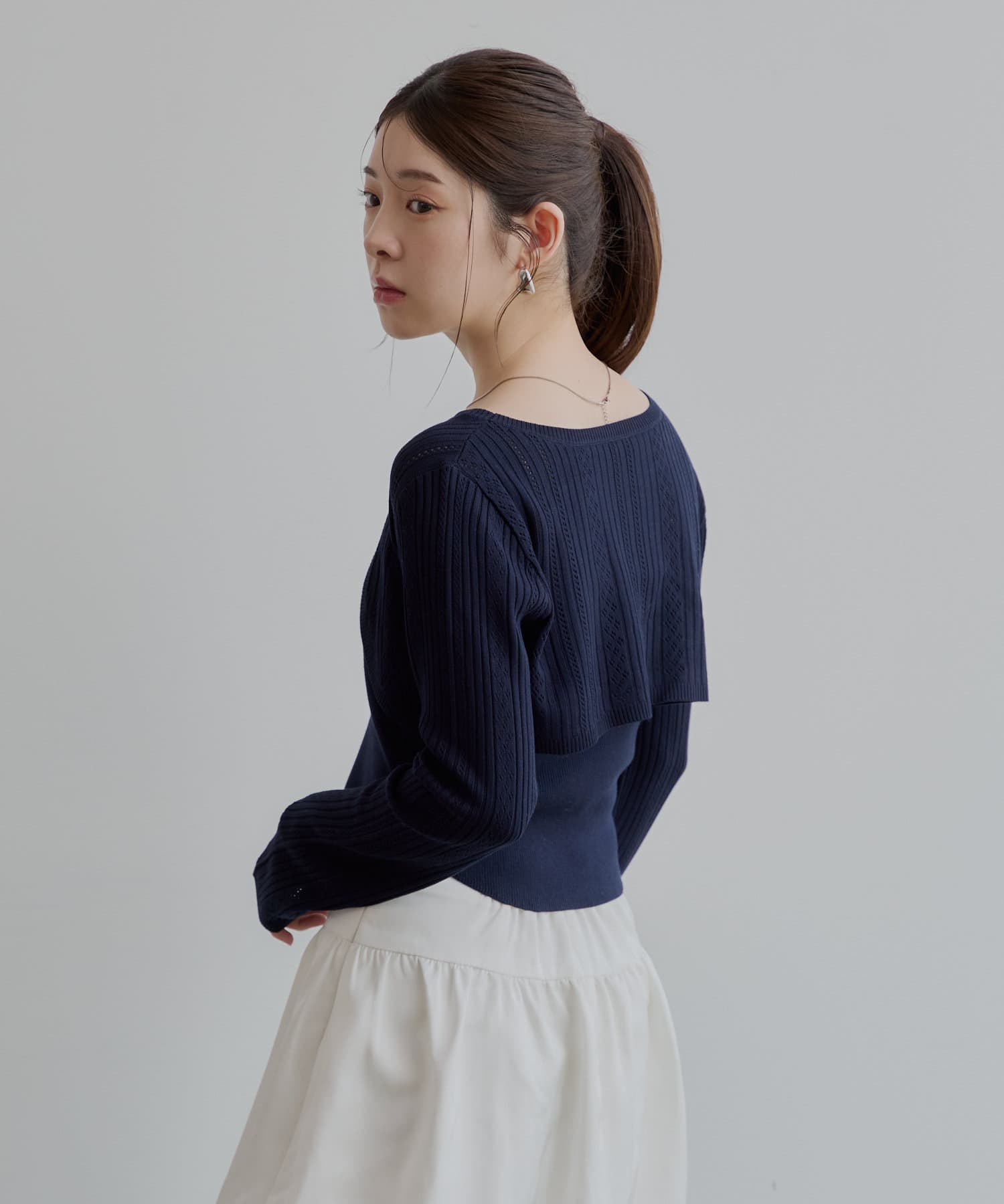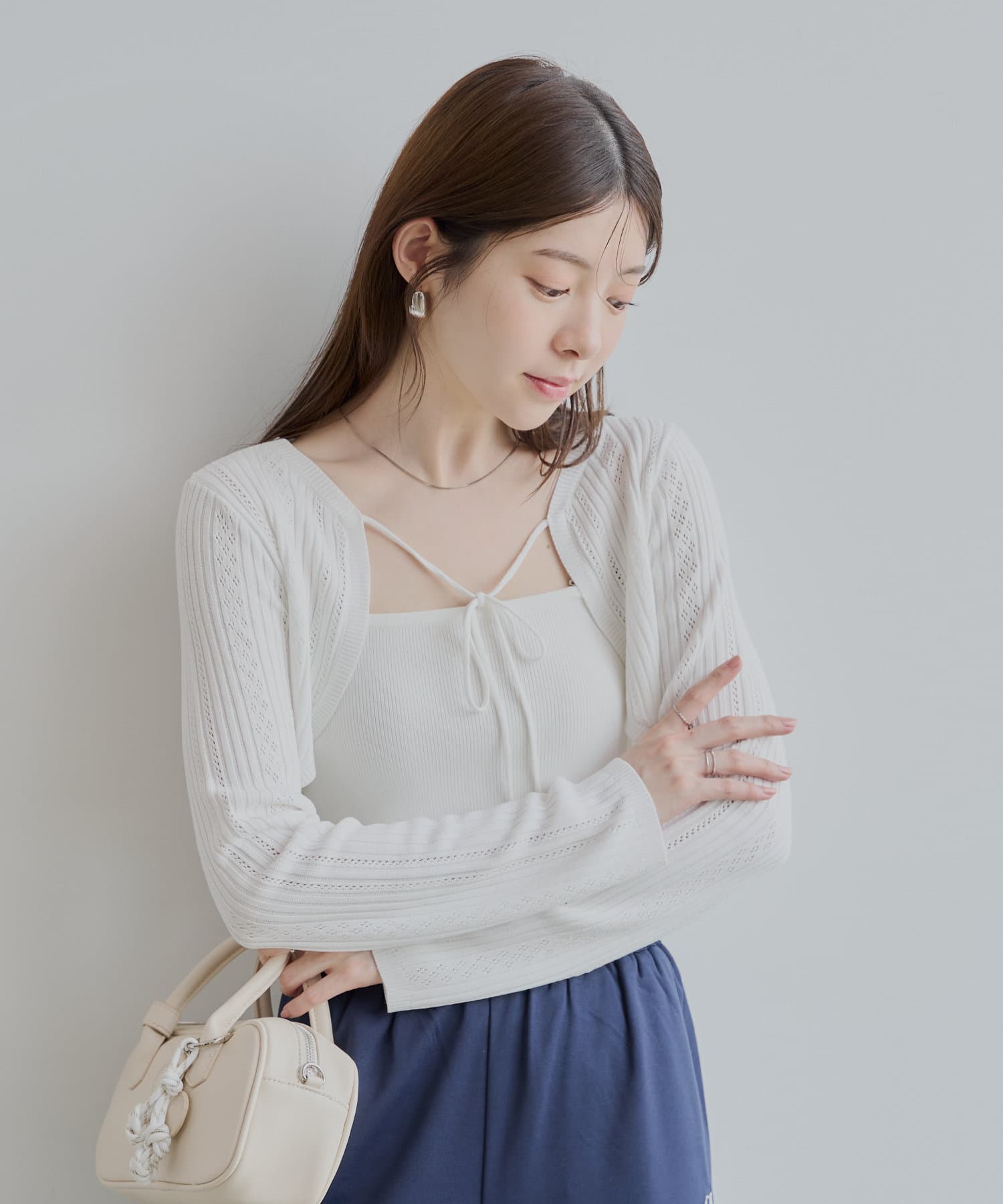 ・繊細な透かし編みが施されたボレロは、女性らしさを演出してくれます。
