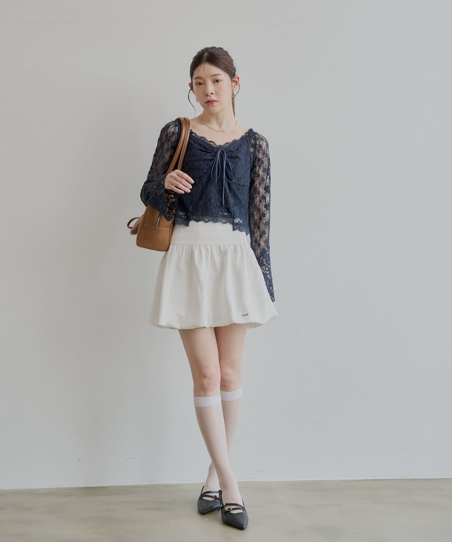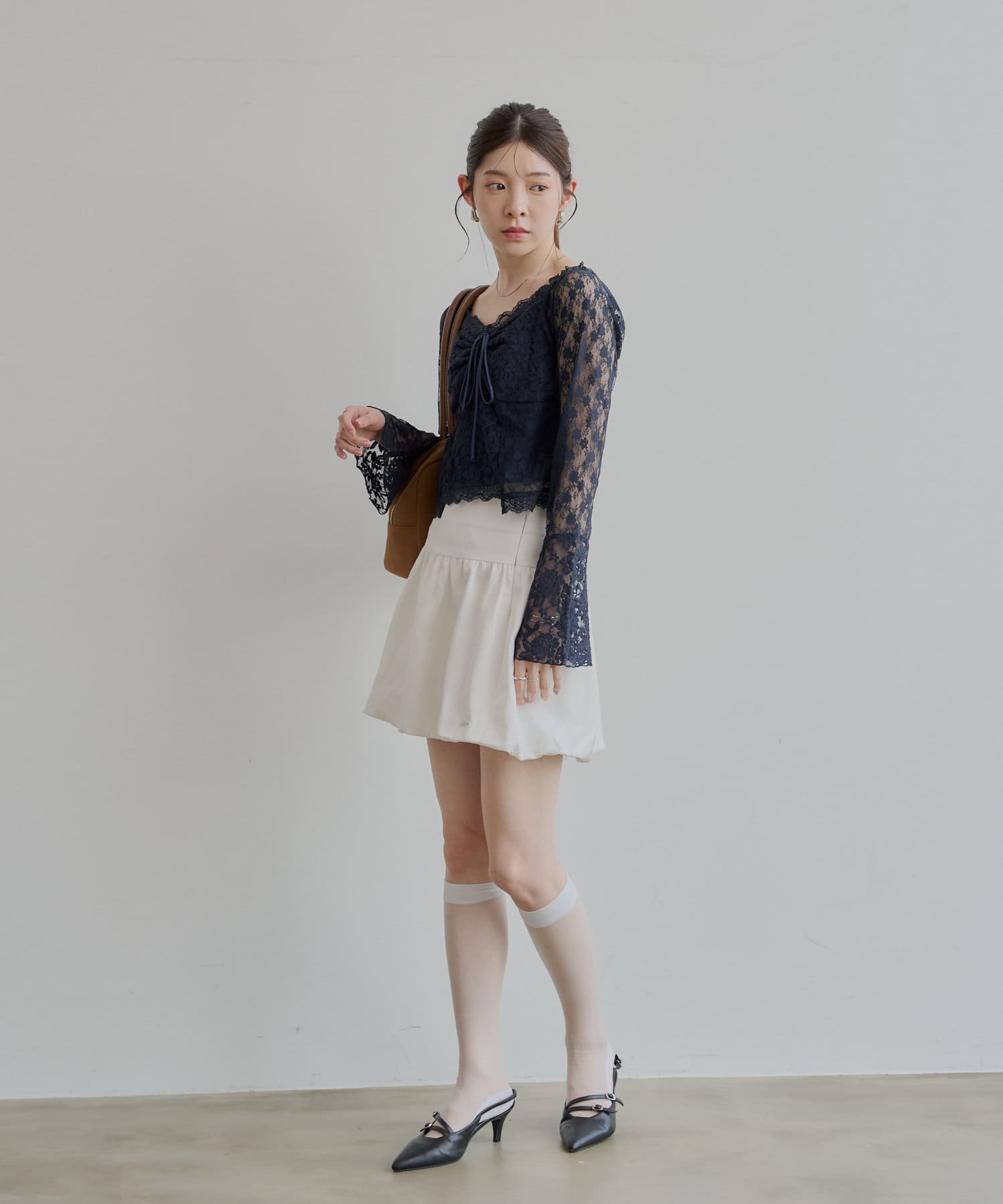 ・胸元にさりげなく施されたシャーリングとリボンが、女性らしいアクセントに◎