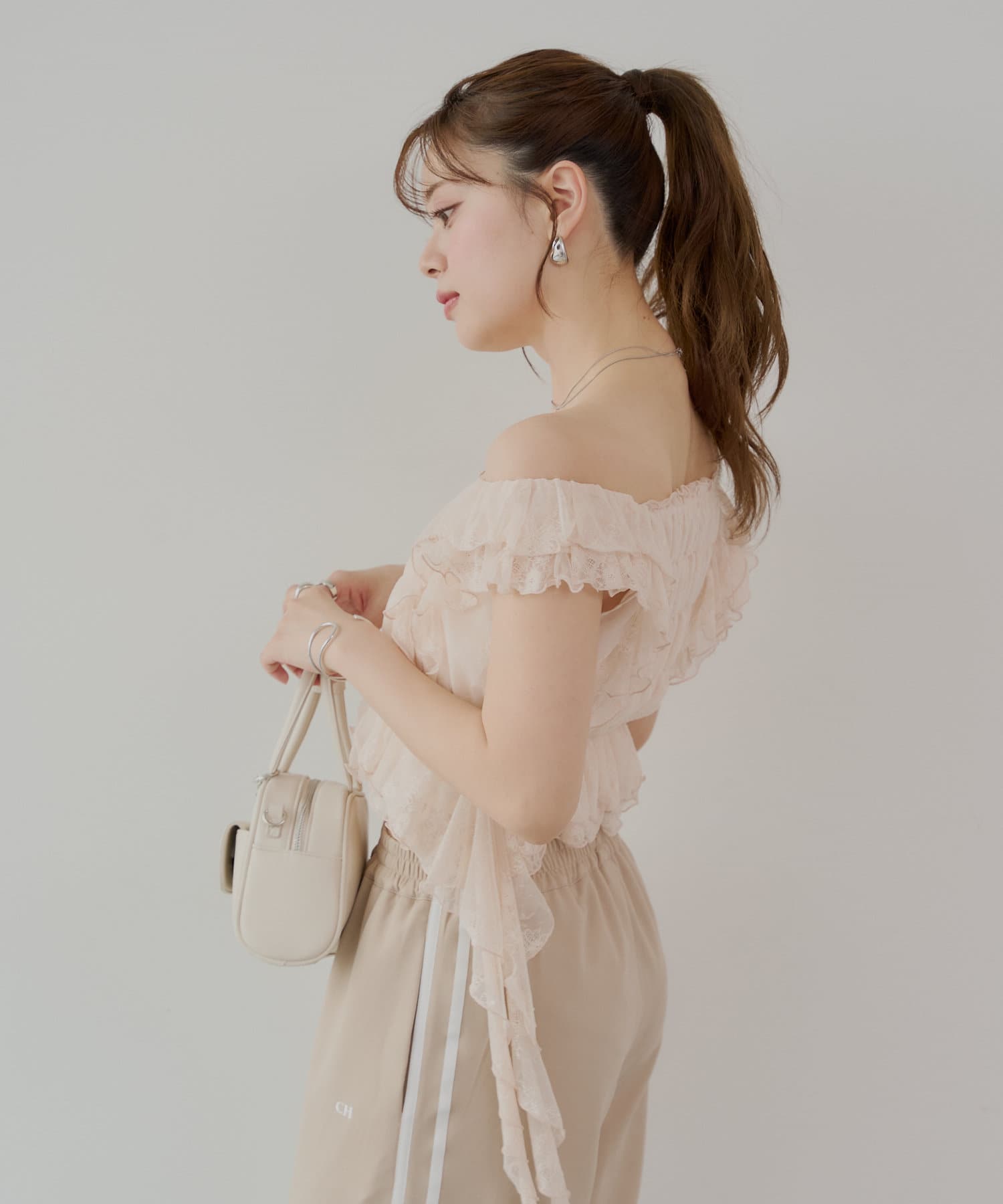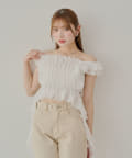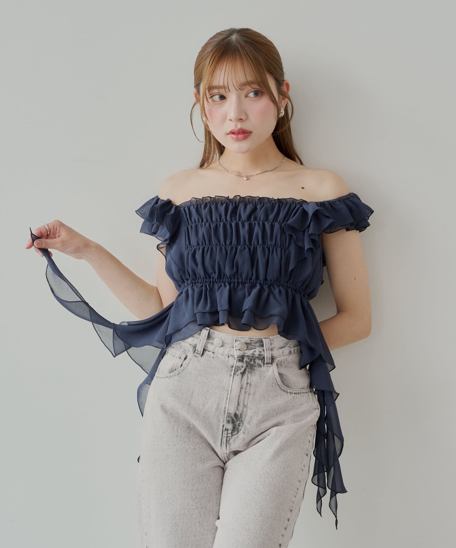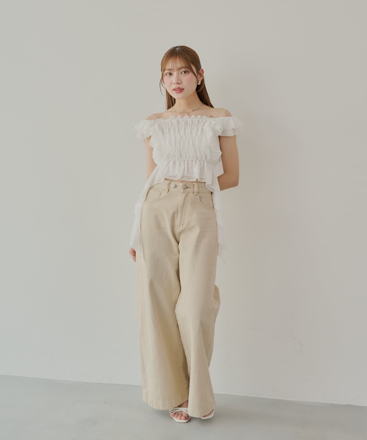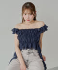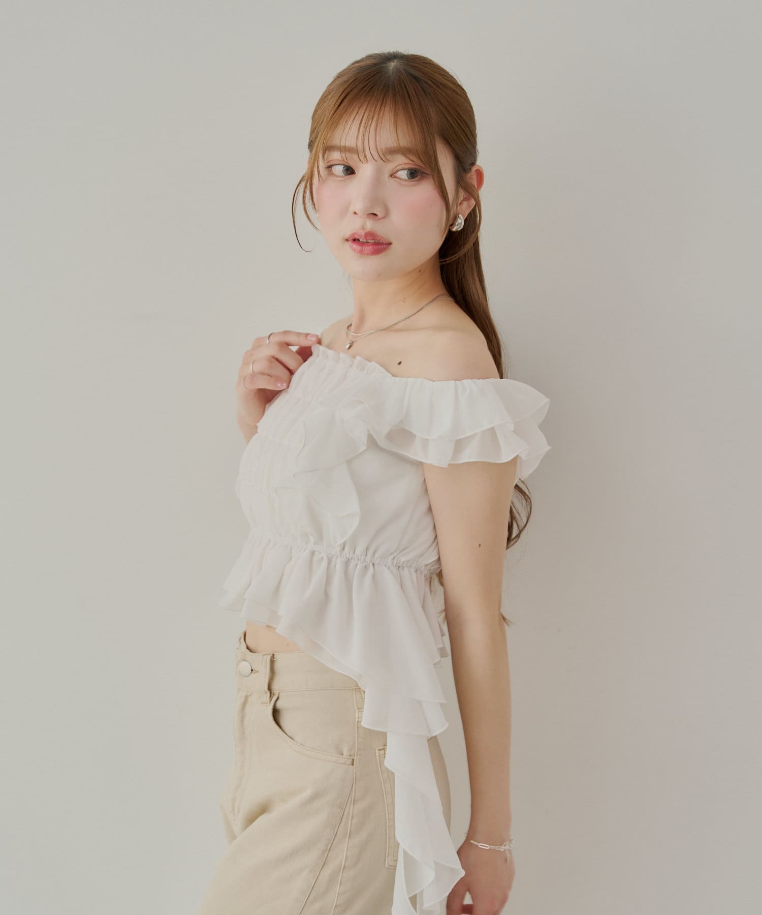 ・オフショルにすると、女性らしい鎖骨を美しく魅せ、首元をすっきりとした印象に。