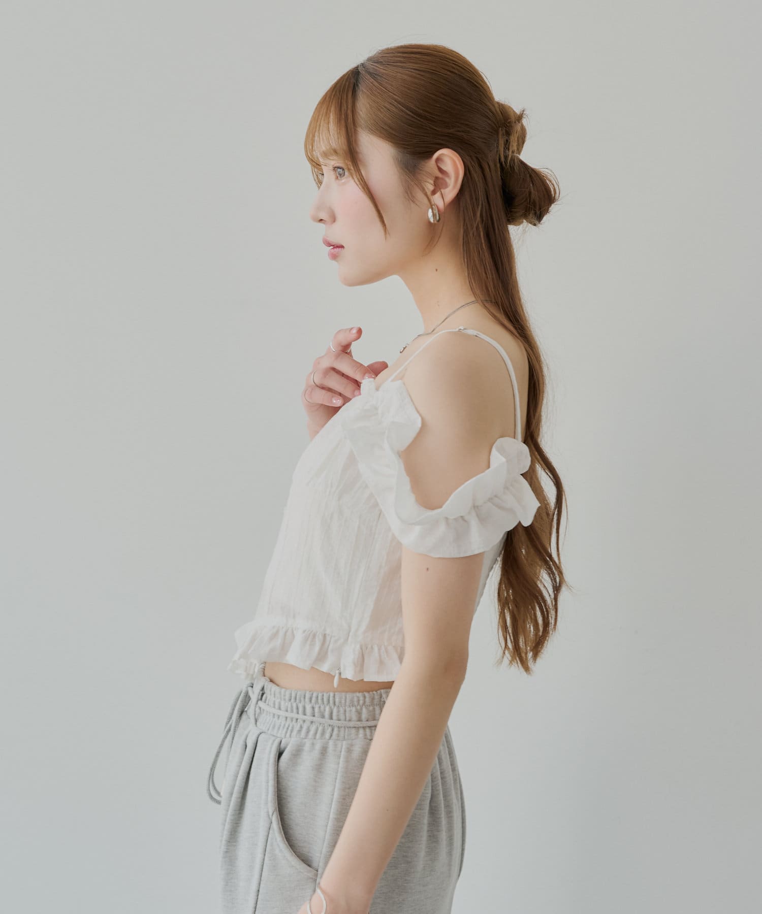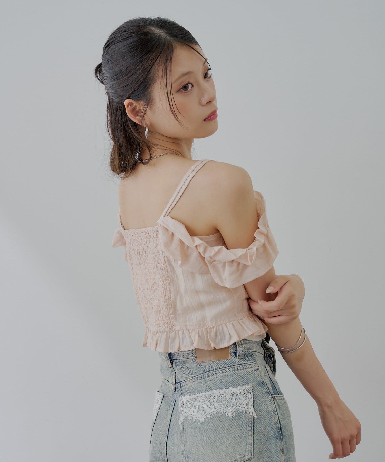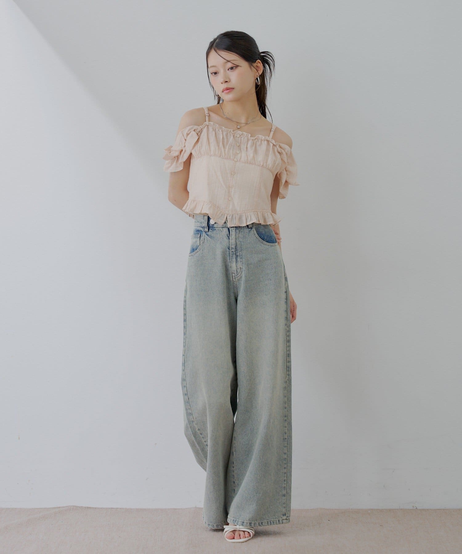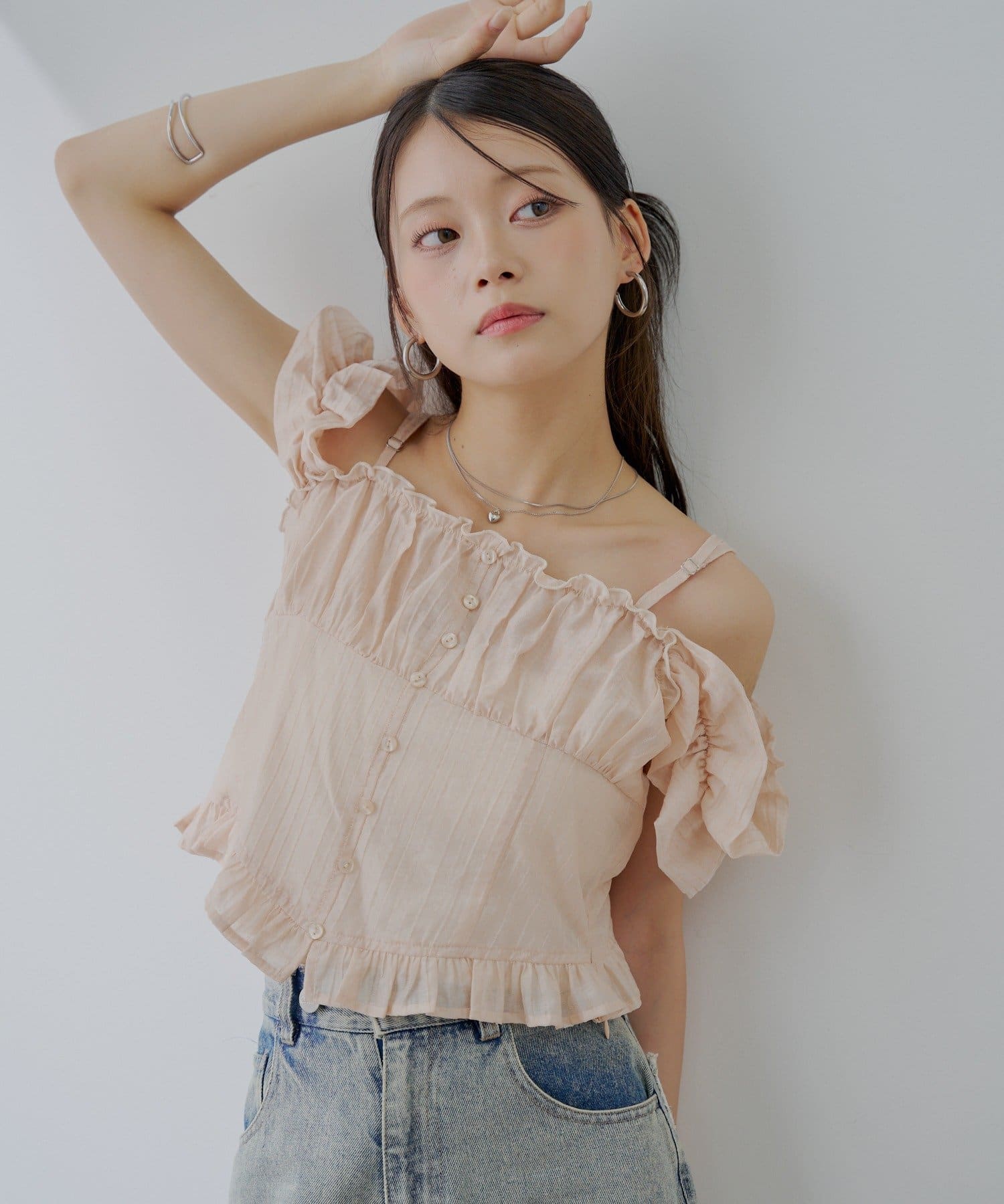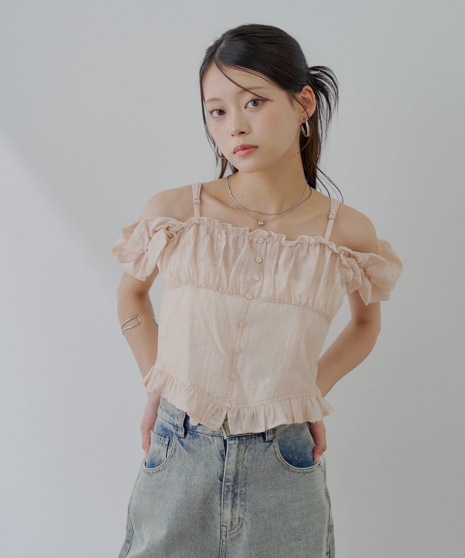 ・袖のフリルを落としてオフショルダーにして着るのも可愛いです。
