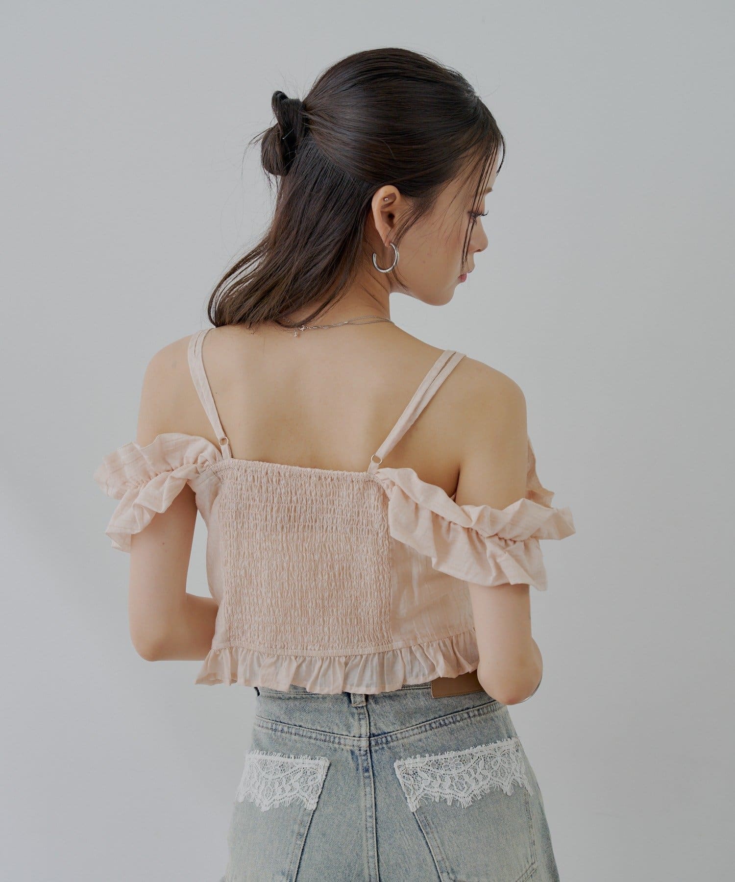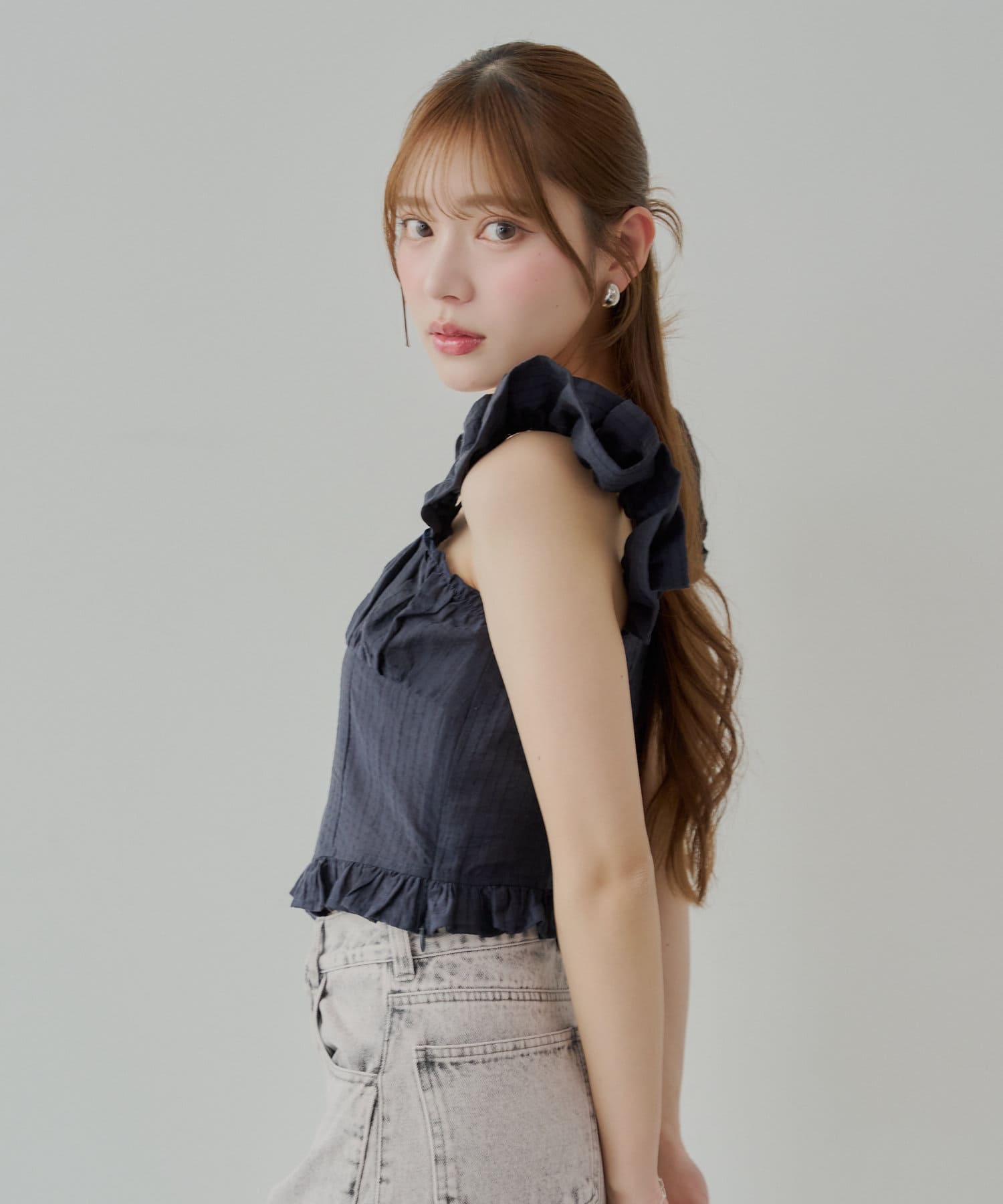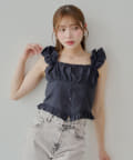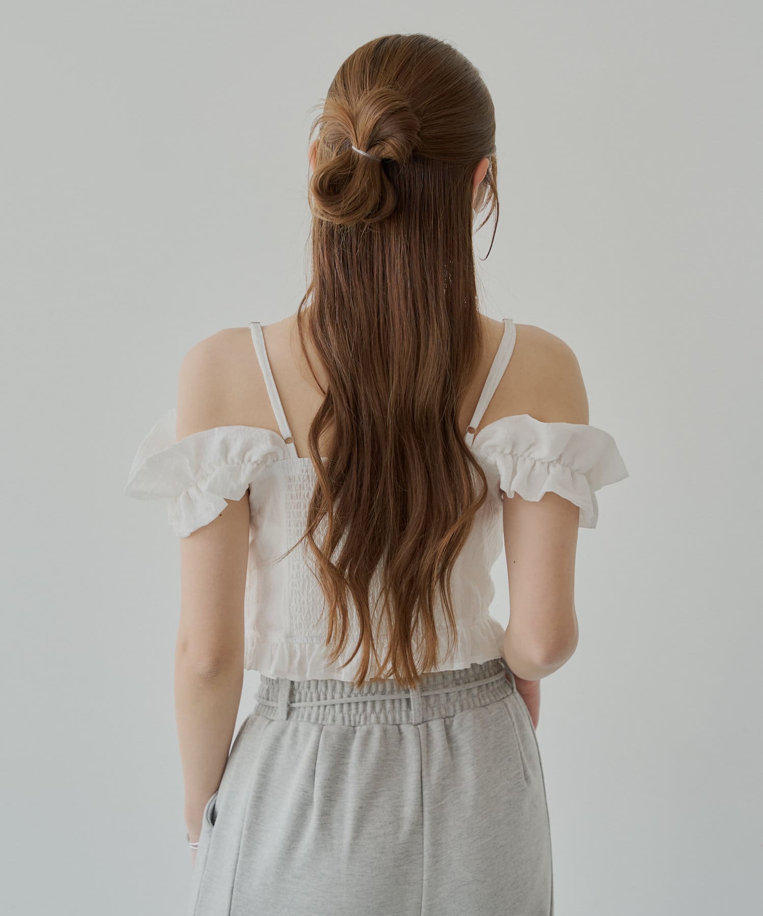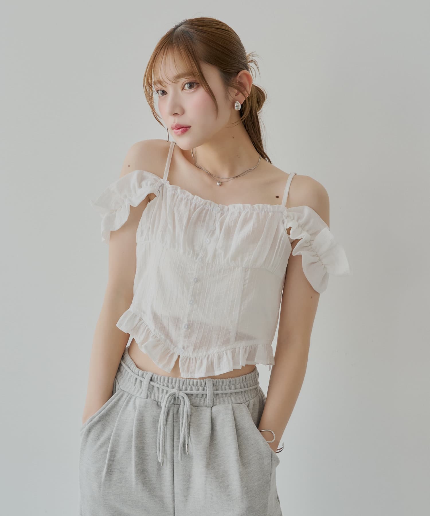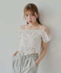 ・袖のフリルを落としてオフショルダーにして着るのも可愛いです。
