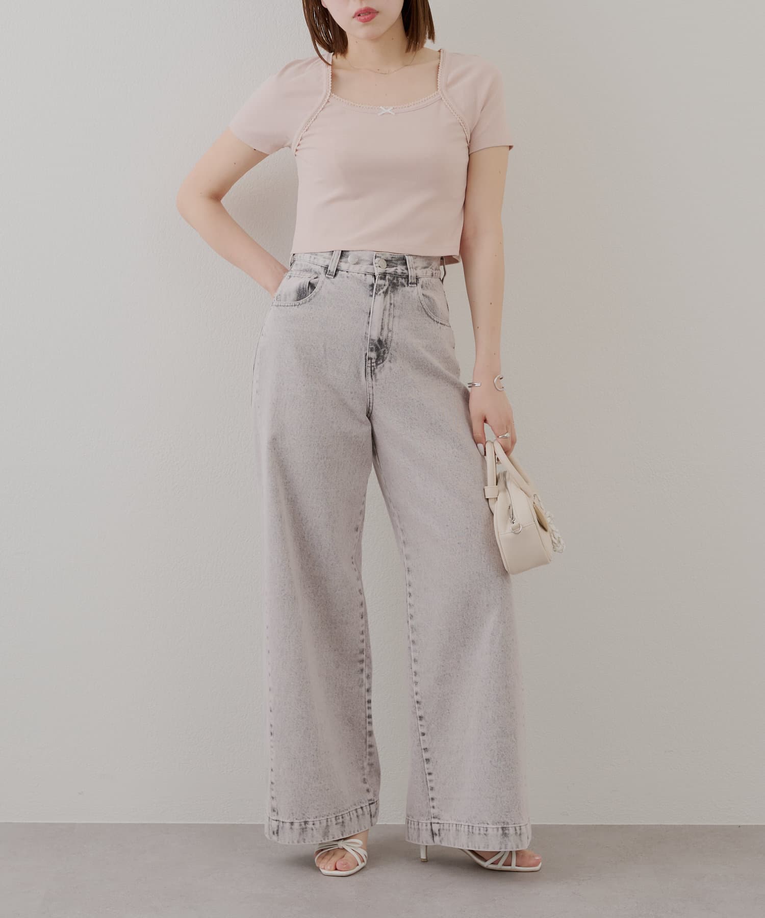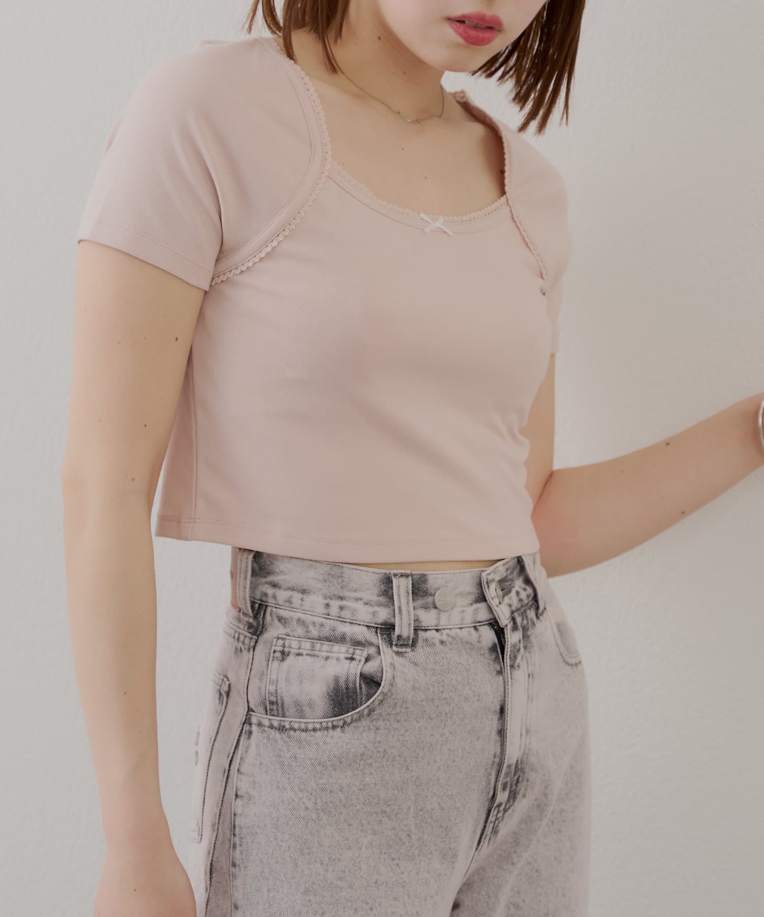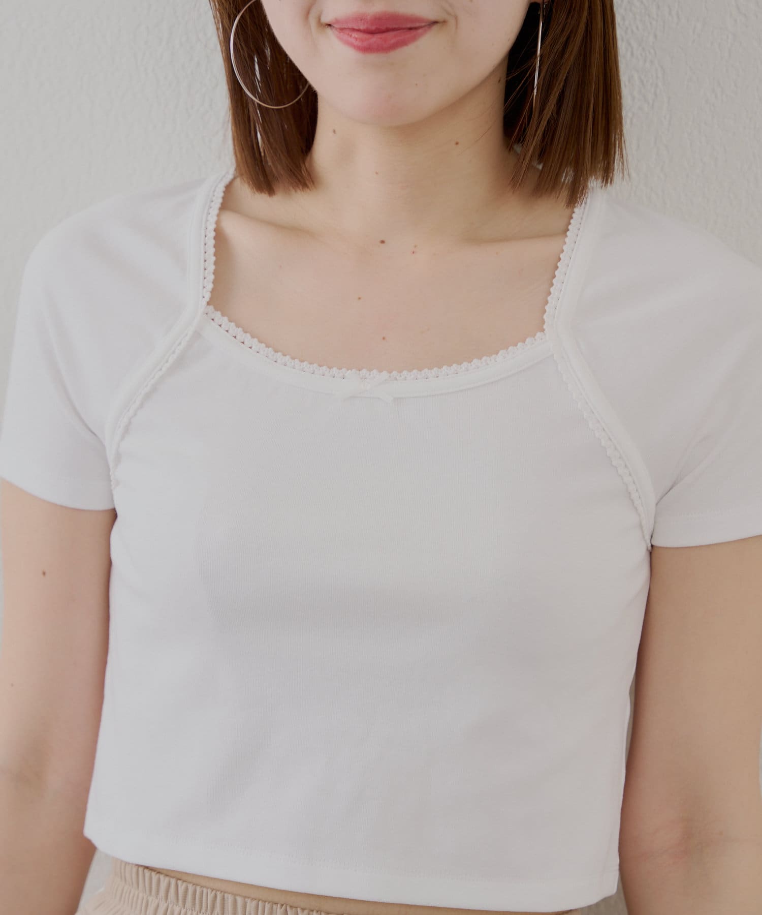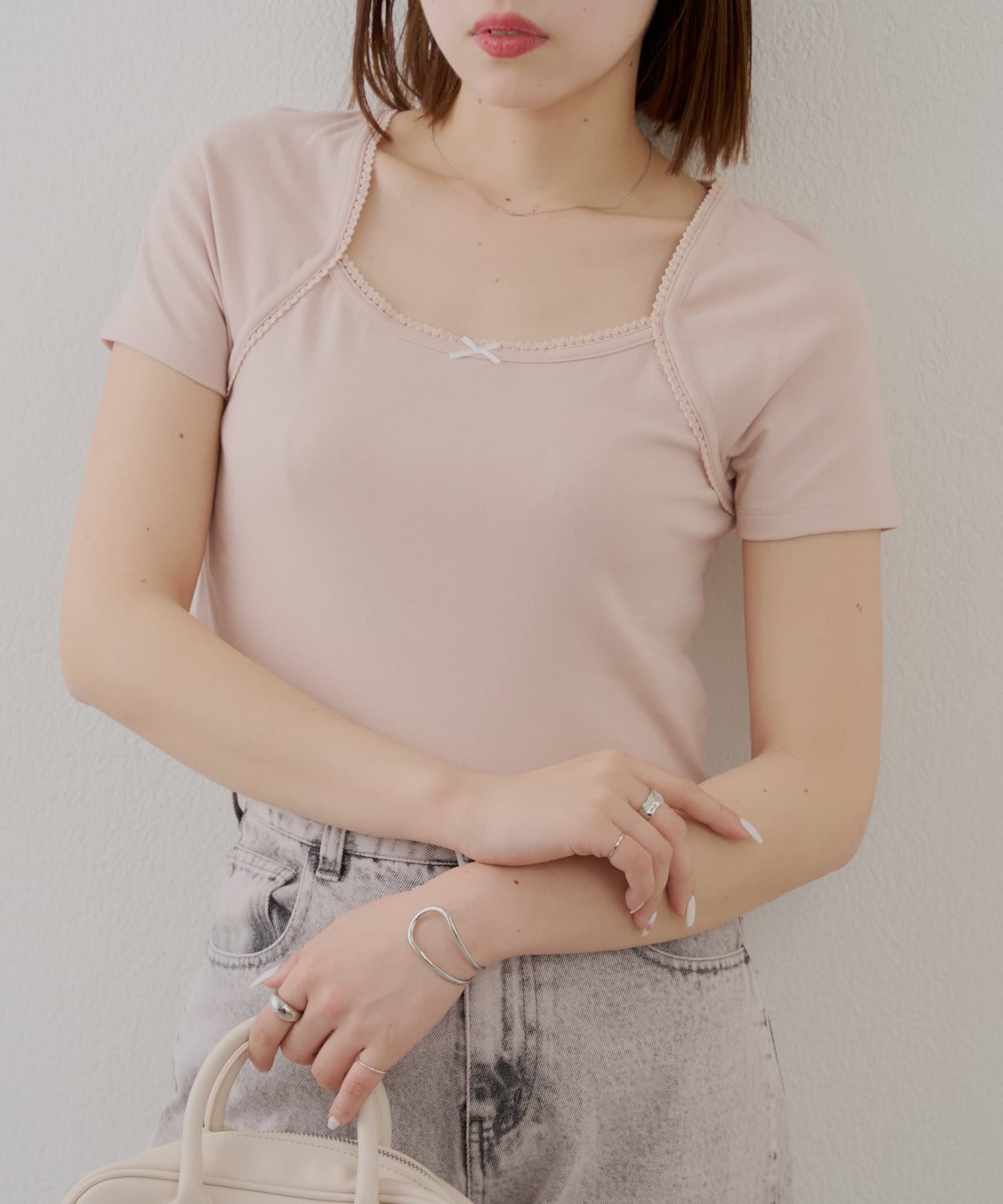 ・胸元を美しく見せるスクエアネックと、繊細なレース、さりげないリボンが女性らしさを引き立てます。