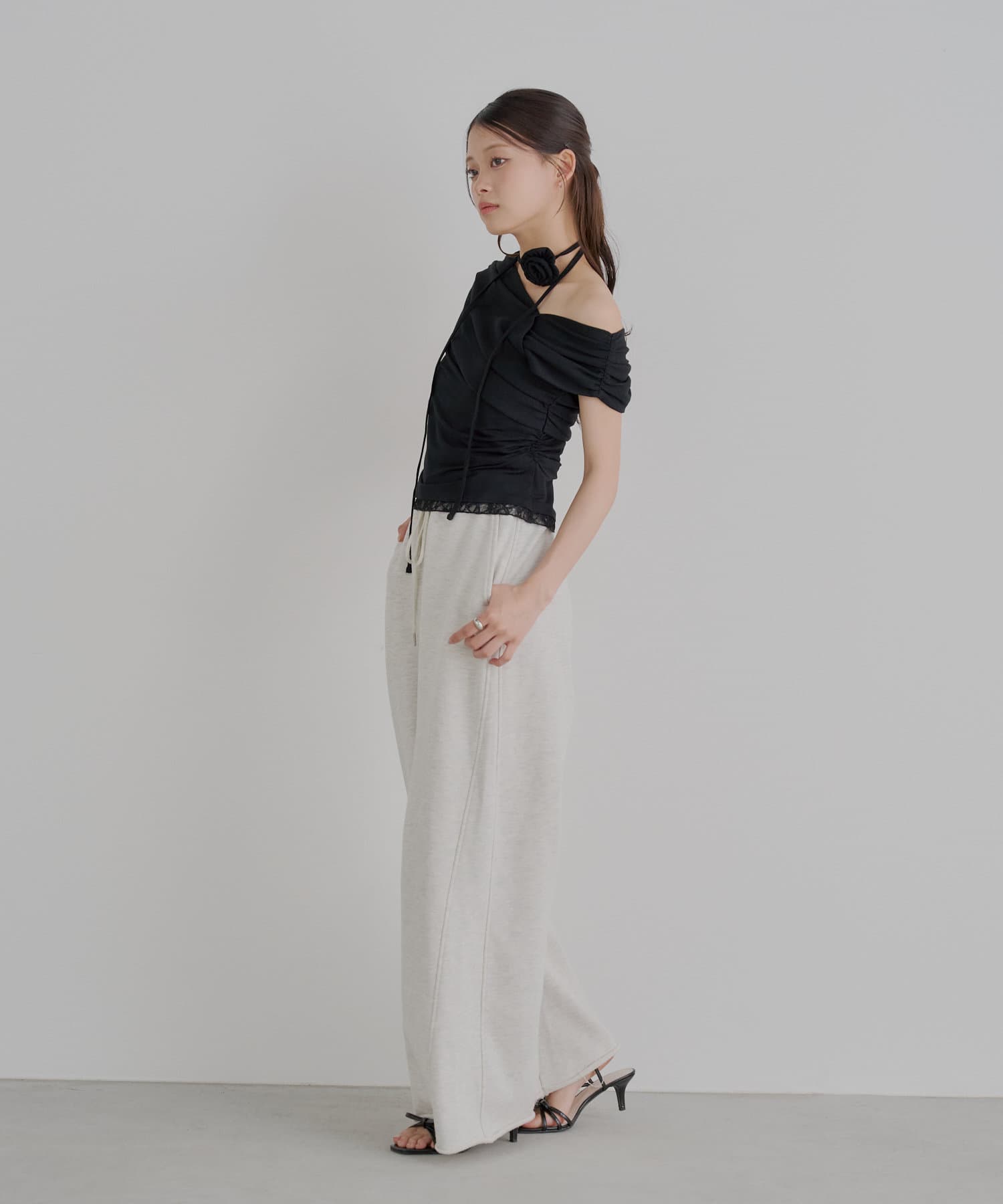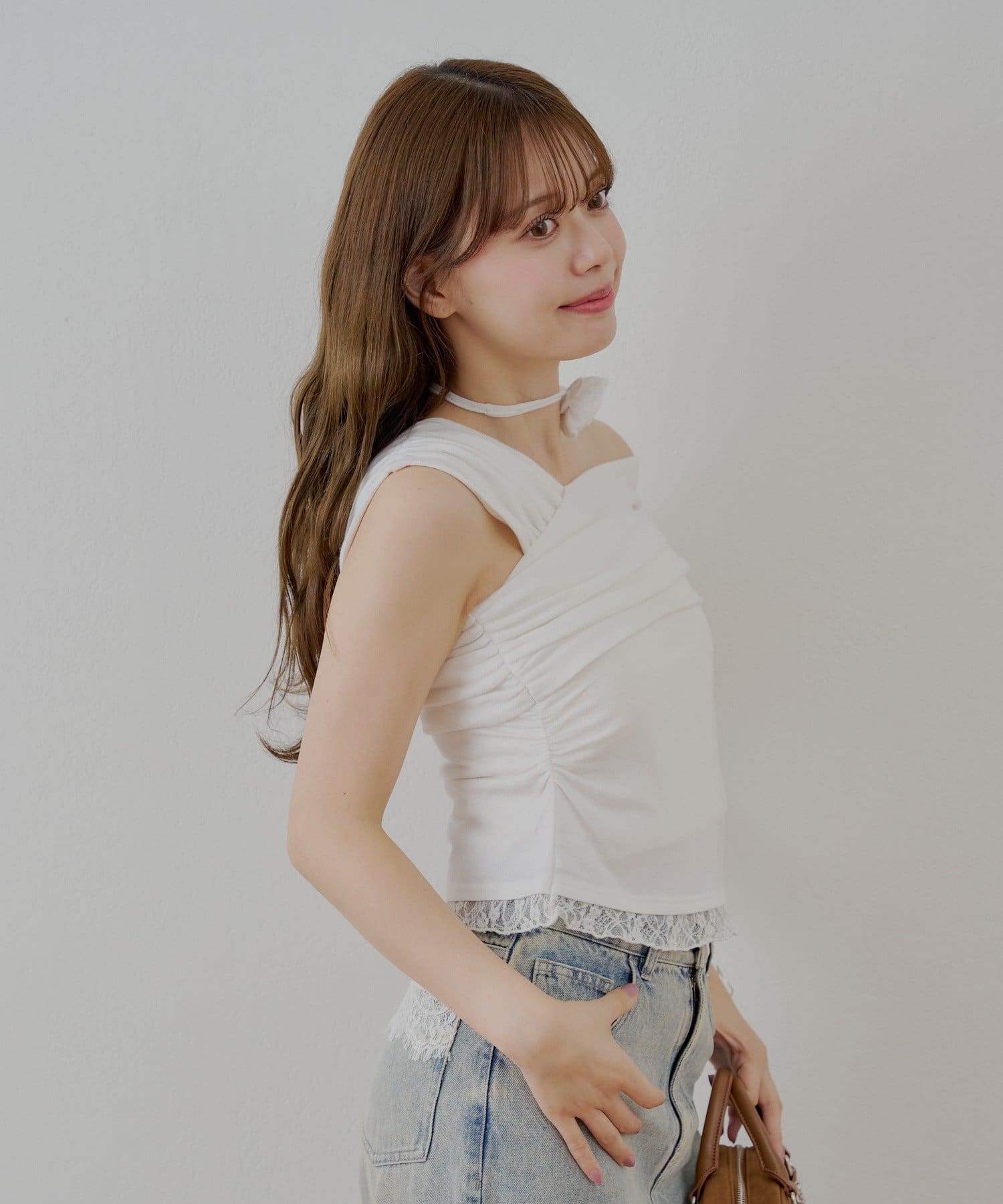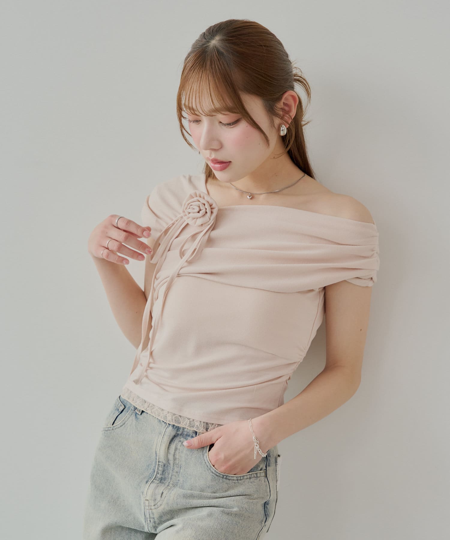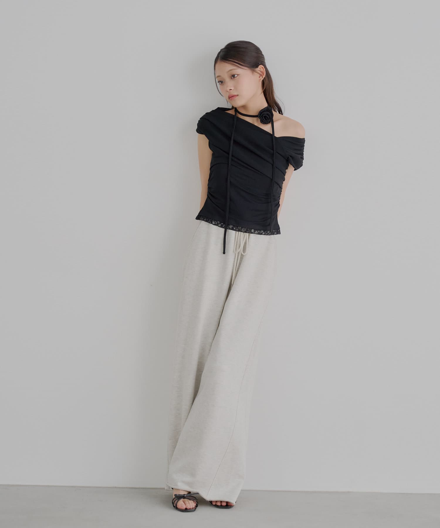 TOP > OUTLET > レディース > トップス > Tシャツ/カットソー > 【Chico】ローズチョーカー付ワンショル裾レースT