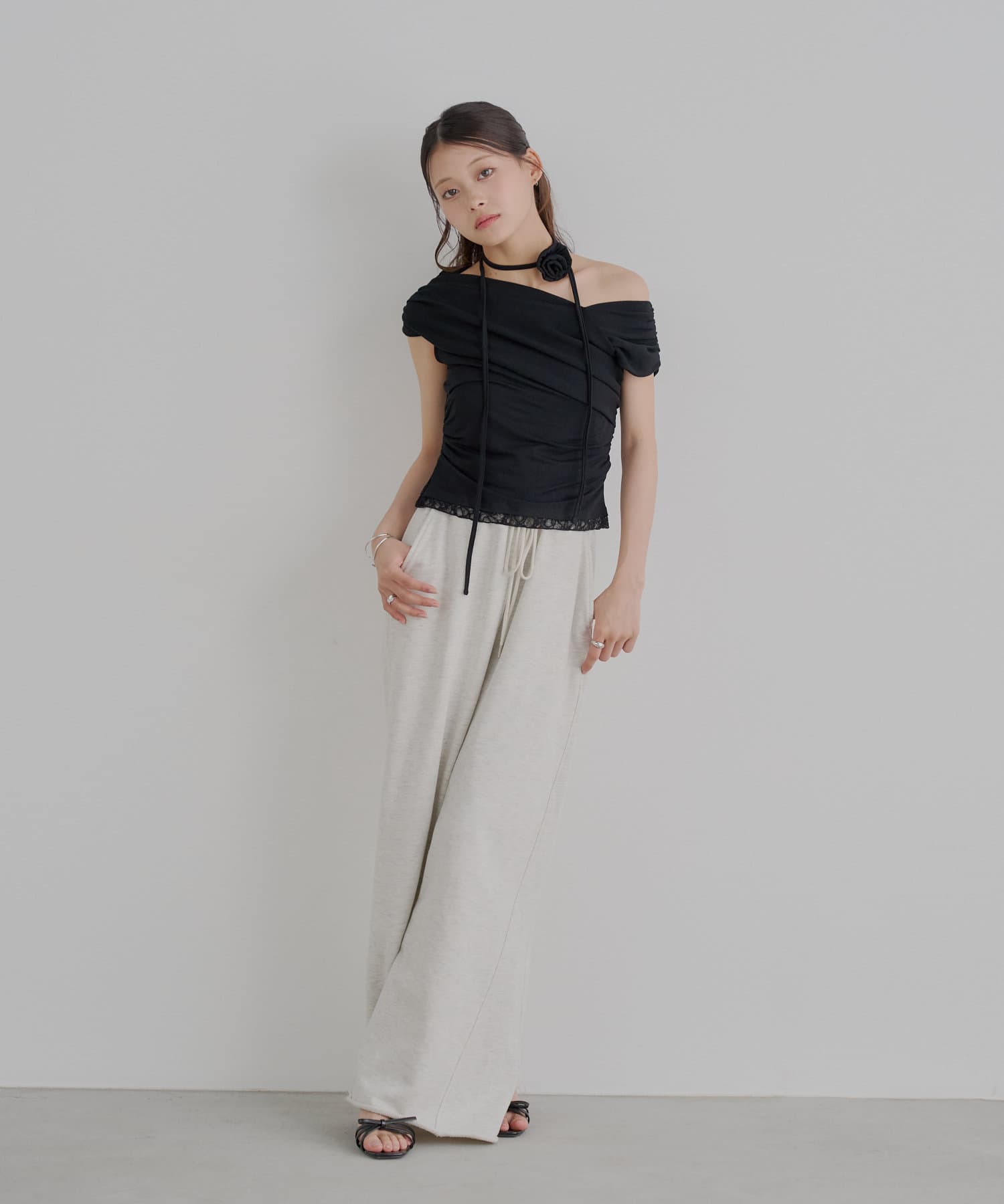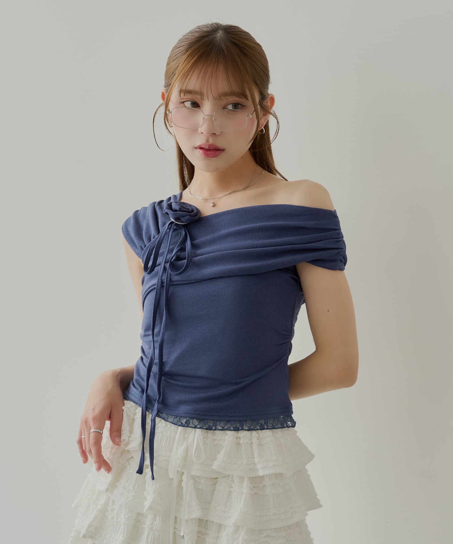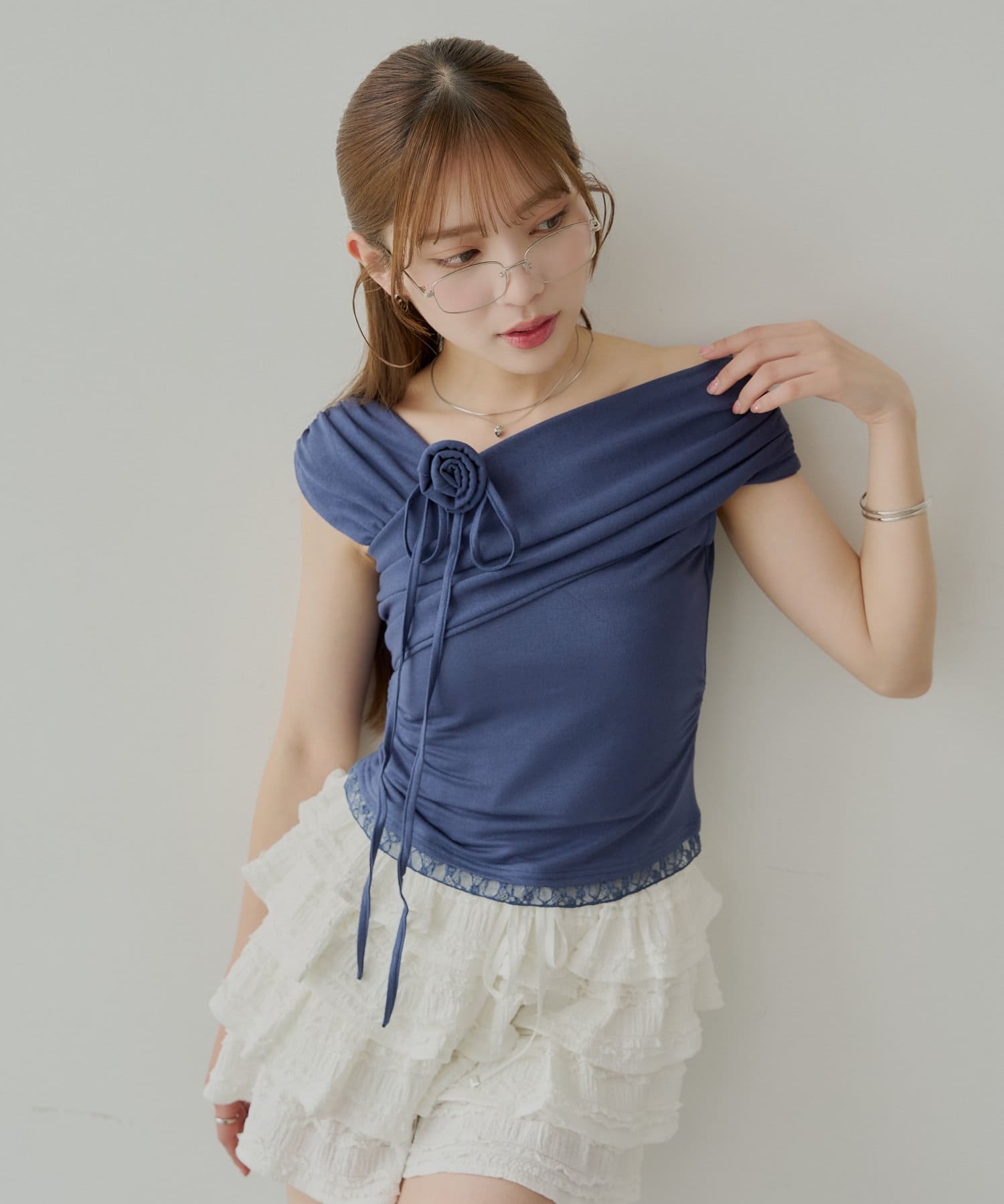 【Chico】ローズチョーカー付ワンショル裾レースT