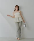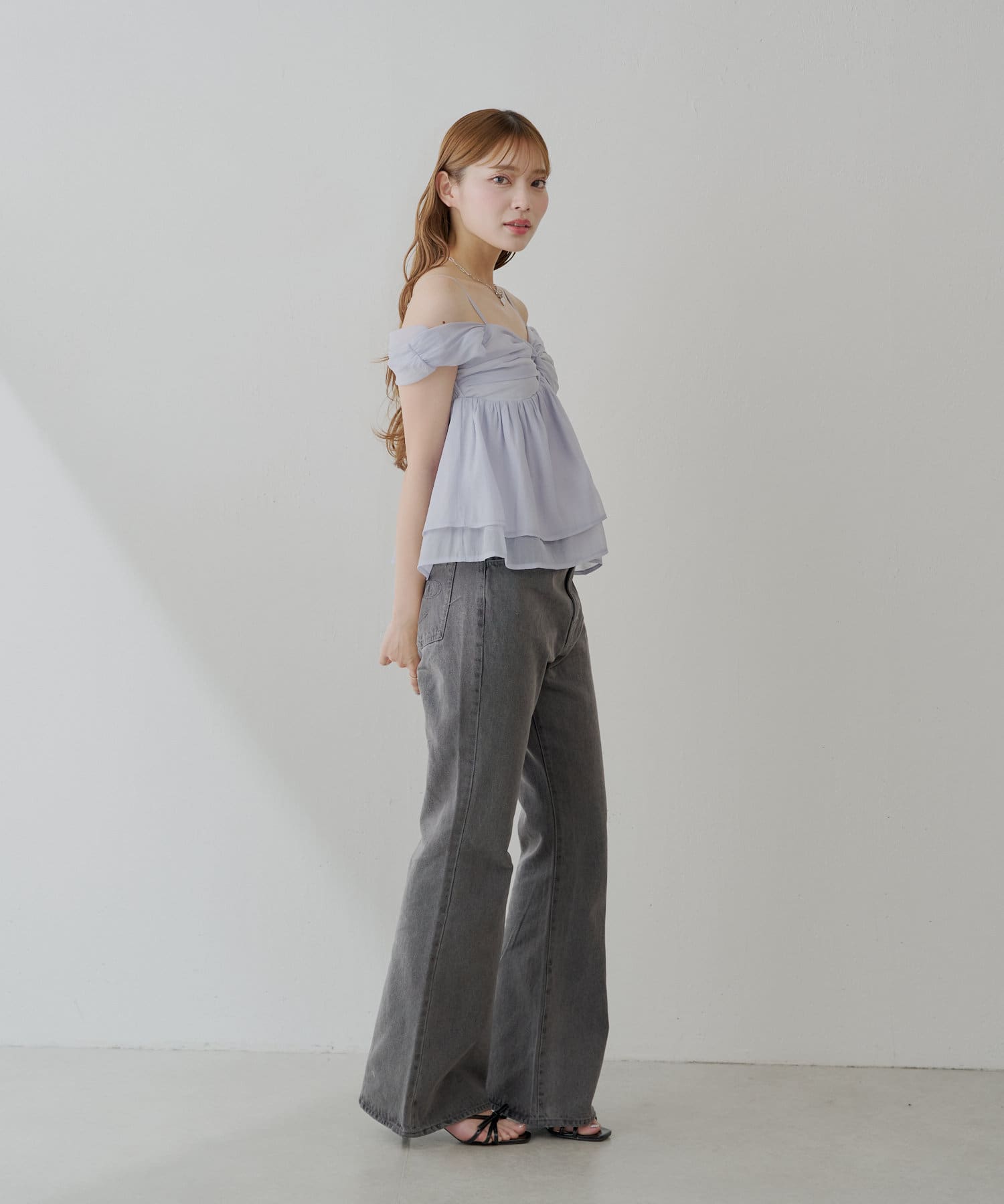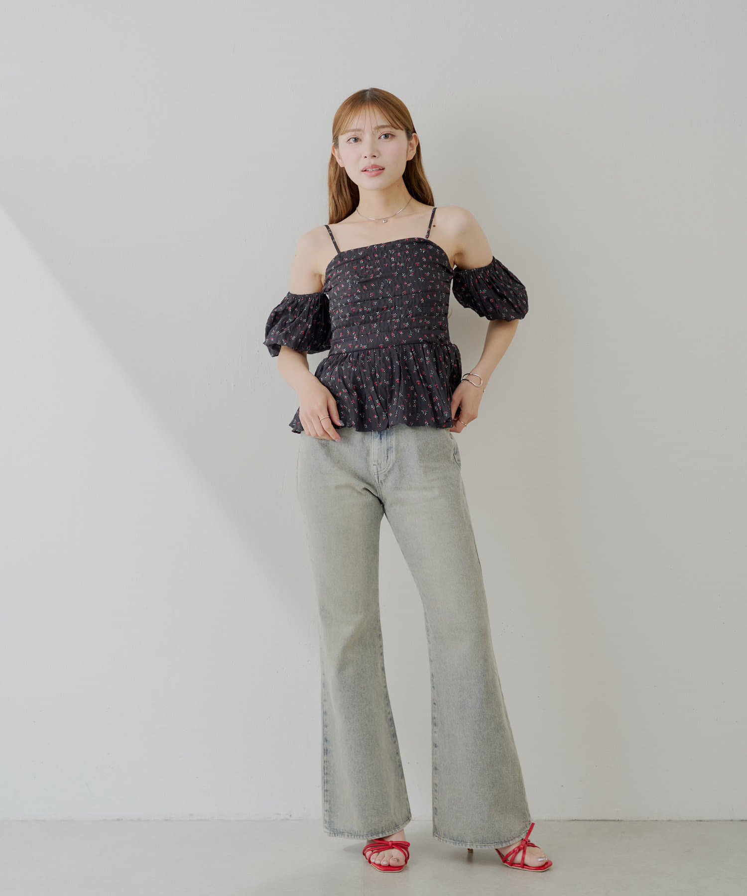 ・コンパクトトップスやオフショルトップスでちらっと肌見せするとトレンドライクな印象に。
