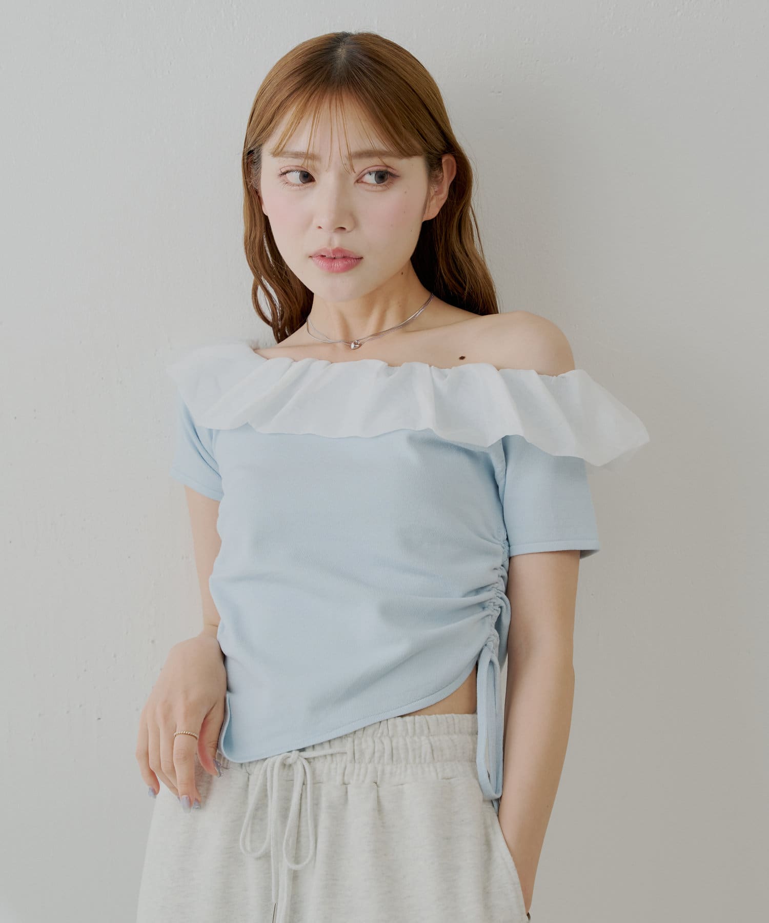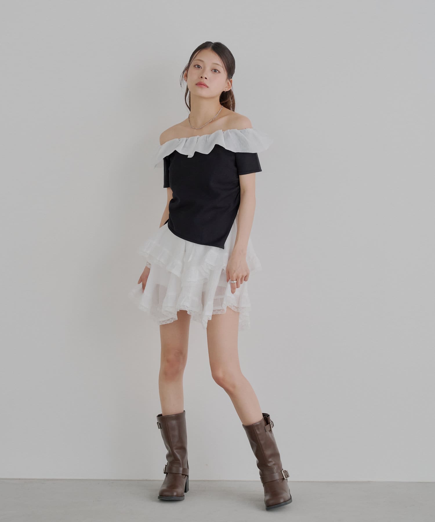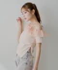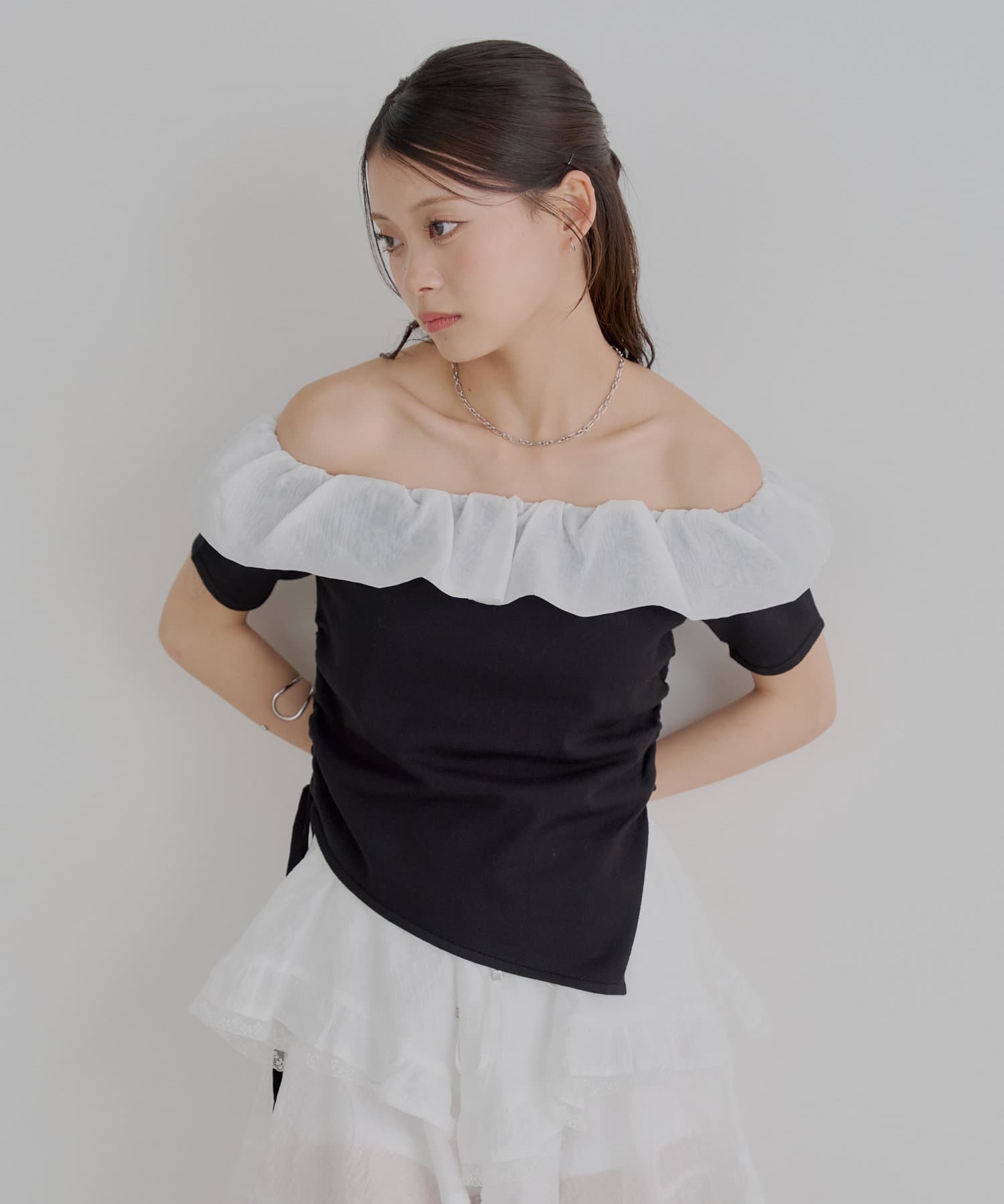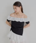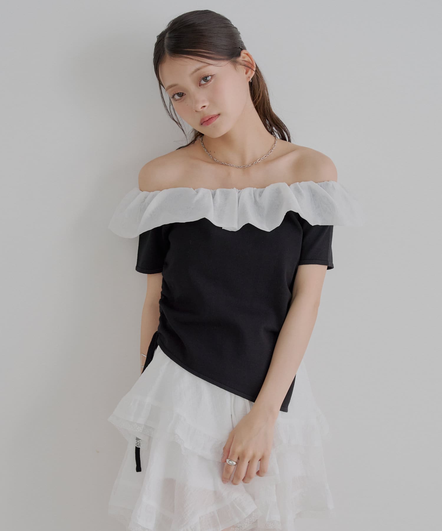 ・胸元の繊細なフリルが顔周りを華やかに演出し、上品な肌見せで抜け感をプラスします。