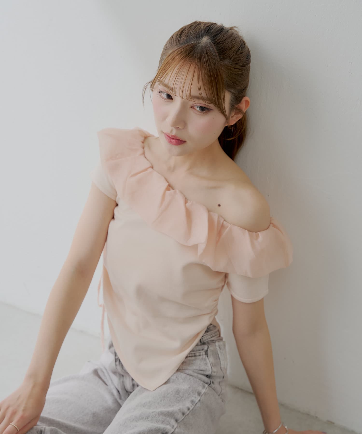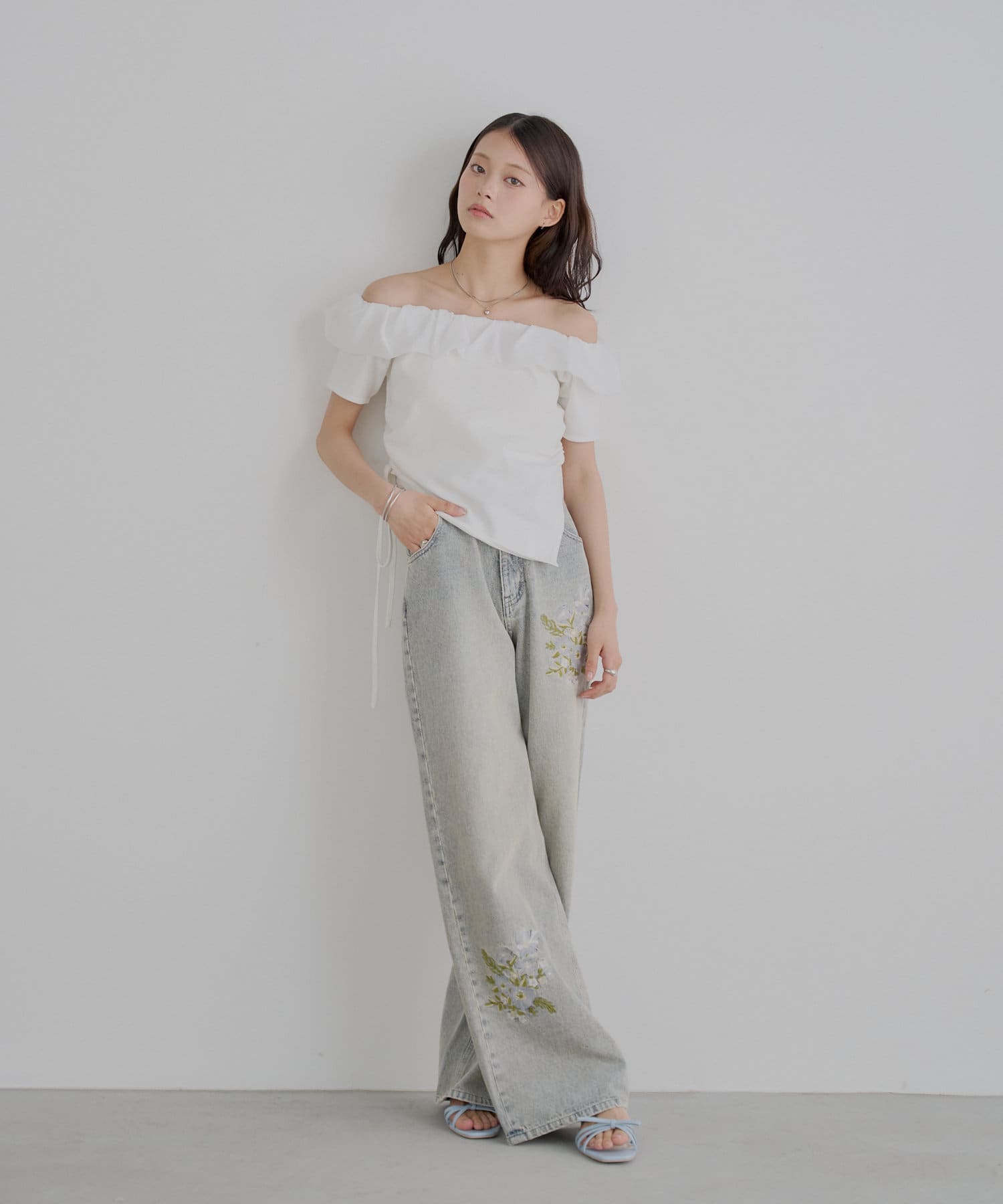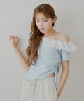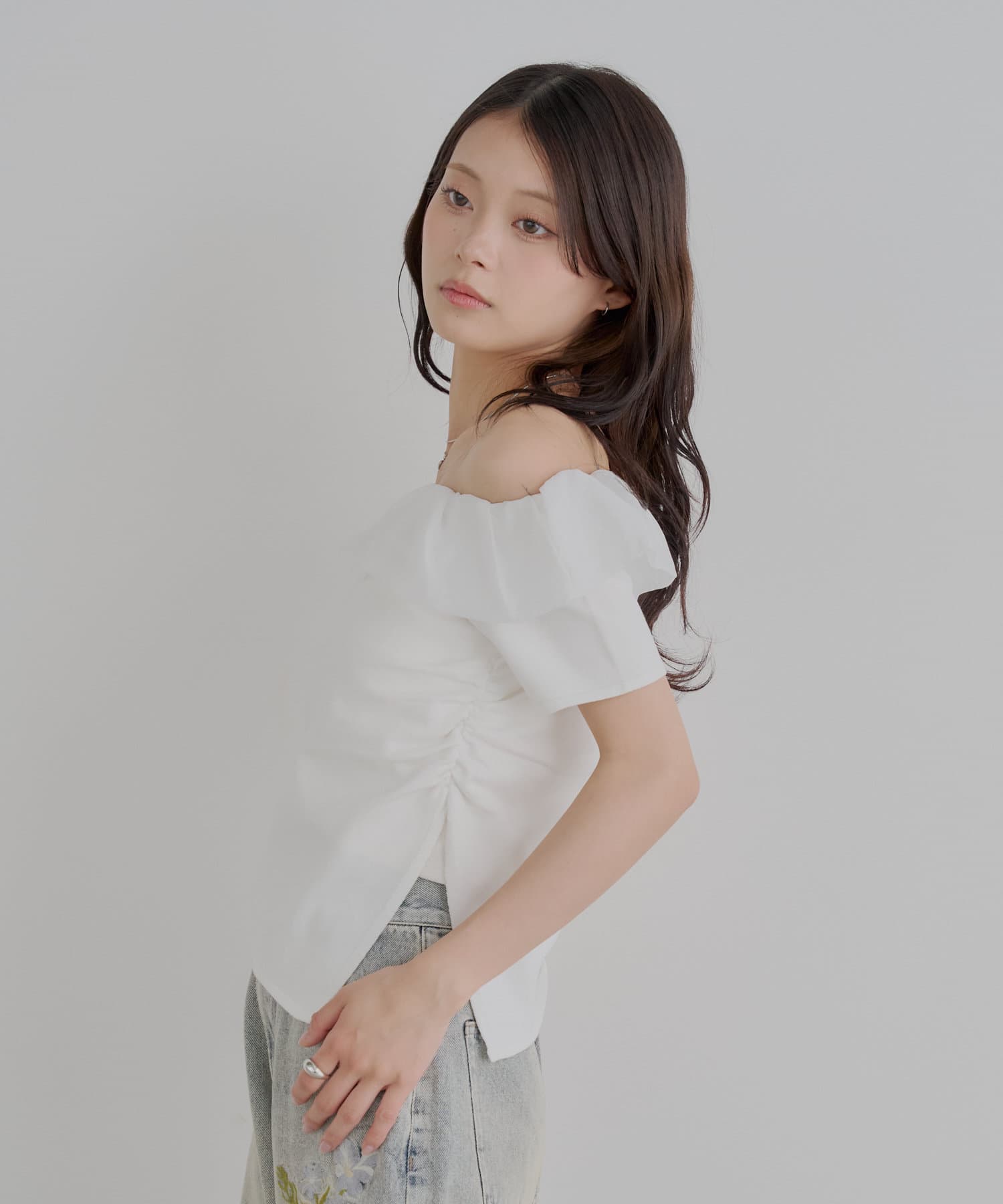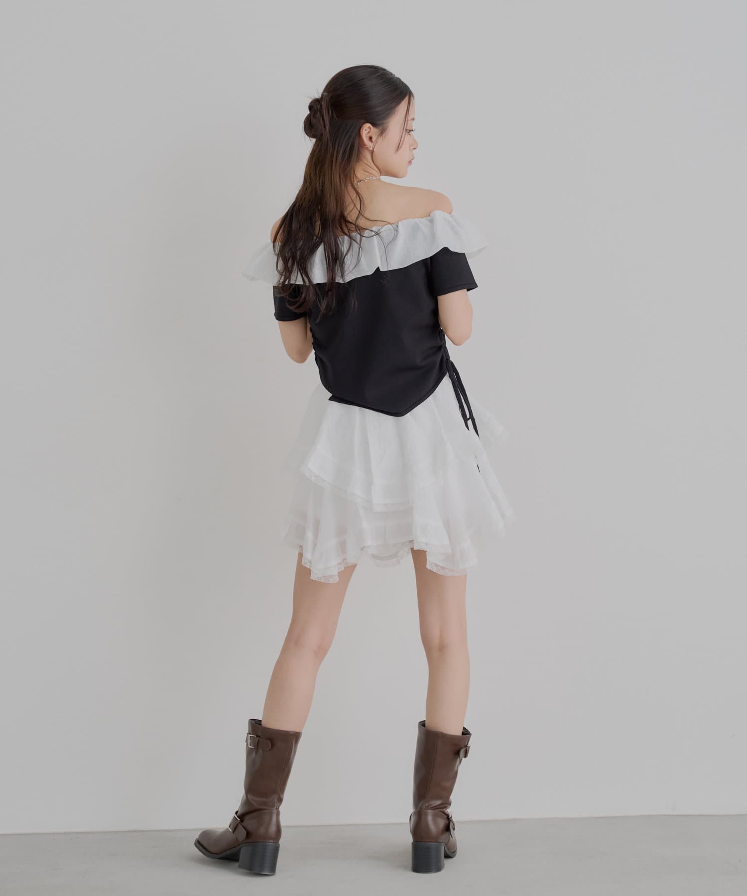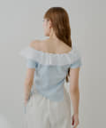・胸元の繊細なフリルが顔周りを華やかに演出し、上品な肌見せで抜け感をプラスします。