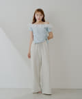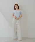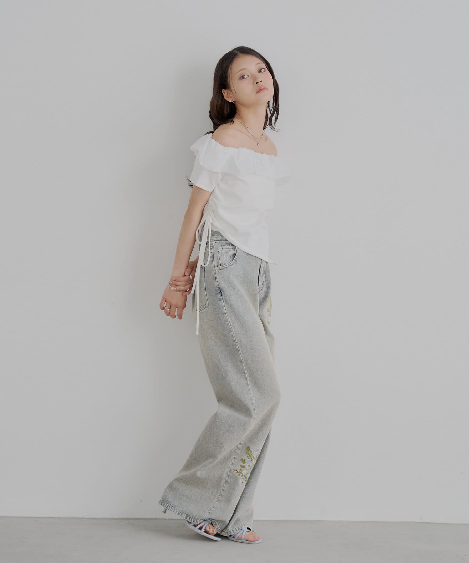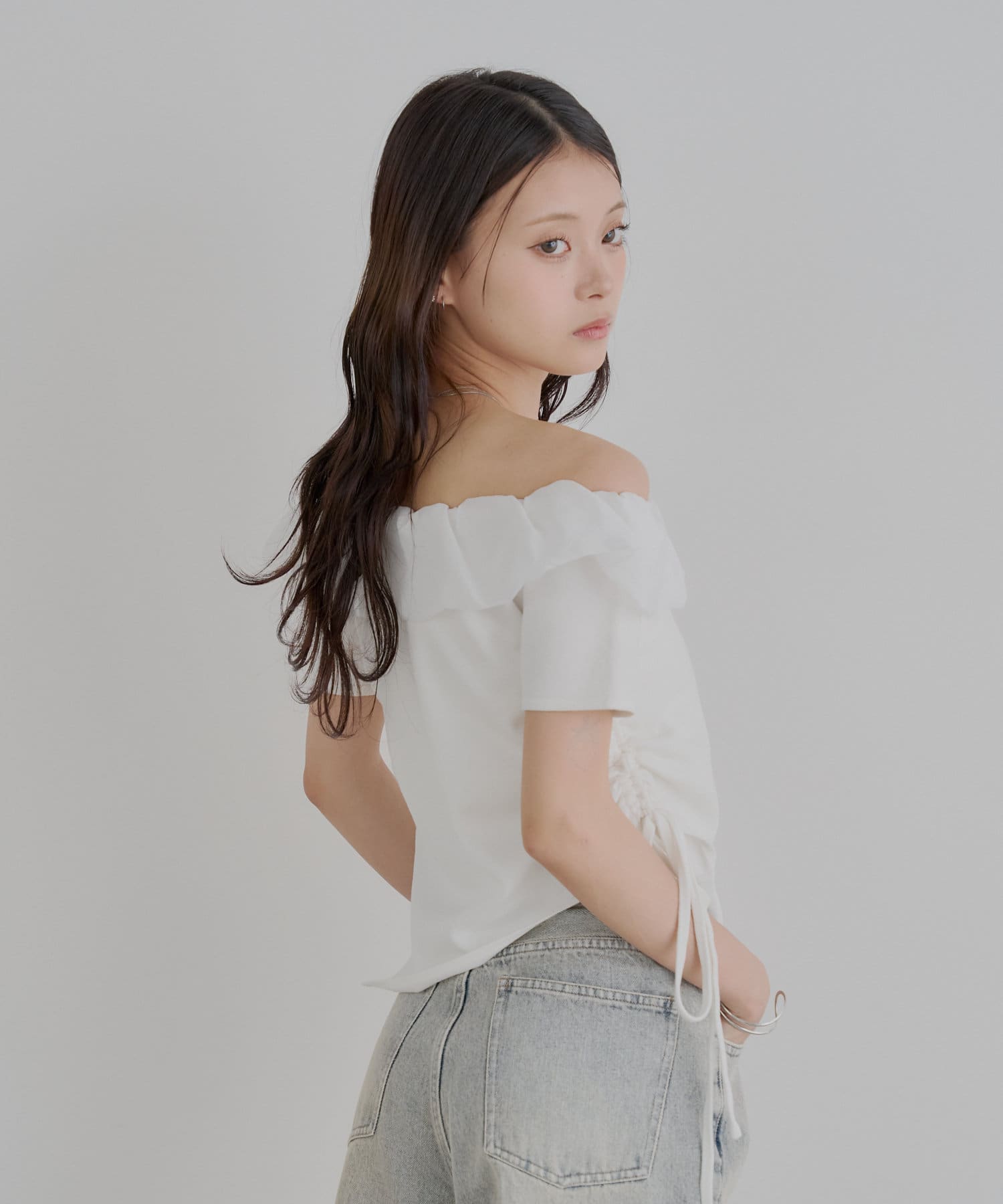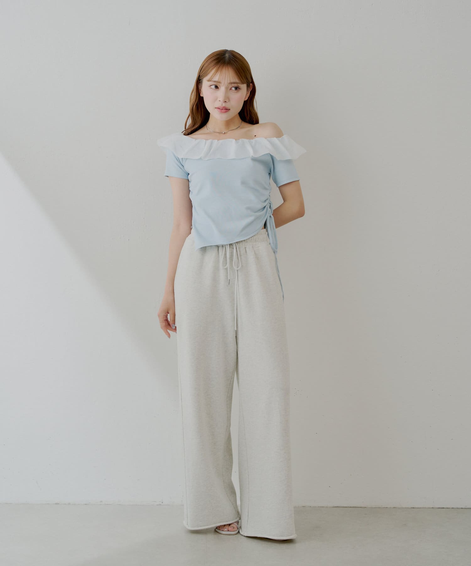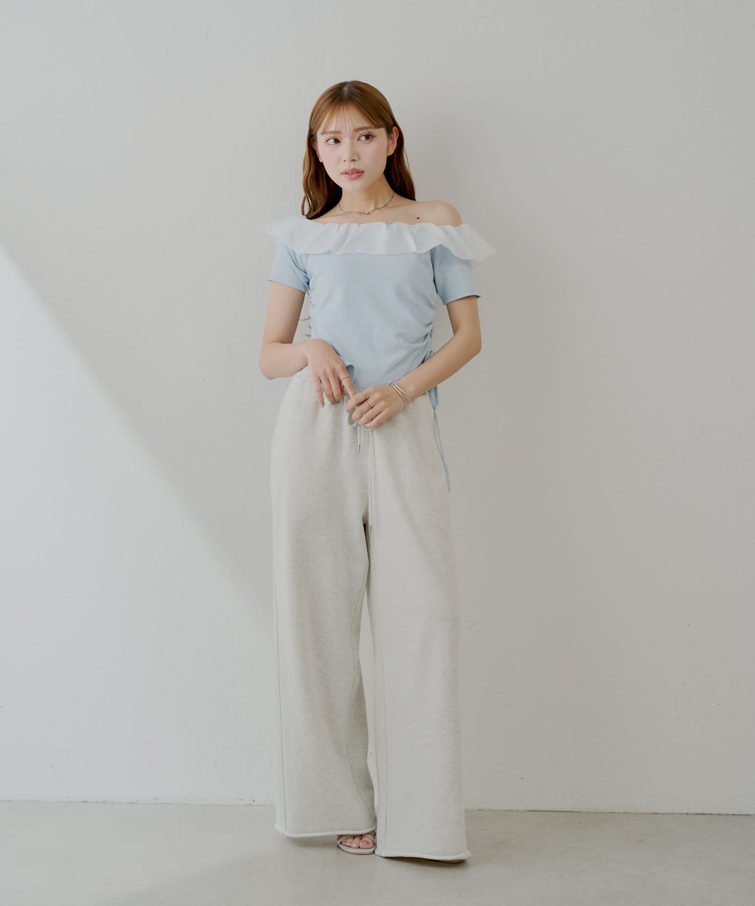 ・サイドのドローストリングをキュッと絞るとフェミニンに、緩めてリラックス感のある着こなしに。