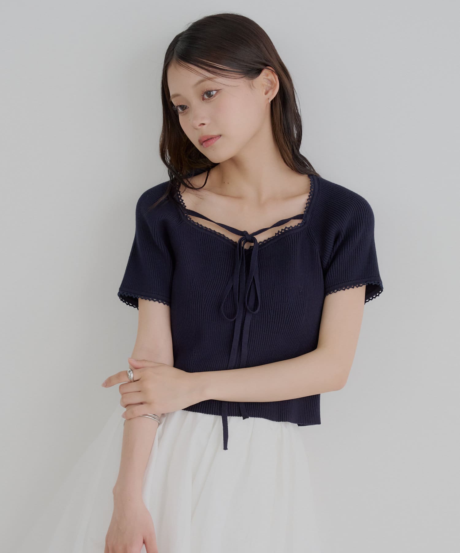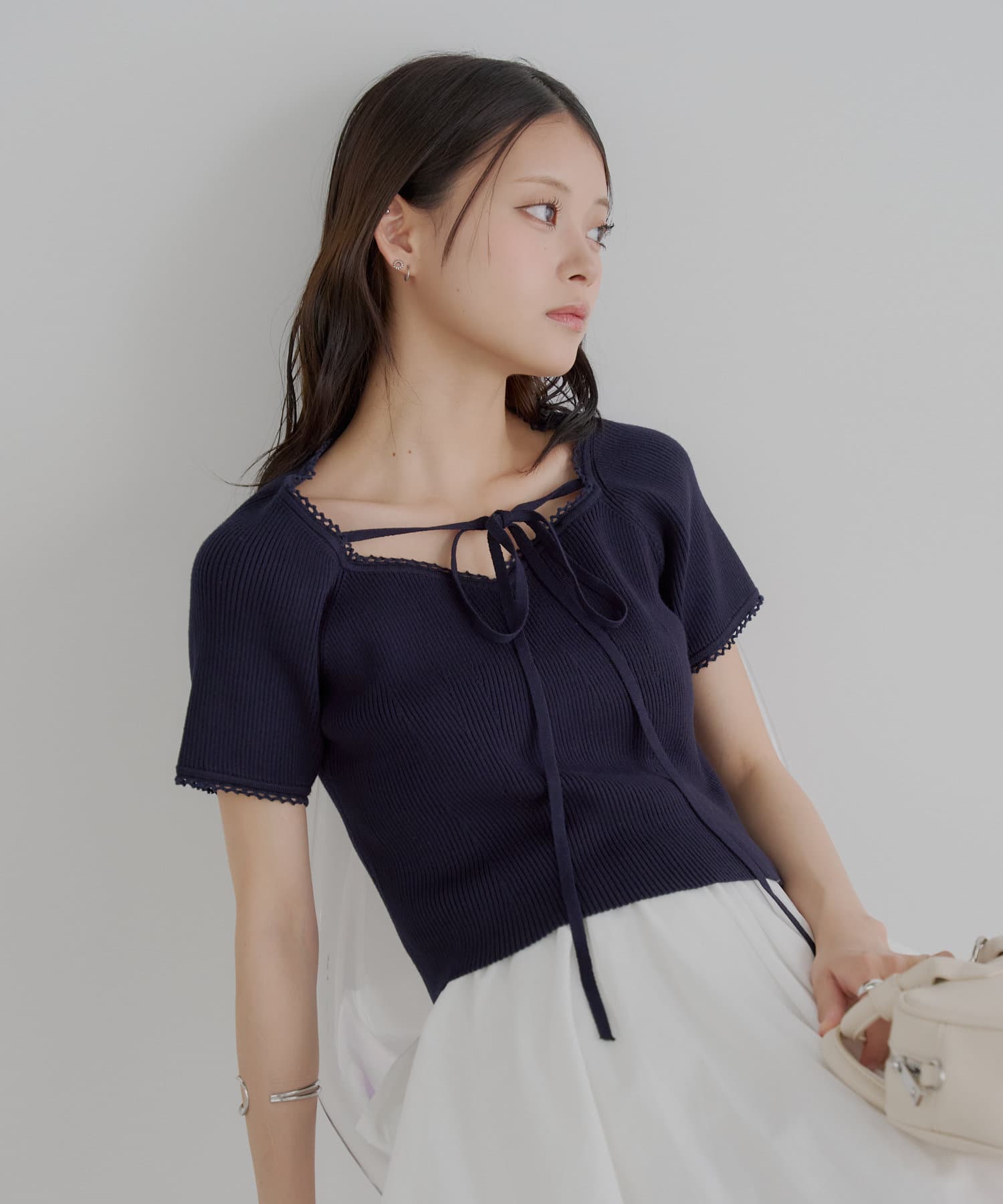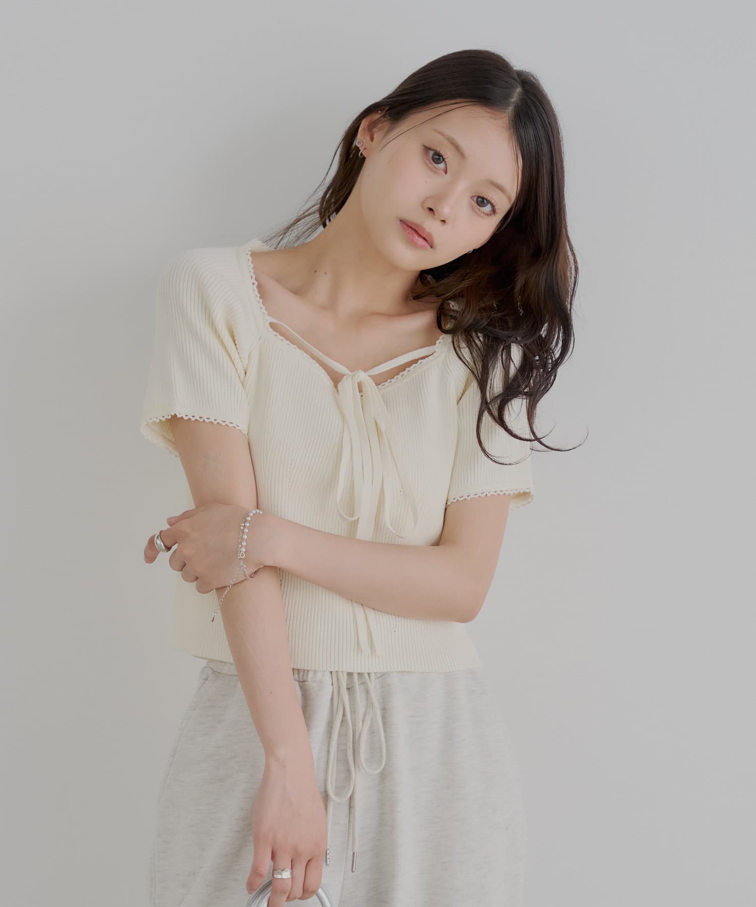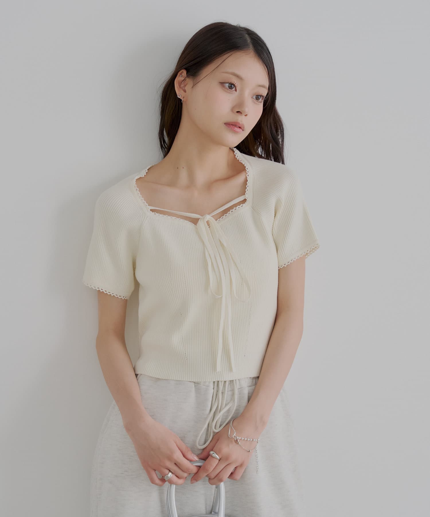 スクエアネックとリボン使いが、デコルテを美しく見せてくれるフレンチニット登場!