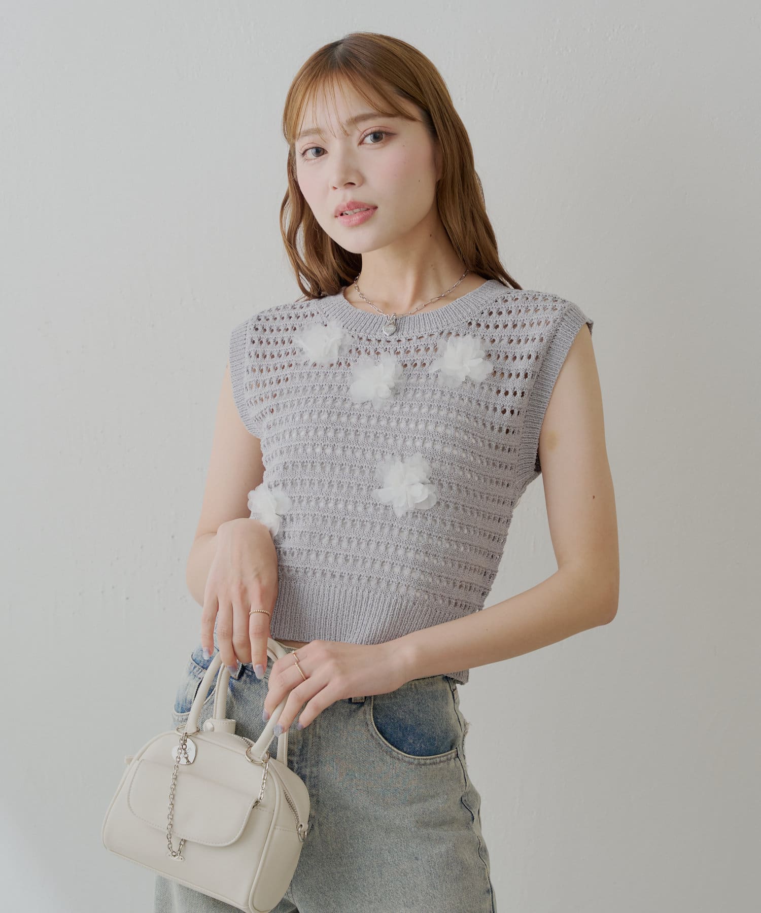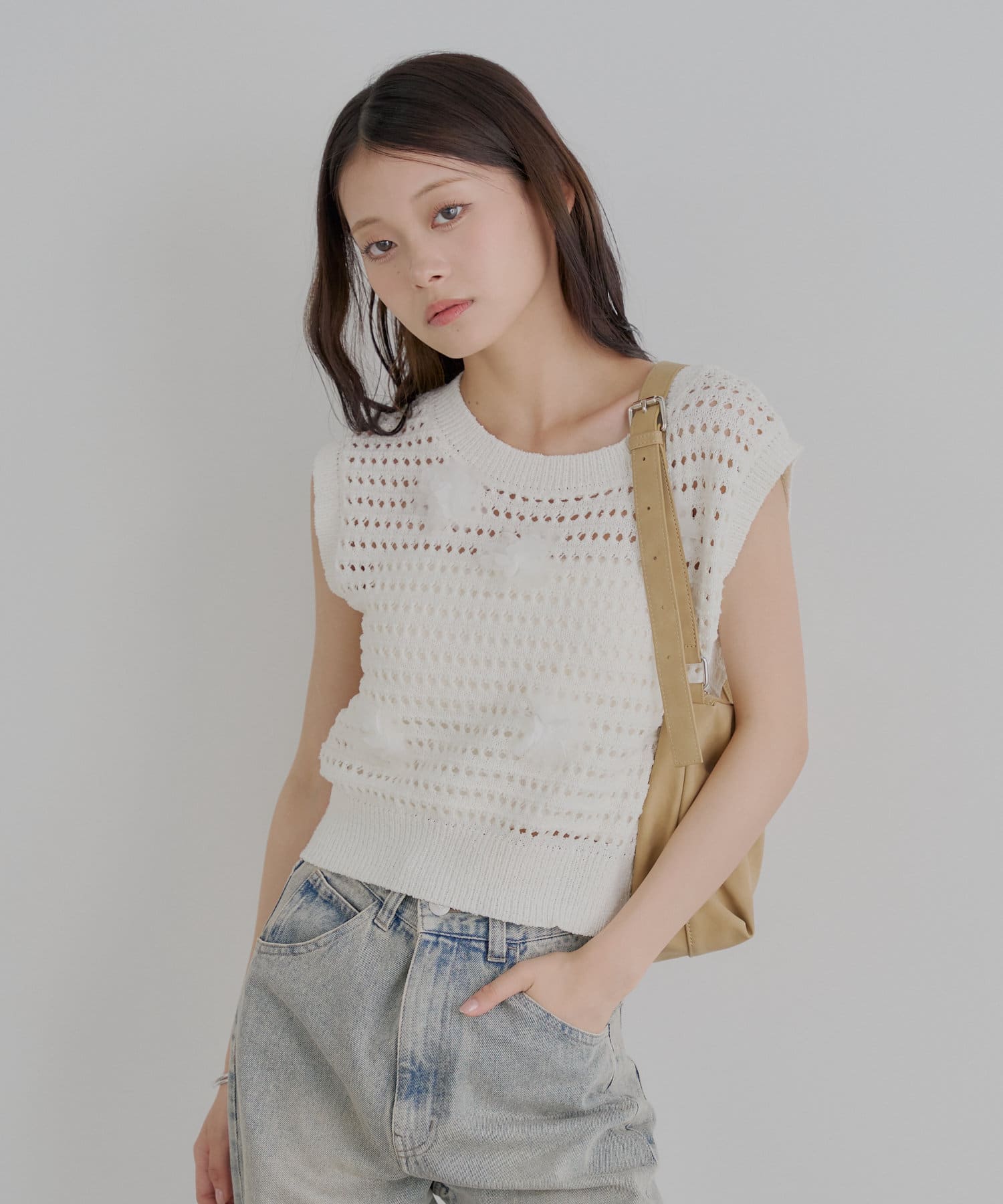 繊細な透かし編みとさりげないフラワーモチーフが魅力のニットベスト登場!