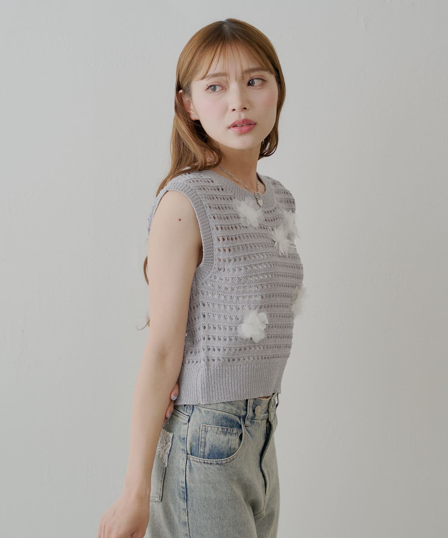 ベストの下に、袖と丈が短いTシャツと合わせて着ています。立体的なお花がかわいくて、華やかです。