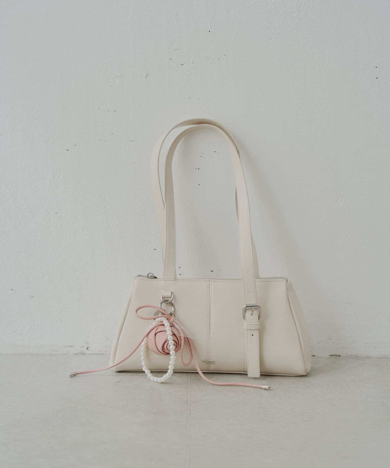 ・バラのモチーフとパールの組み合わせが目を惹くスマホストラップ。