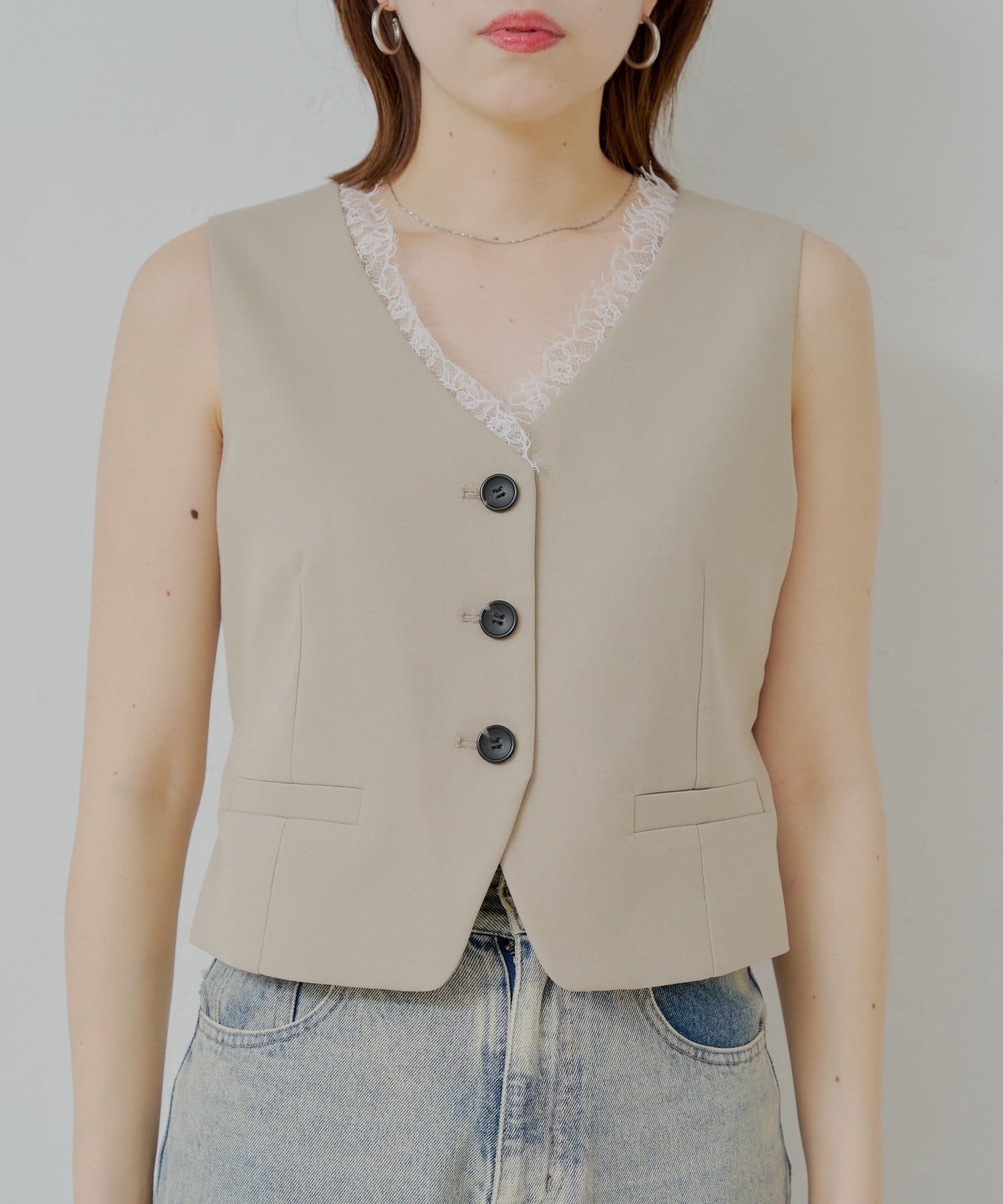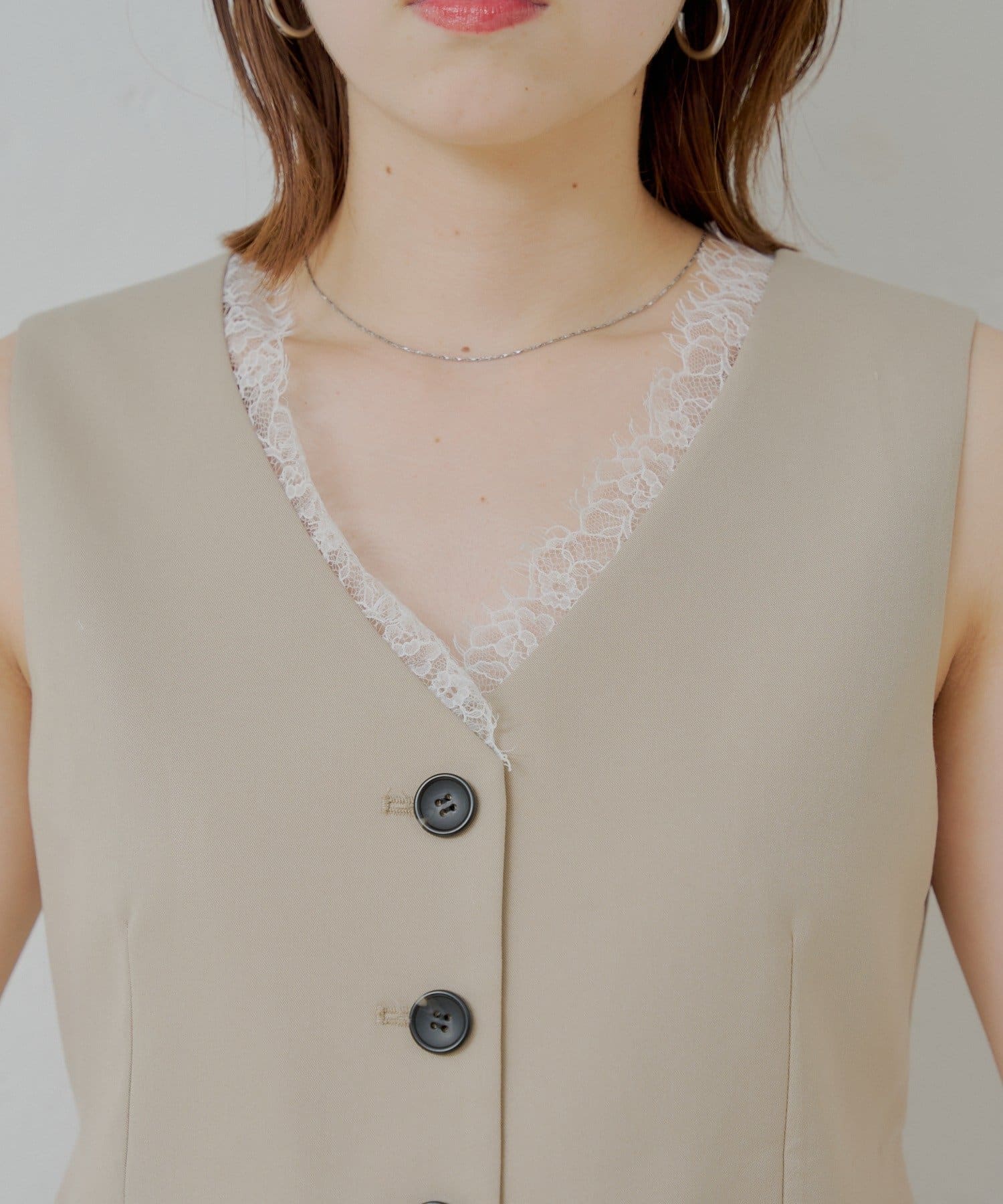 ・ Vネックにあしらわれた繊細なレースが、女性らしさを引き立て、ワンポイントアクセントにも。