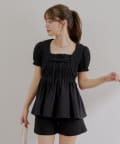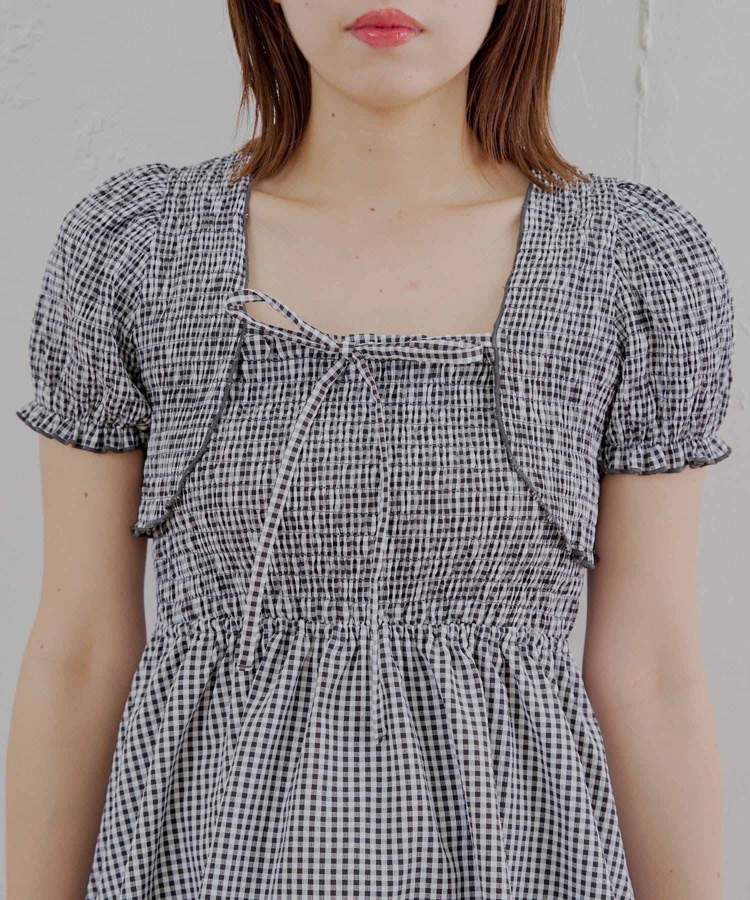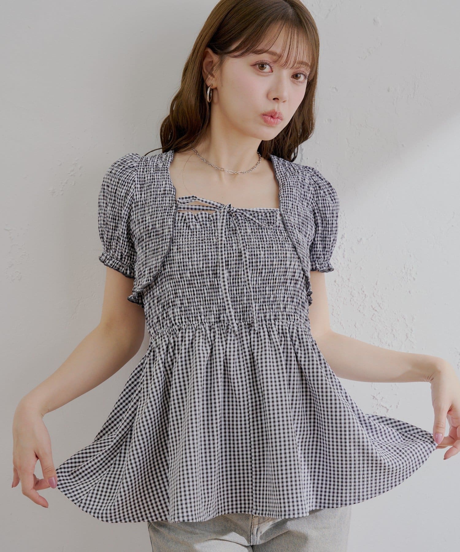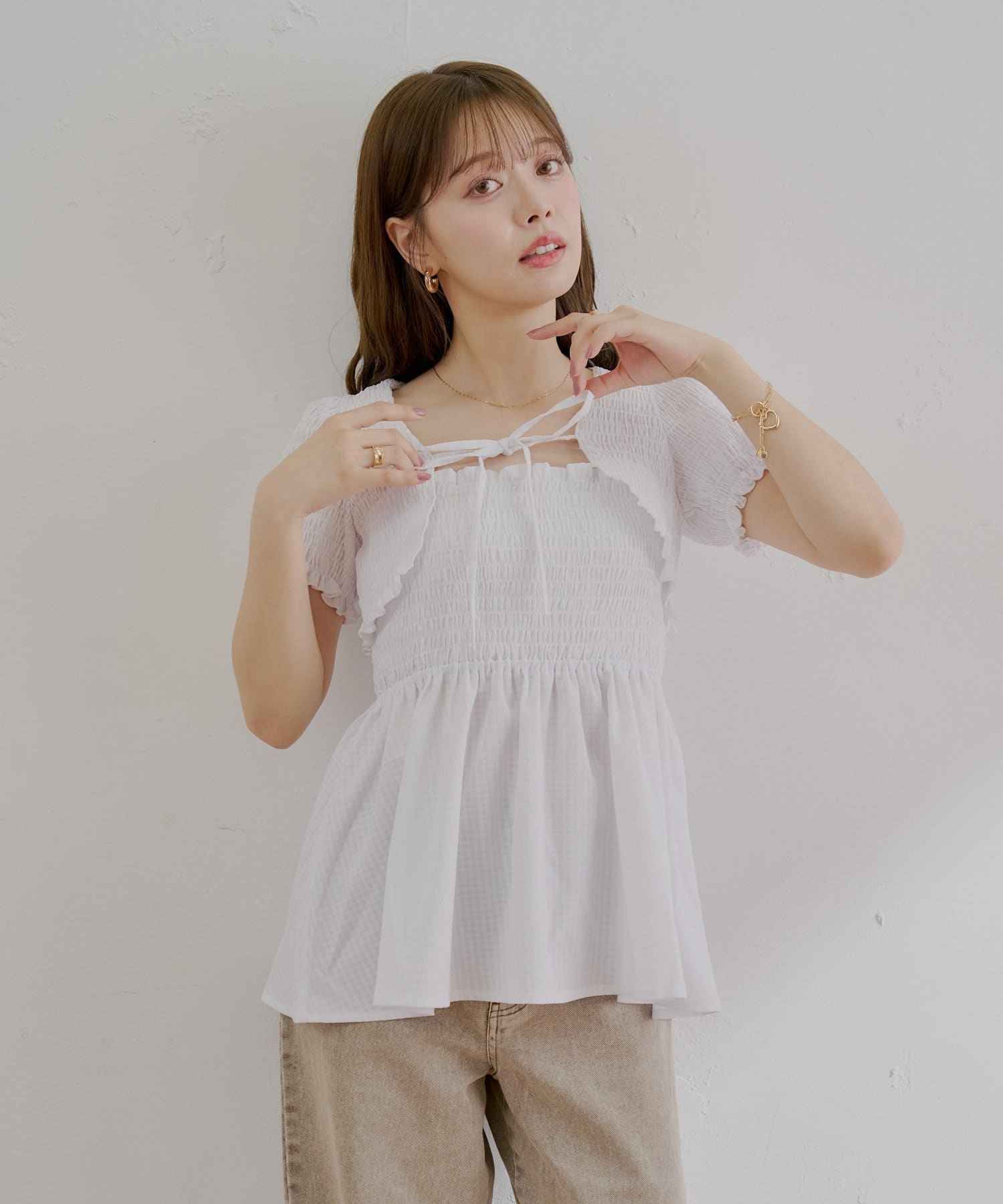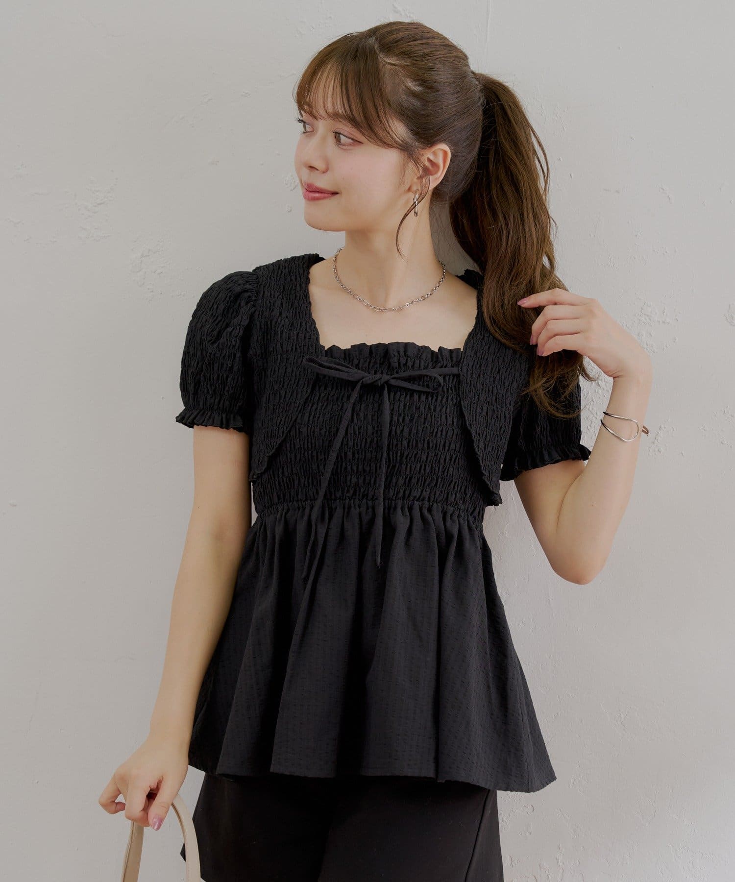 ・シャーリングとリボンがポイントのフェミニンなペプラムキャミ+ボレロセット。