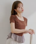 ・カジュアルなTシャツに、ふんわりと広がるフリルをドッキングしたトップス。