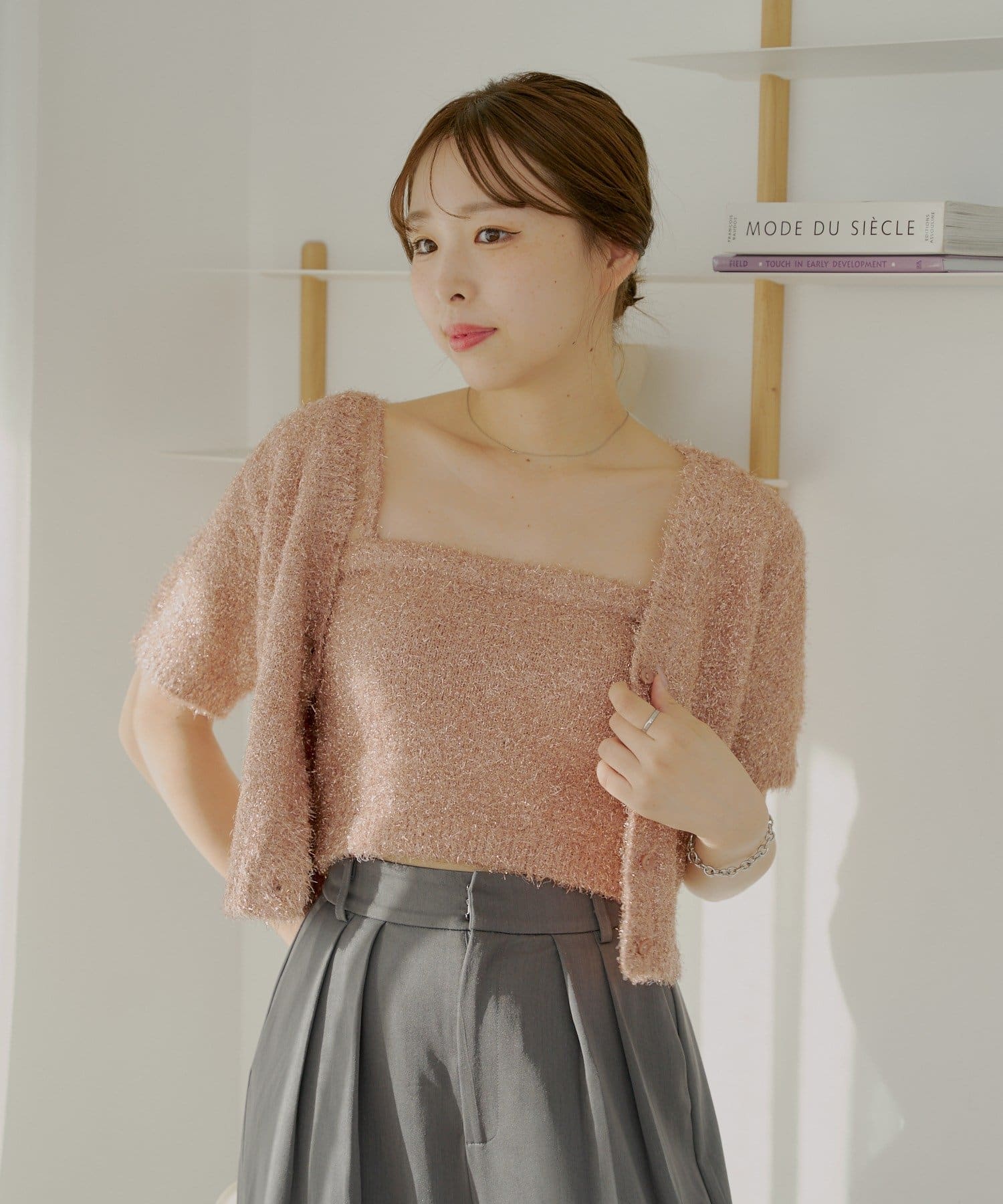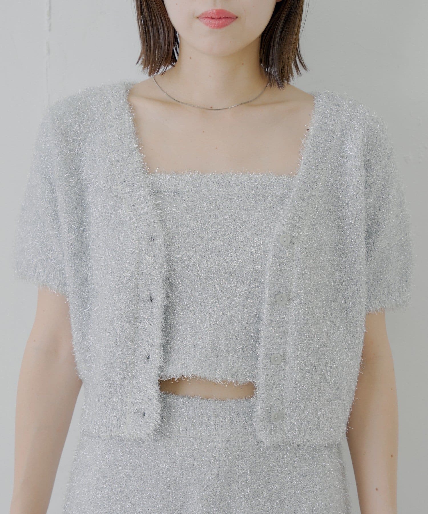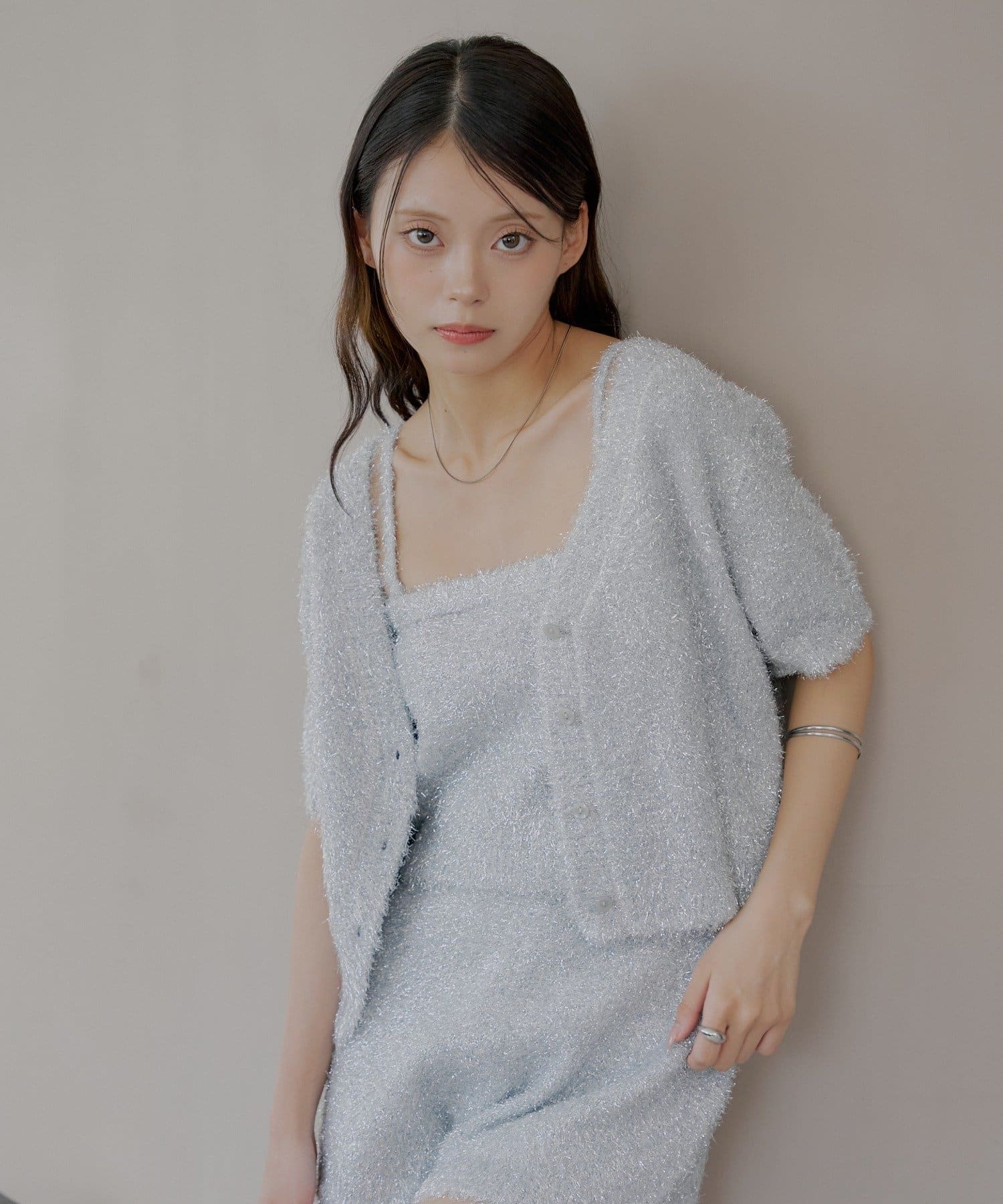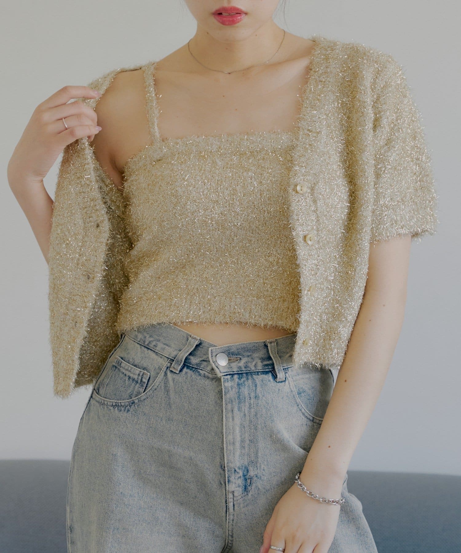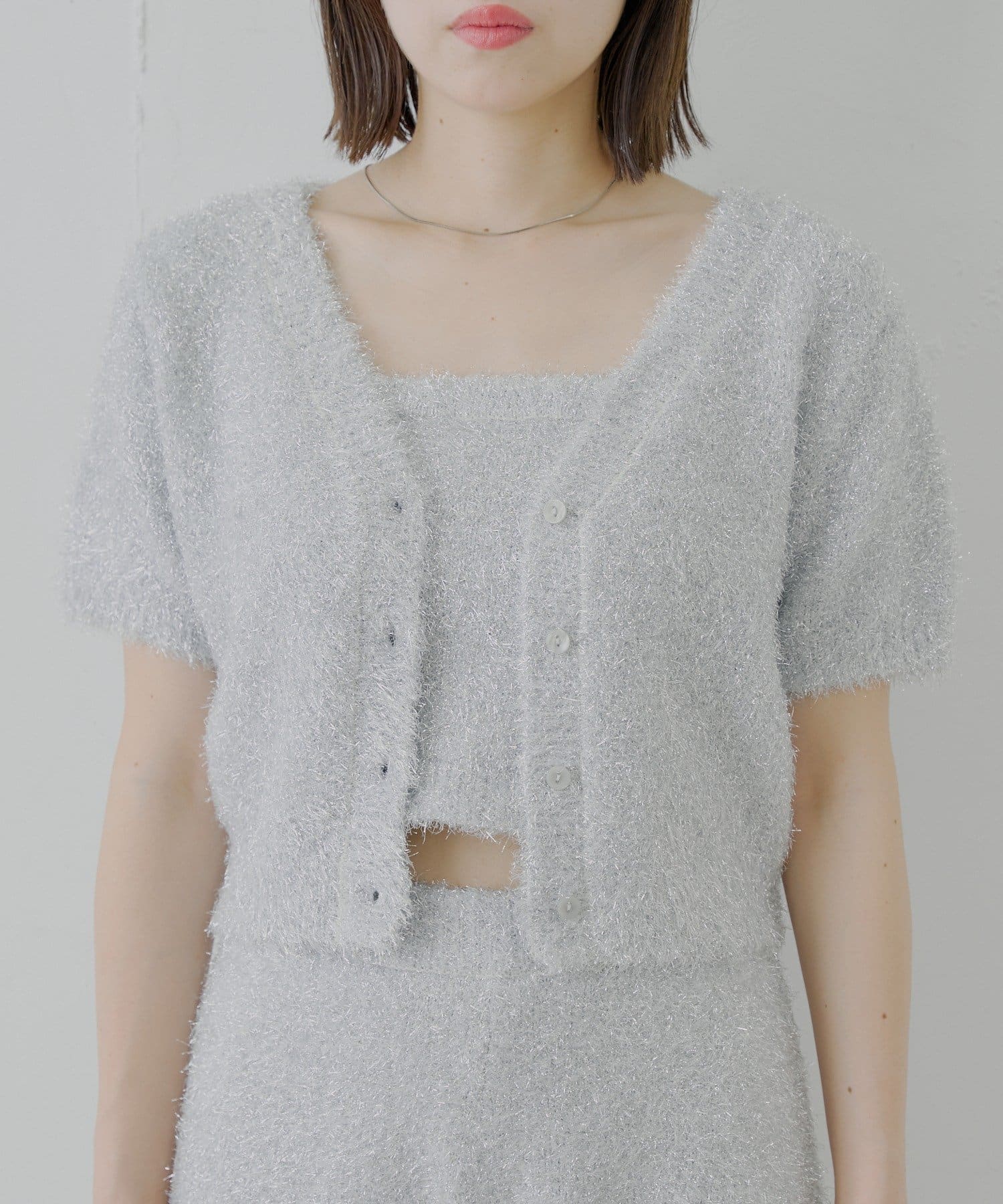 ふわふわのシャギーニットに繊細なラメを織り込んだカーディガン+ベアキャミセット