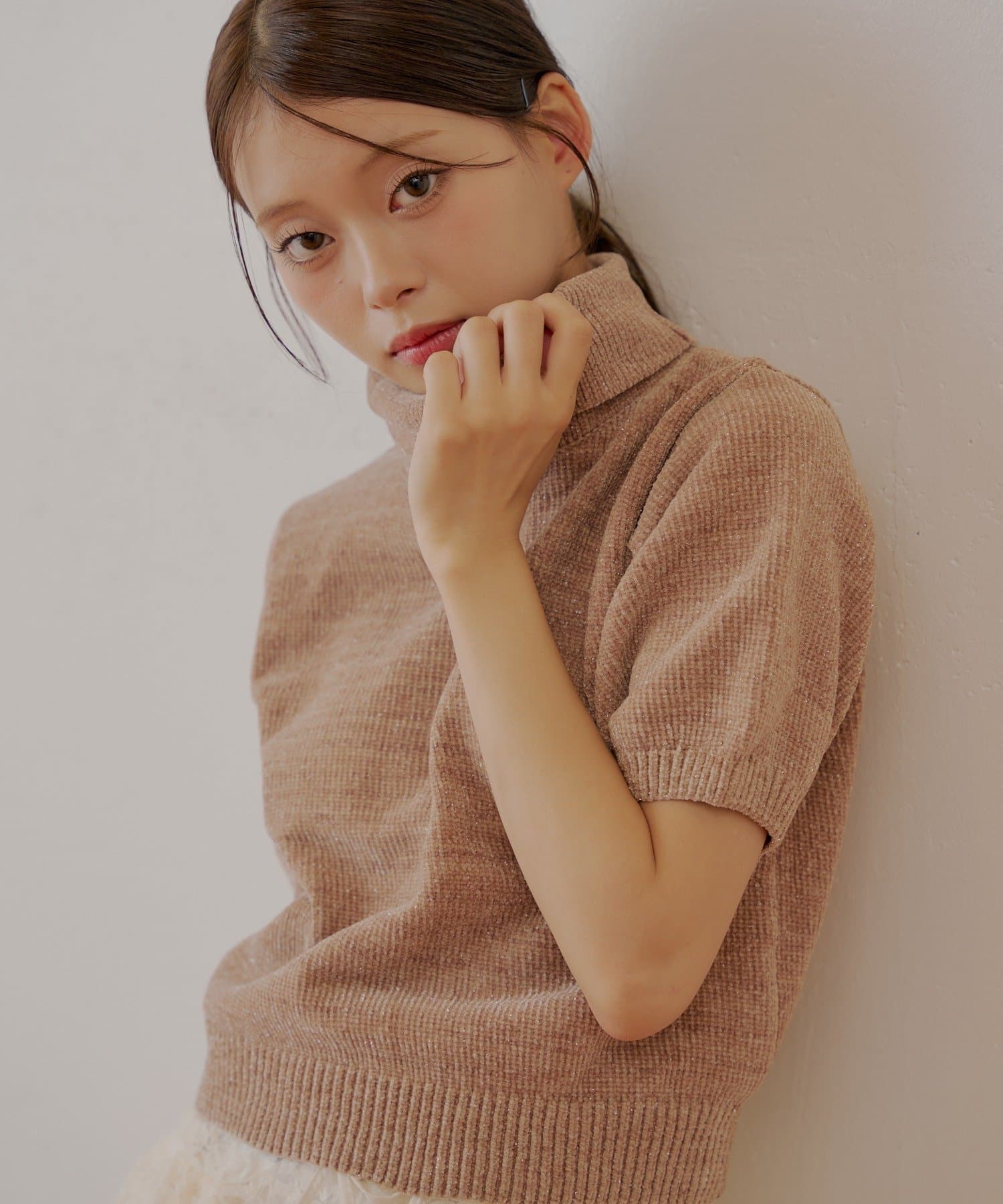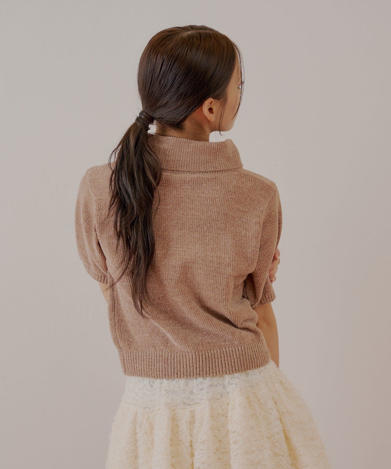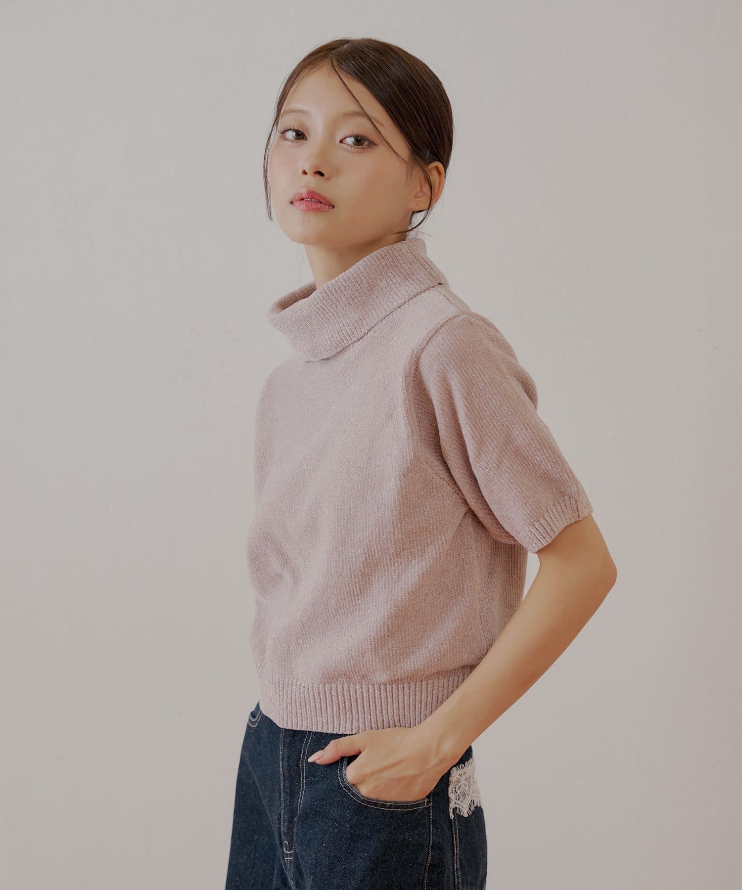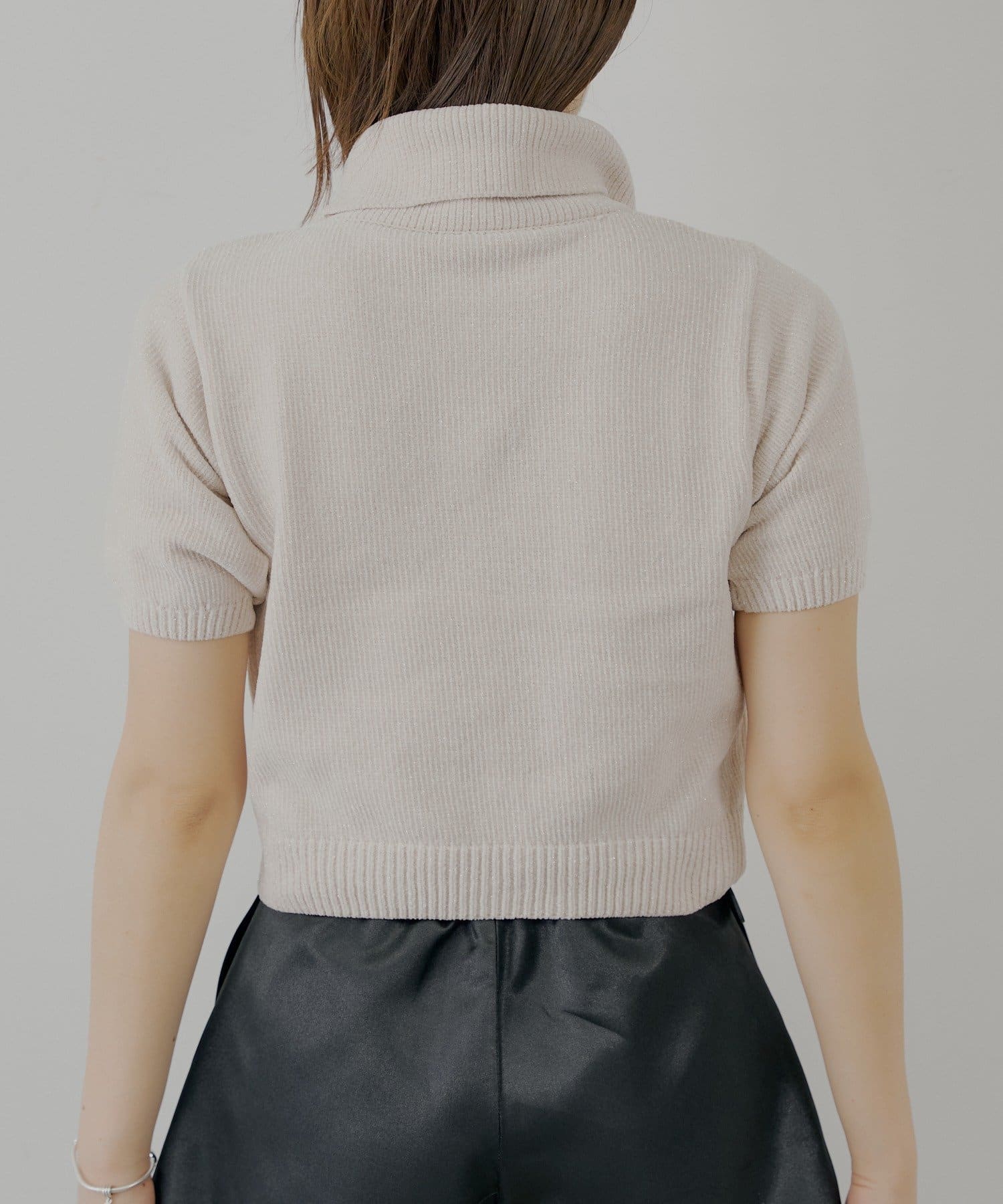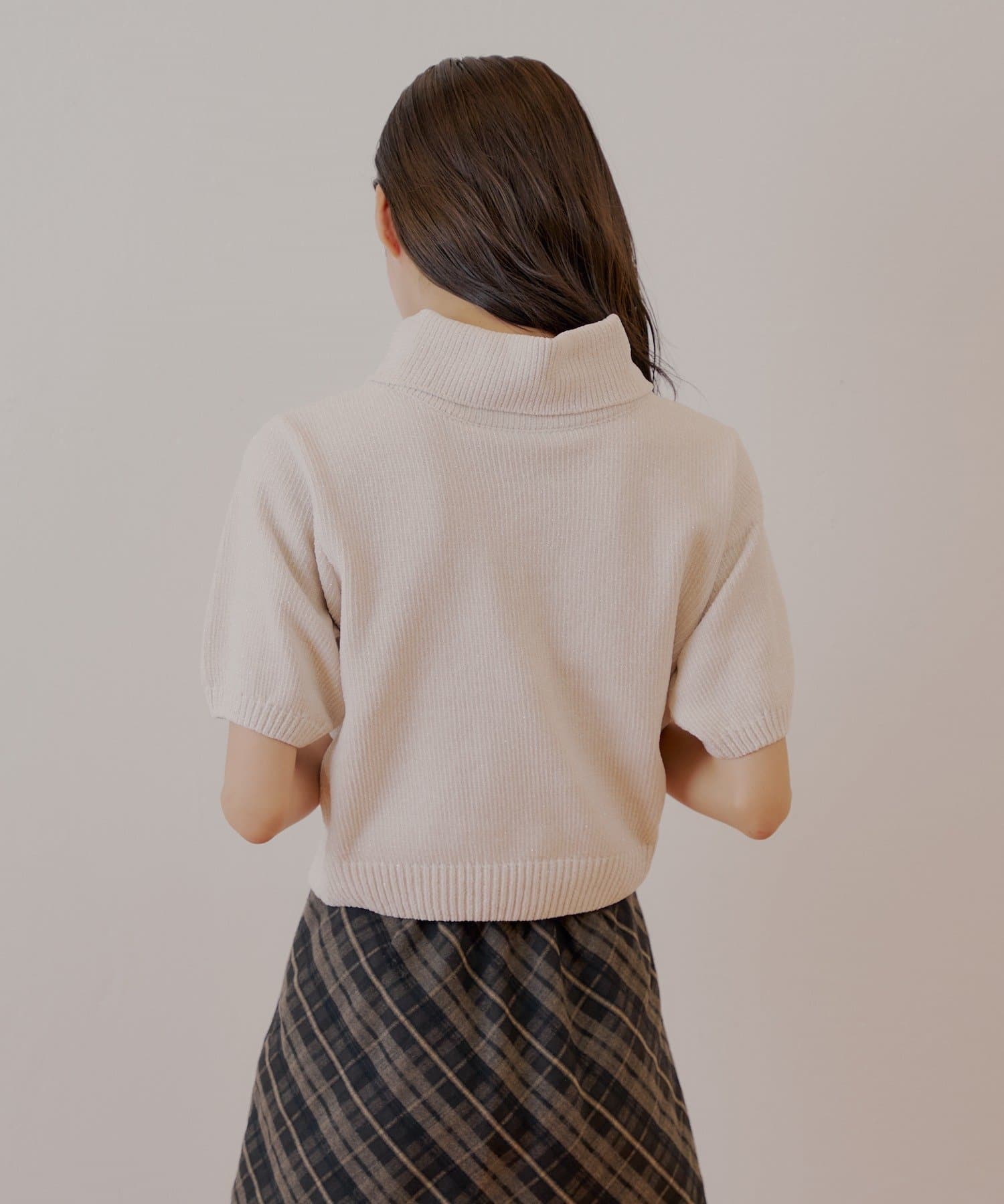 上品な光沢を放つラメベロアが魅力のタートル半袖ニット登場!