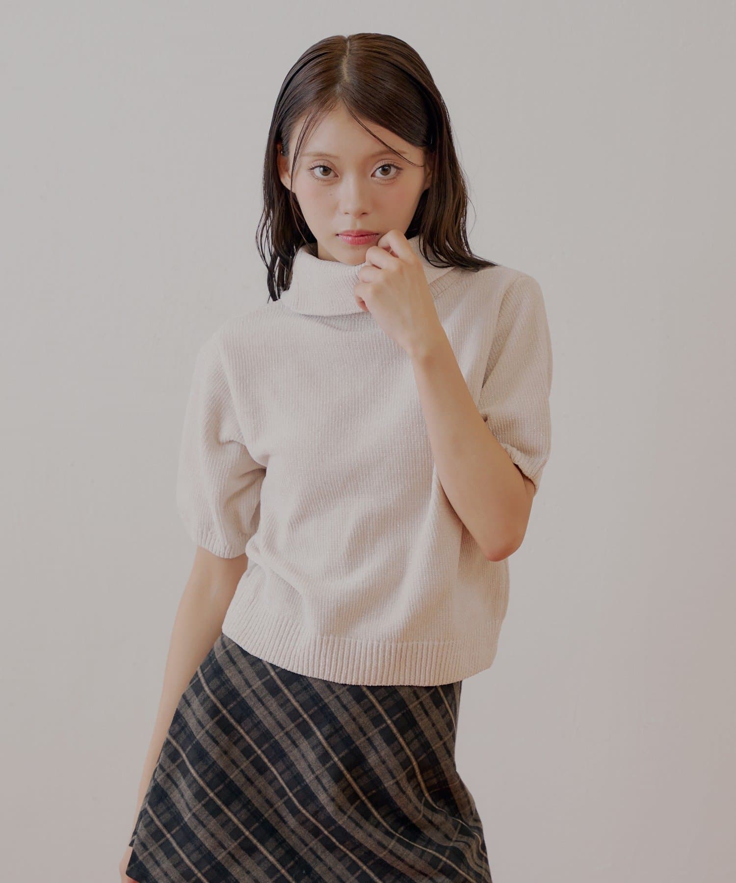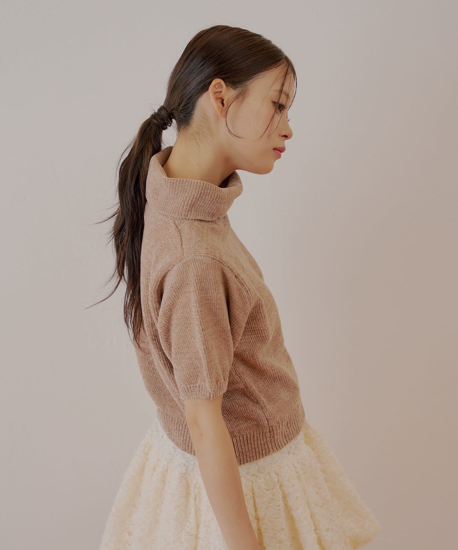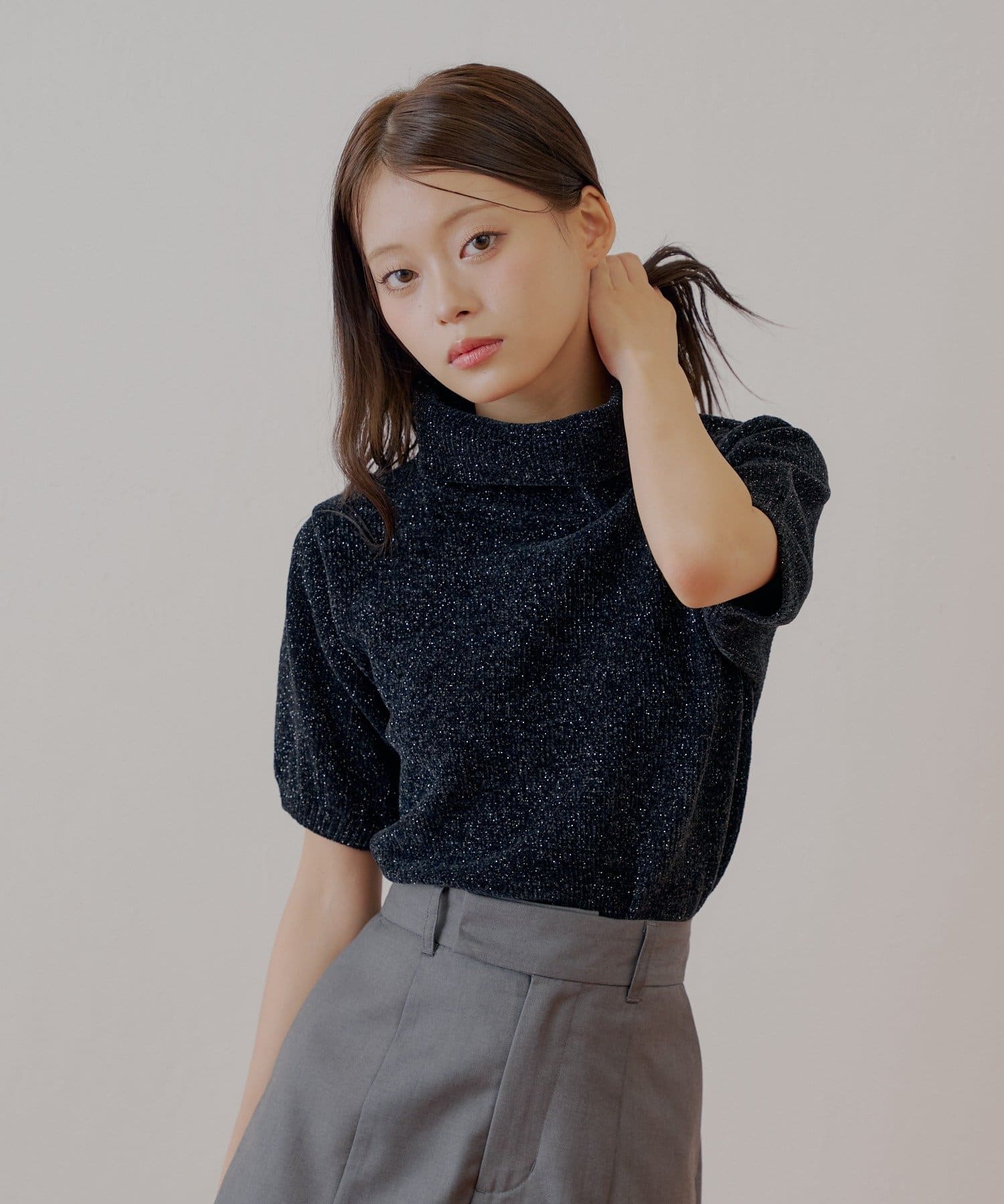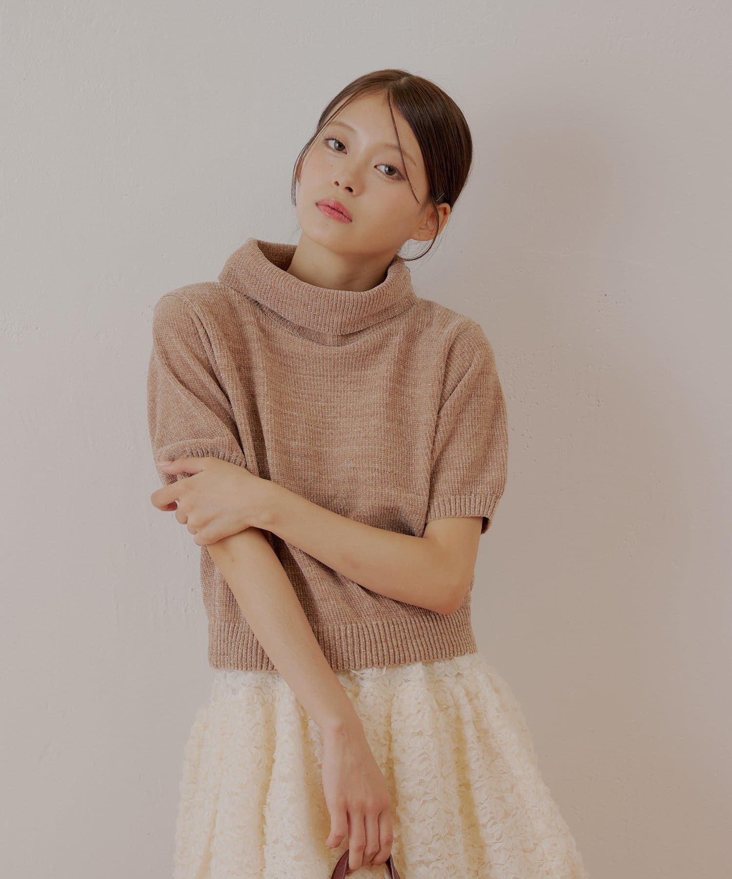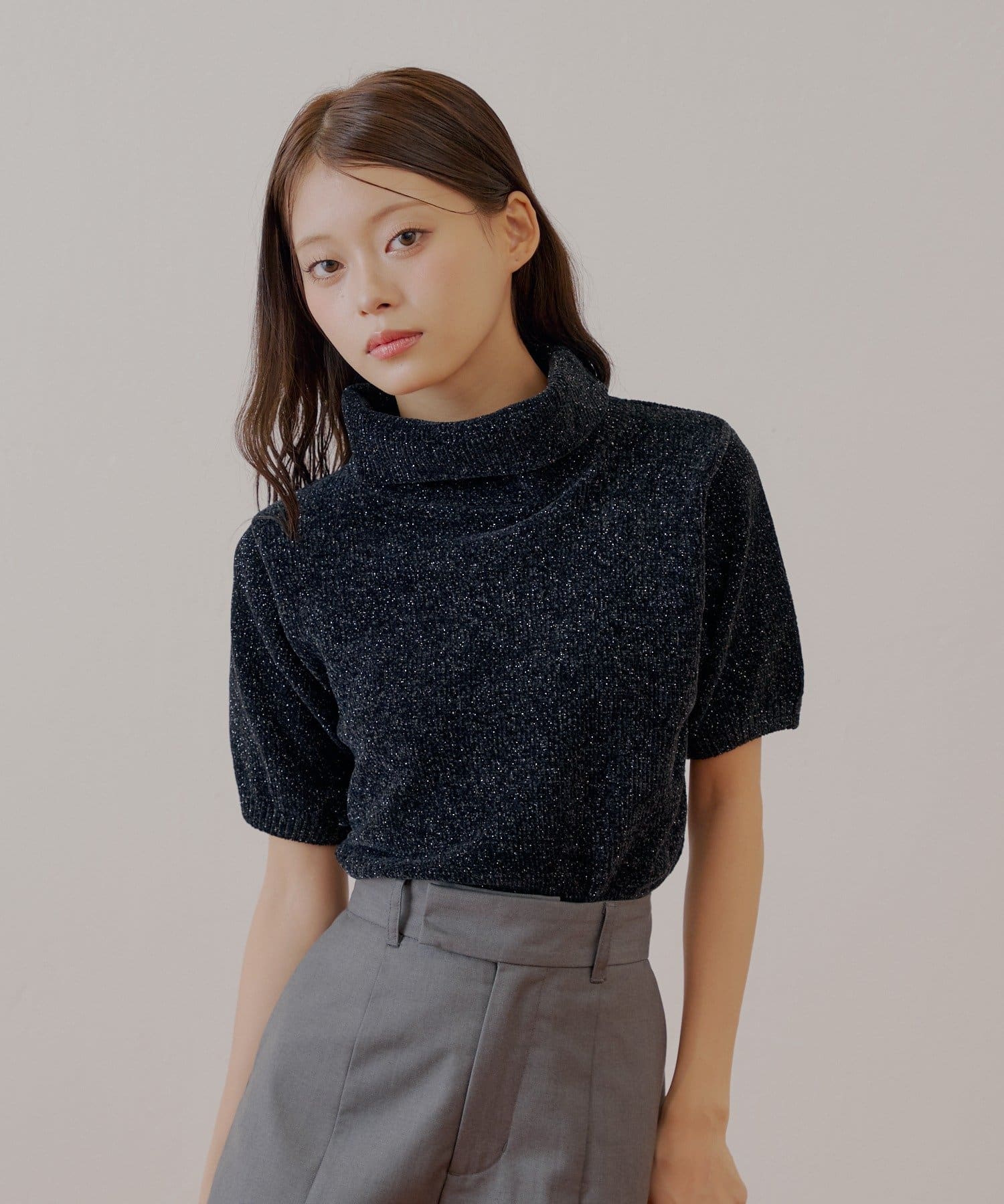 上品な光沢を放つラメベロアが魅力のタートル半袖ニット登場!