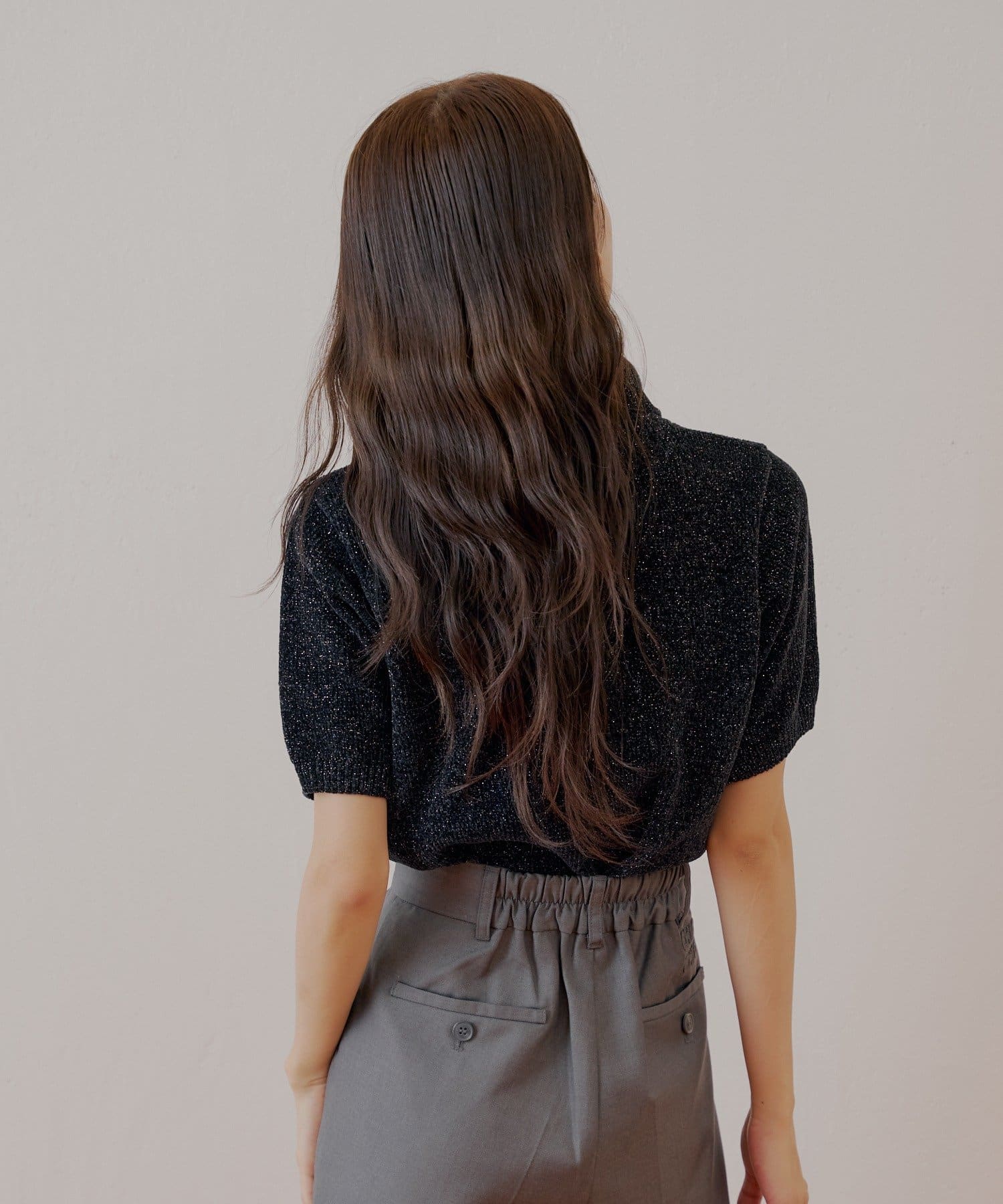 ・上品な光沢を放つラメベロア素材が、着こなしに華やかさを添える半袖ニット。
