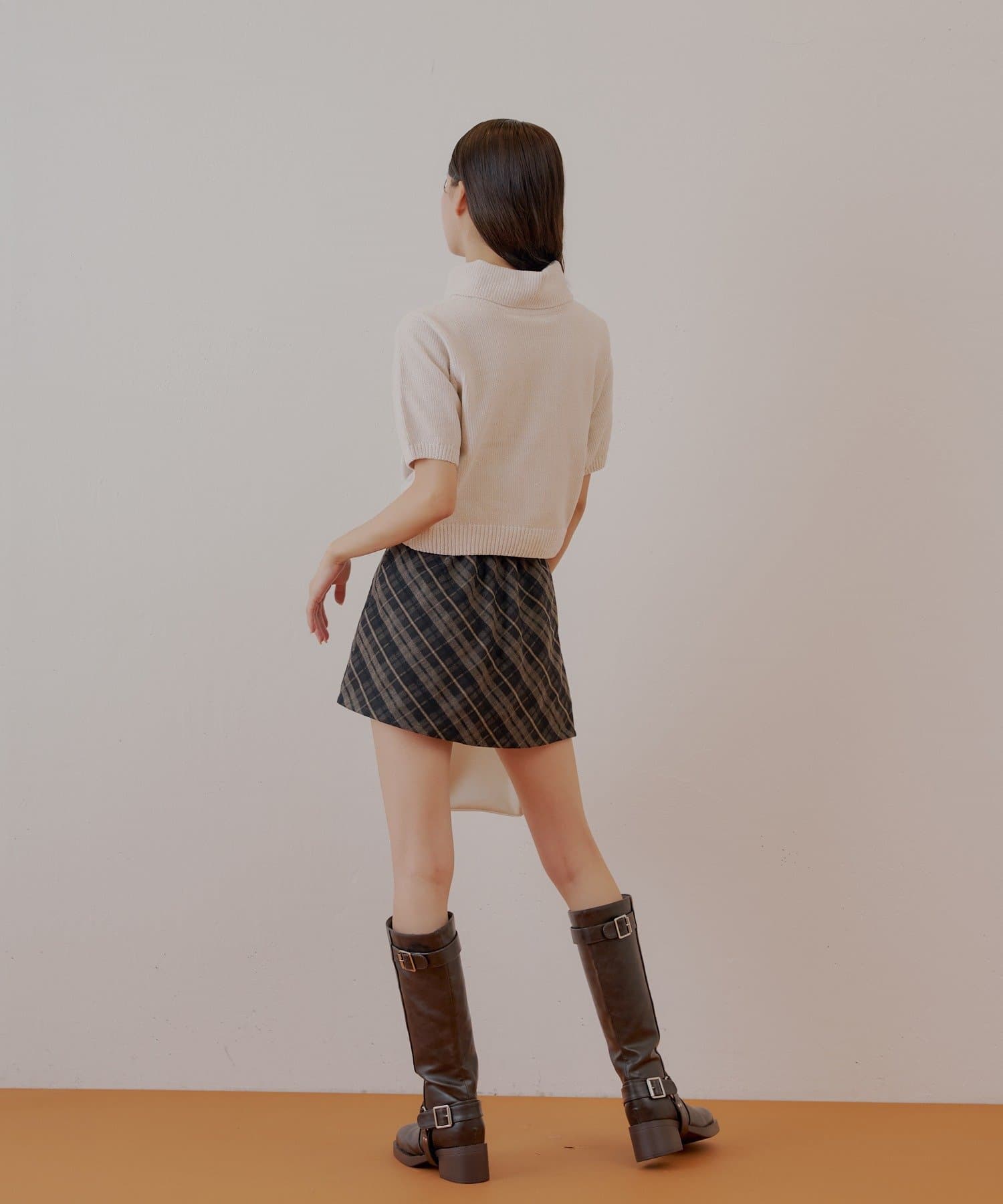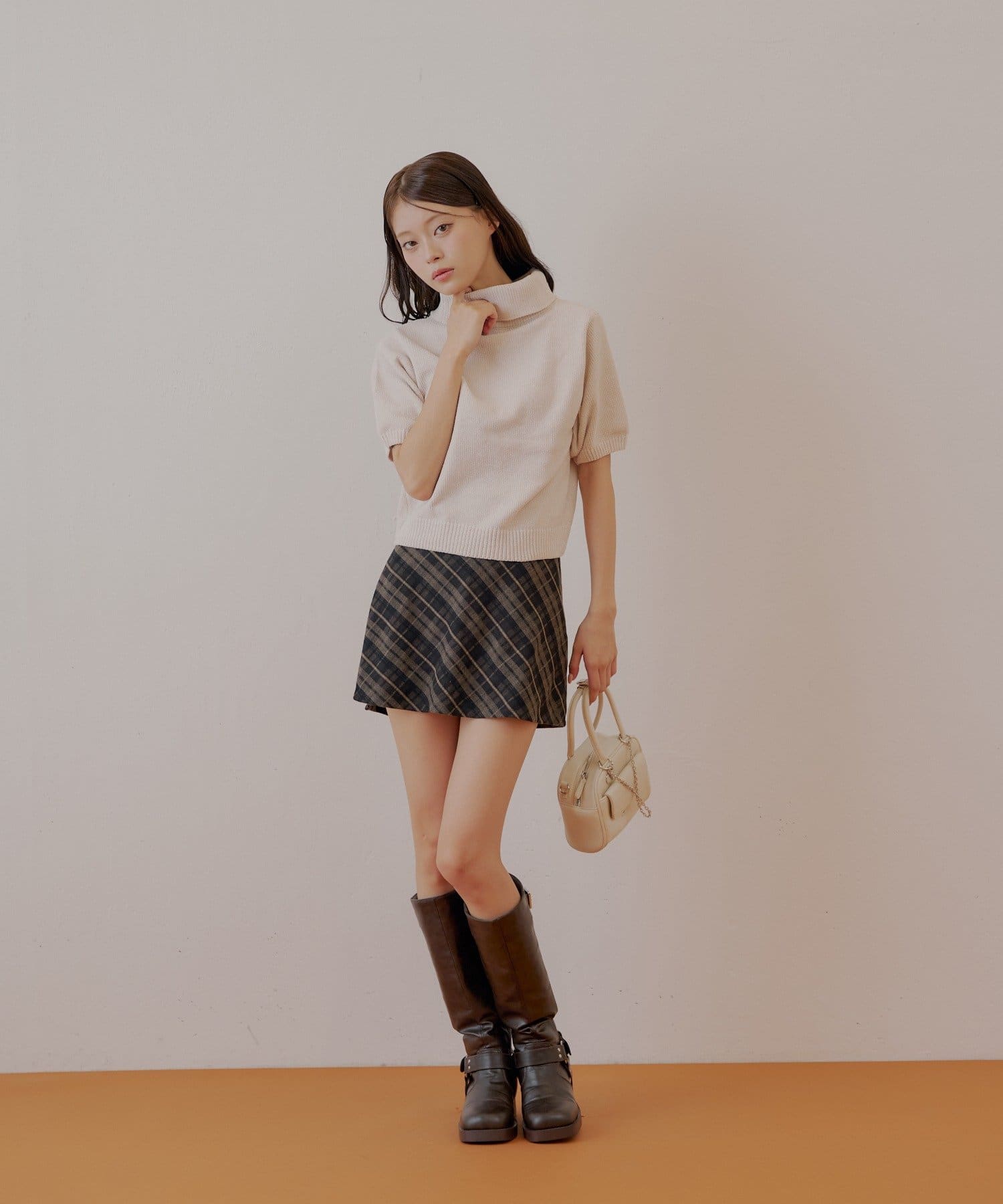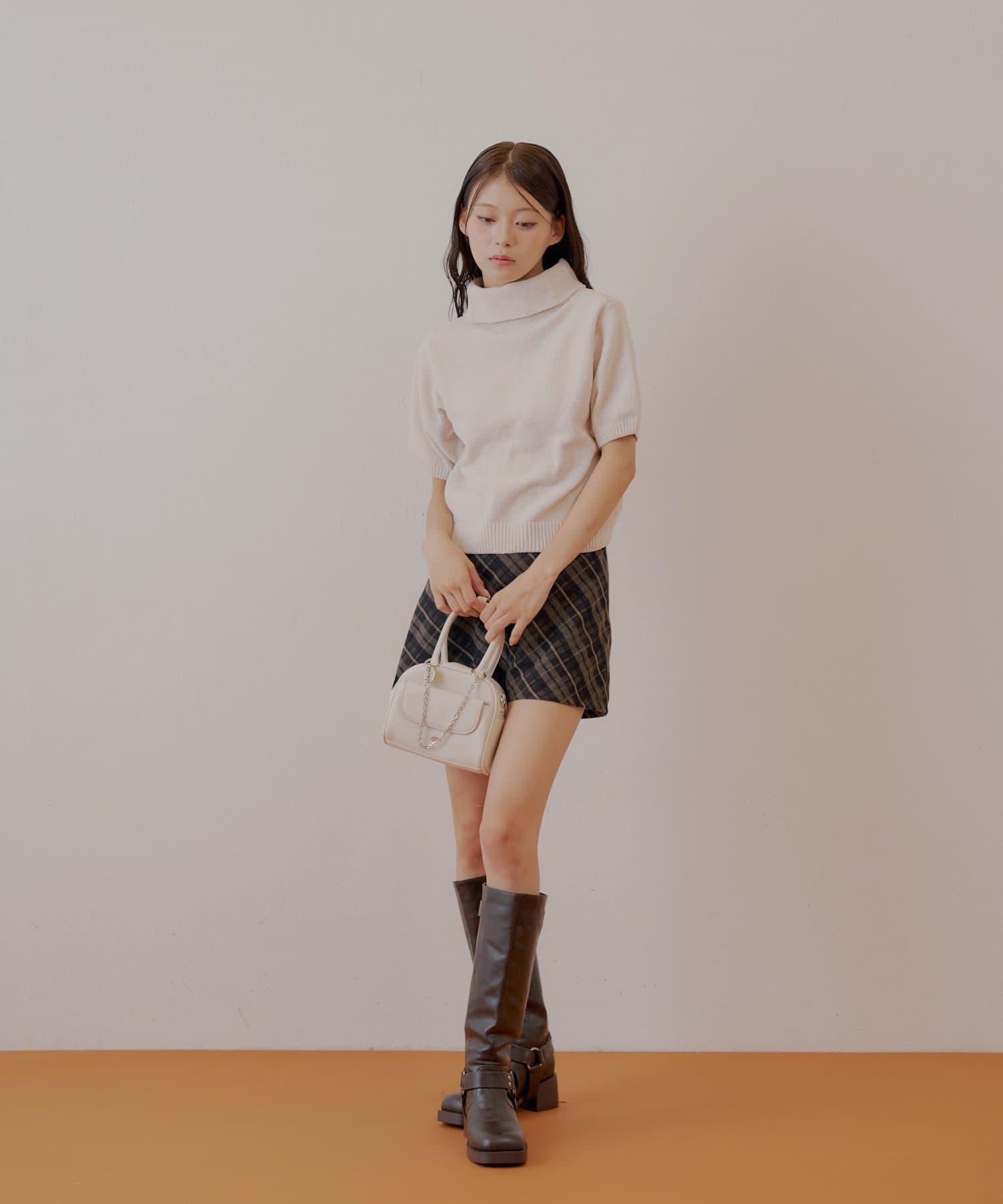 ・シンプルなデザインなため、チェックなどの柄物アイテムとも好相性です。