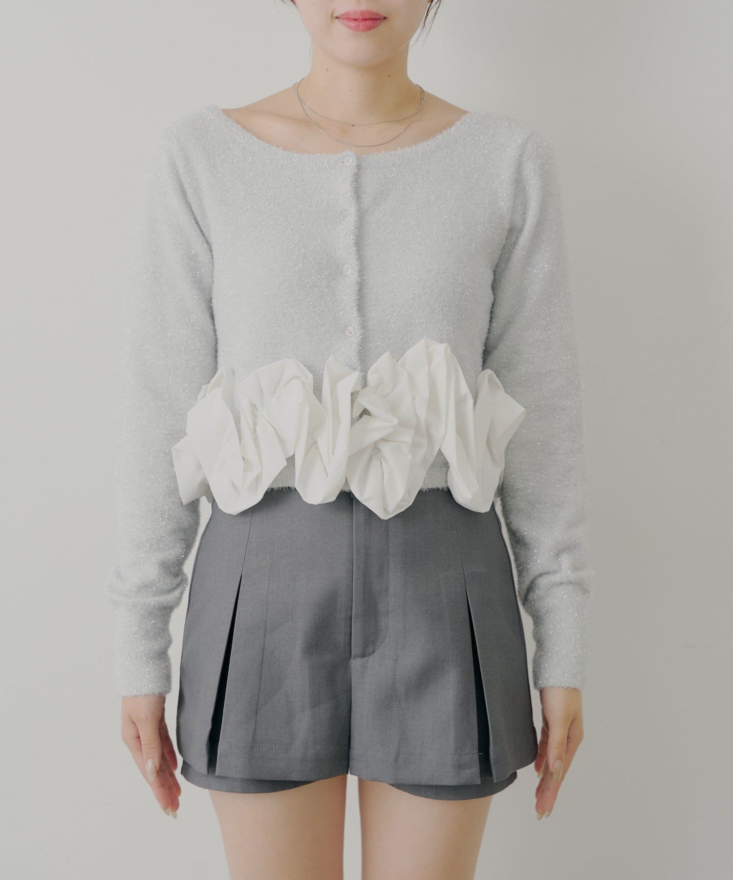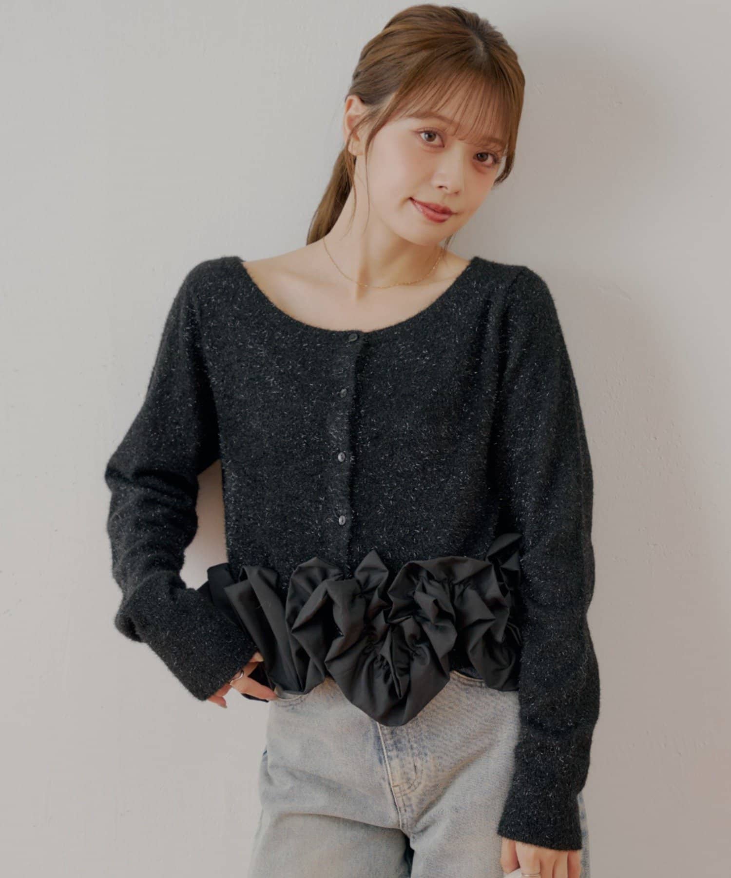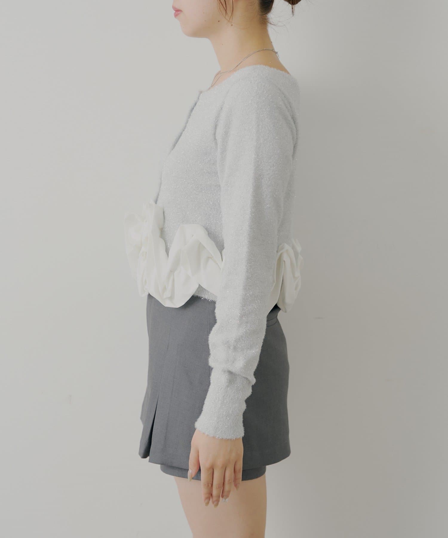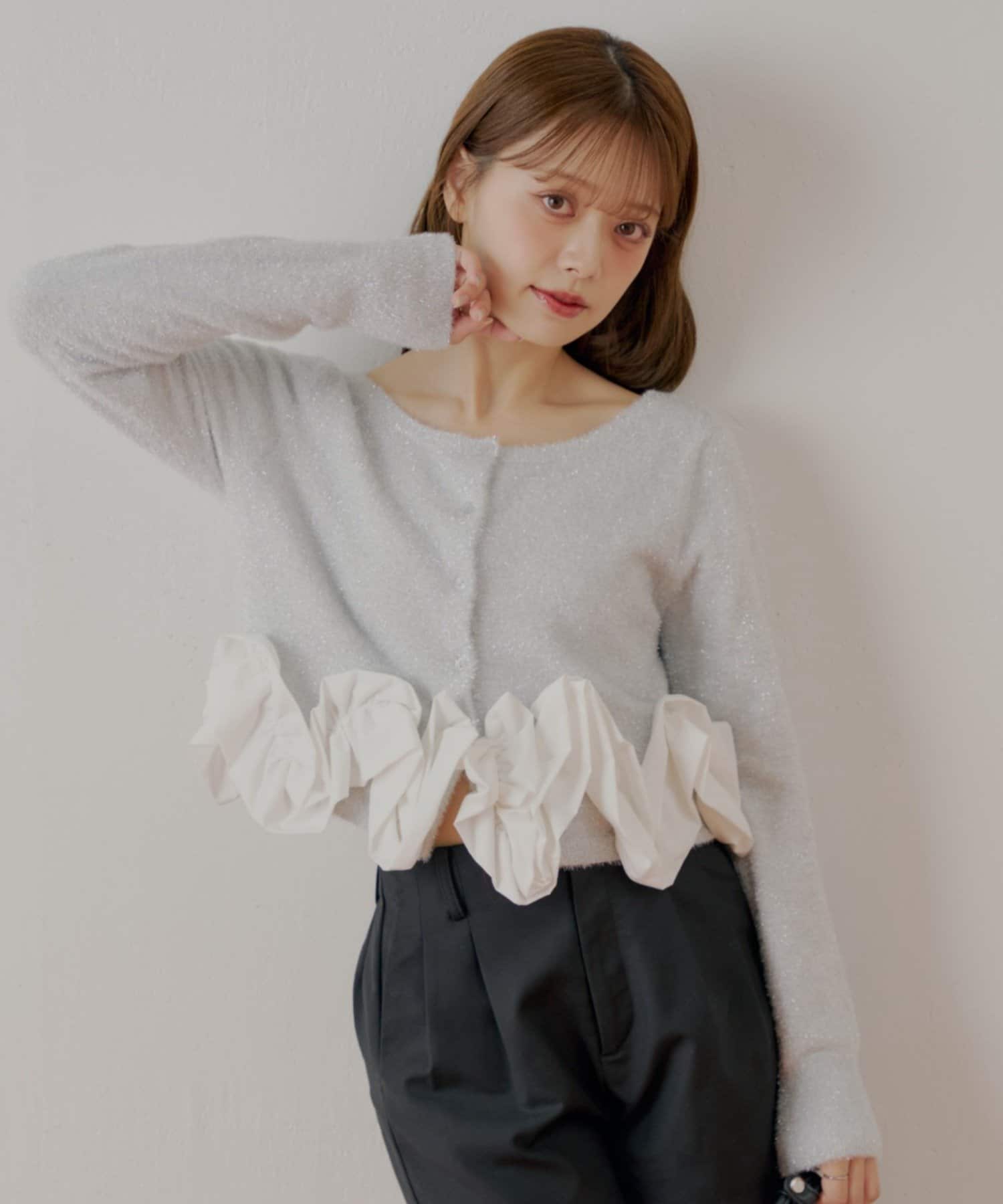 ニットとシャツのドッキングがポイントのラメカーディガン