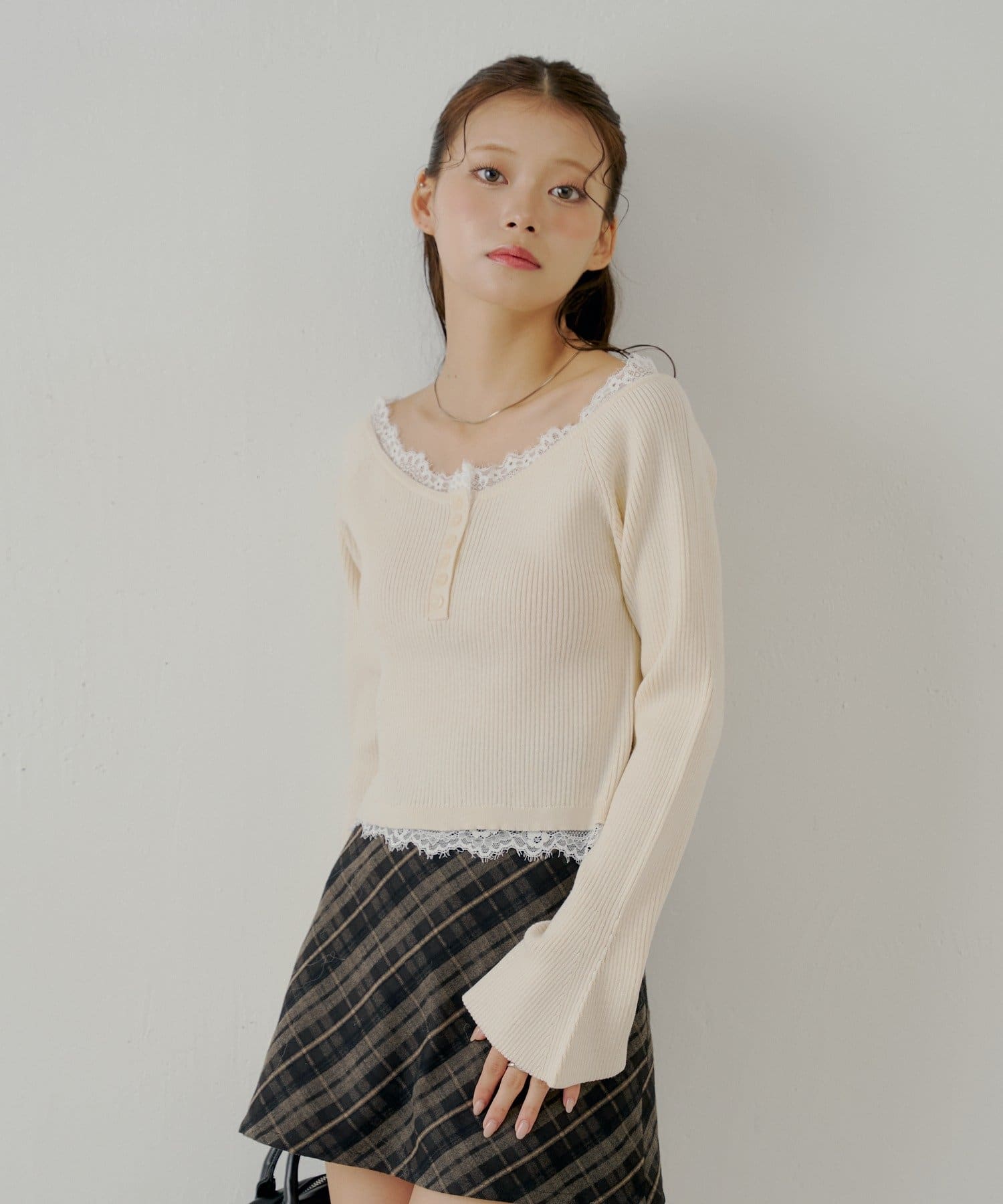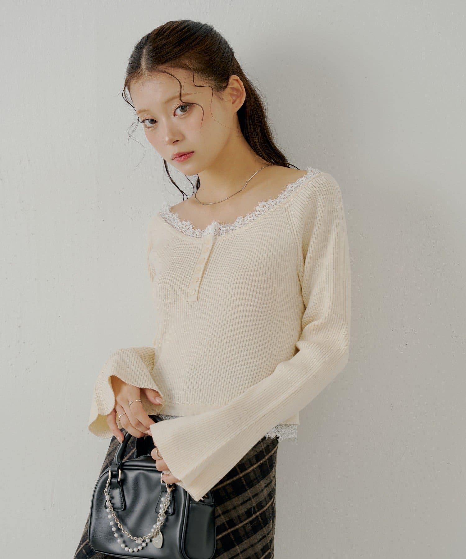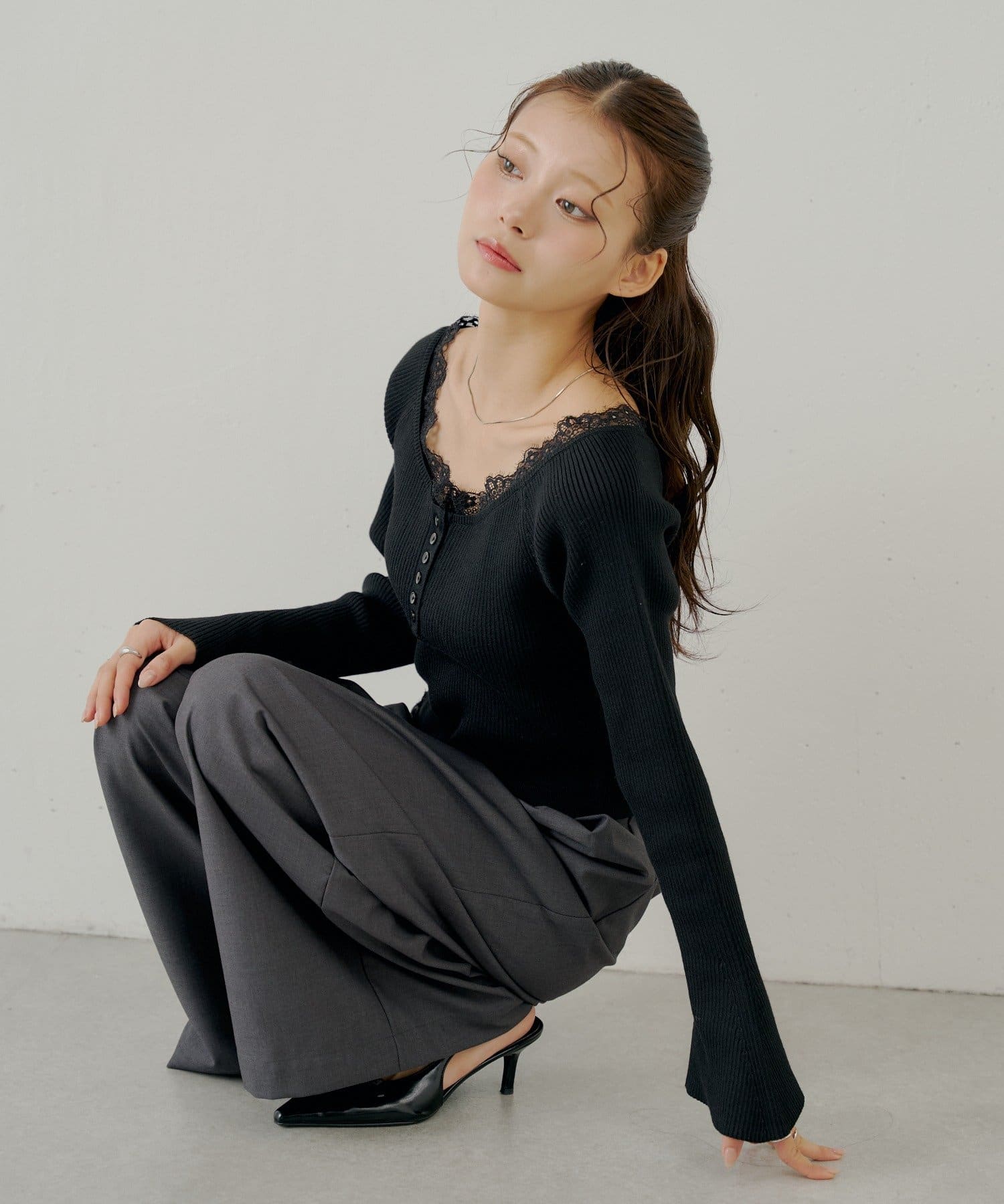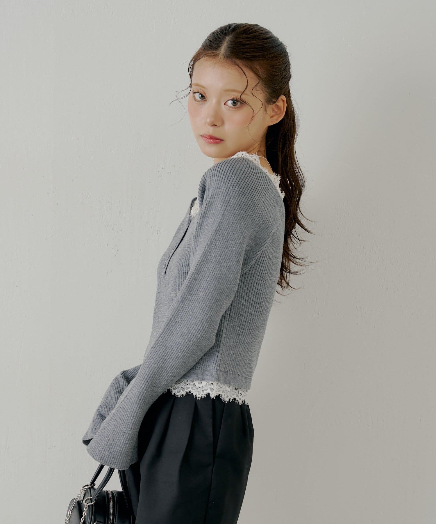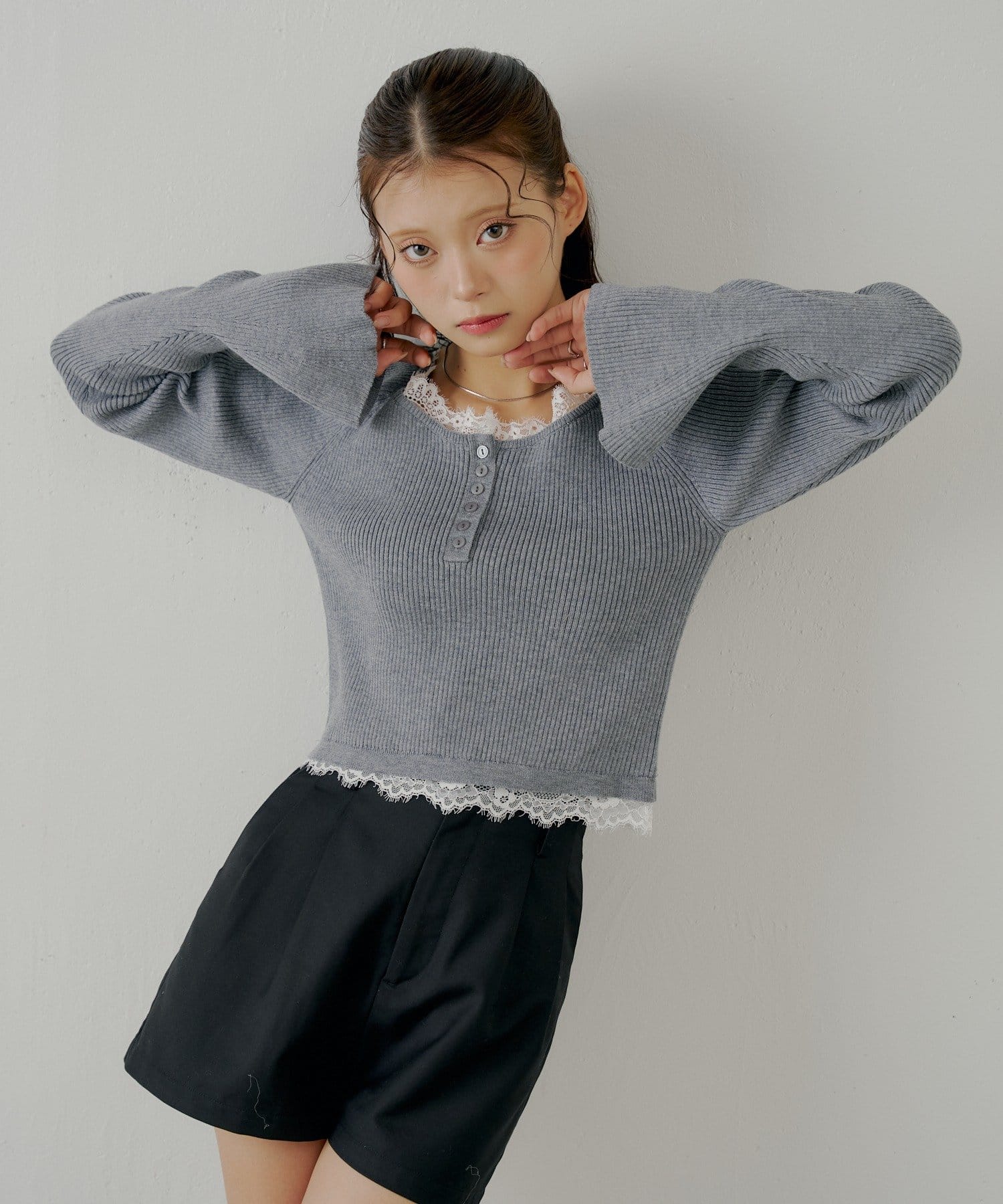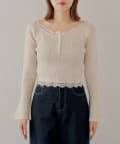 ・ネックラインと裾にあしらわれたレースが、大人の甘さを引き出すヘンリーニット。