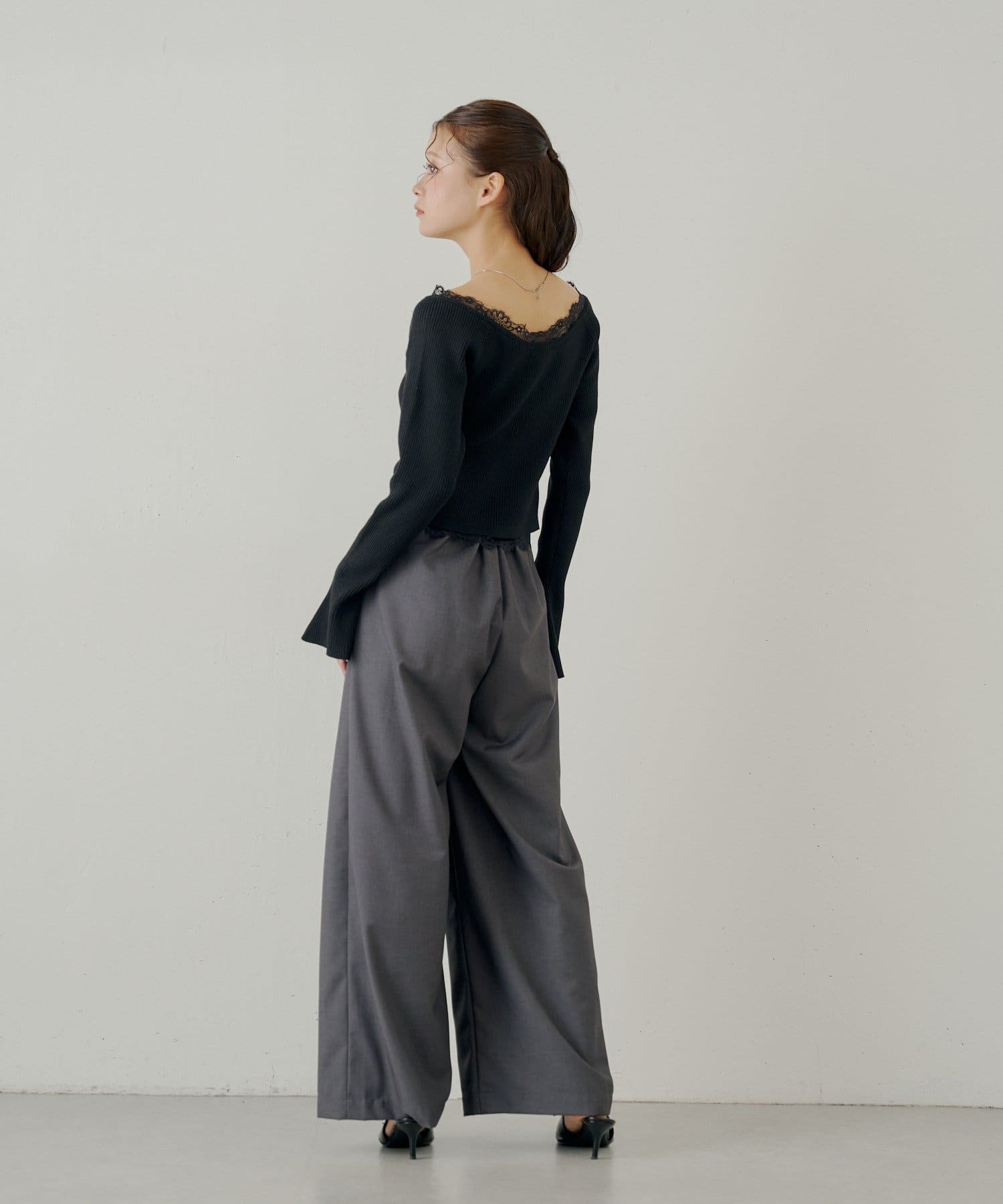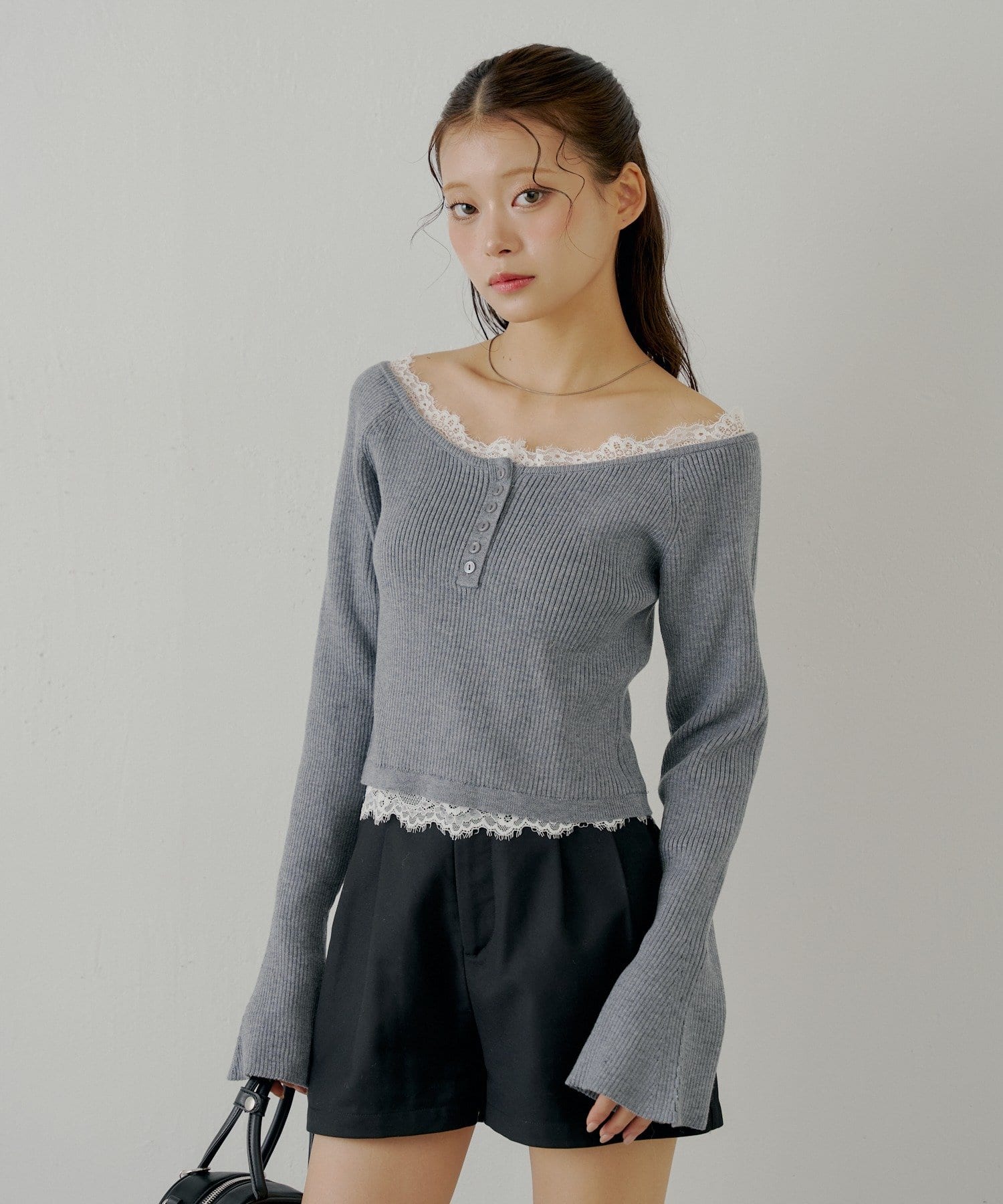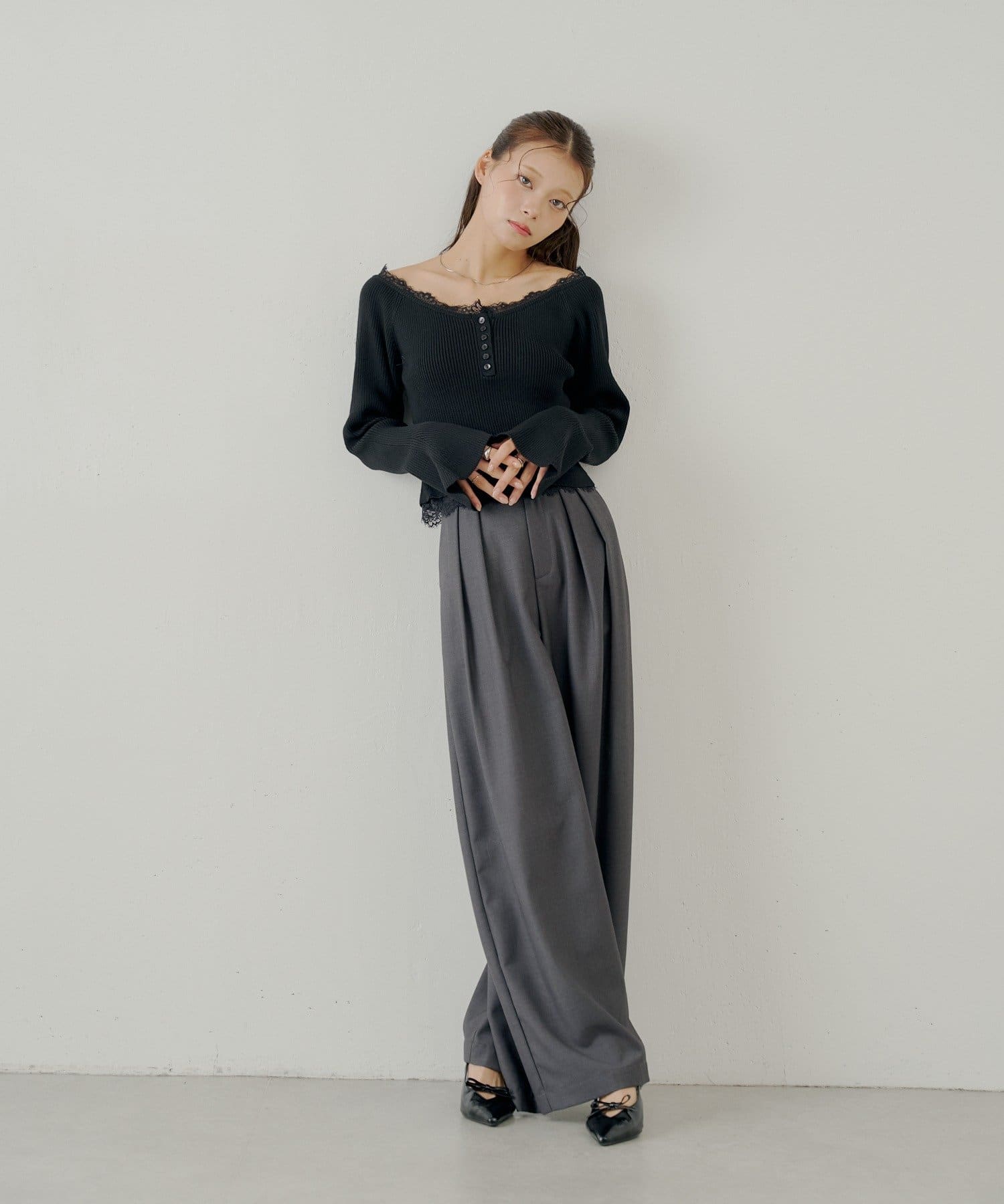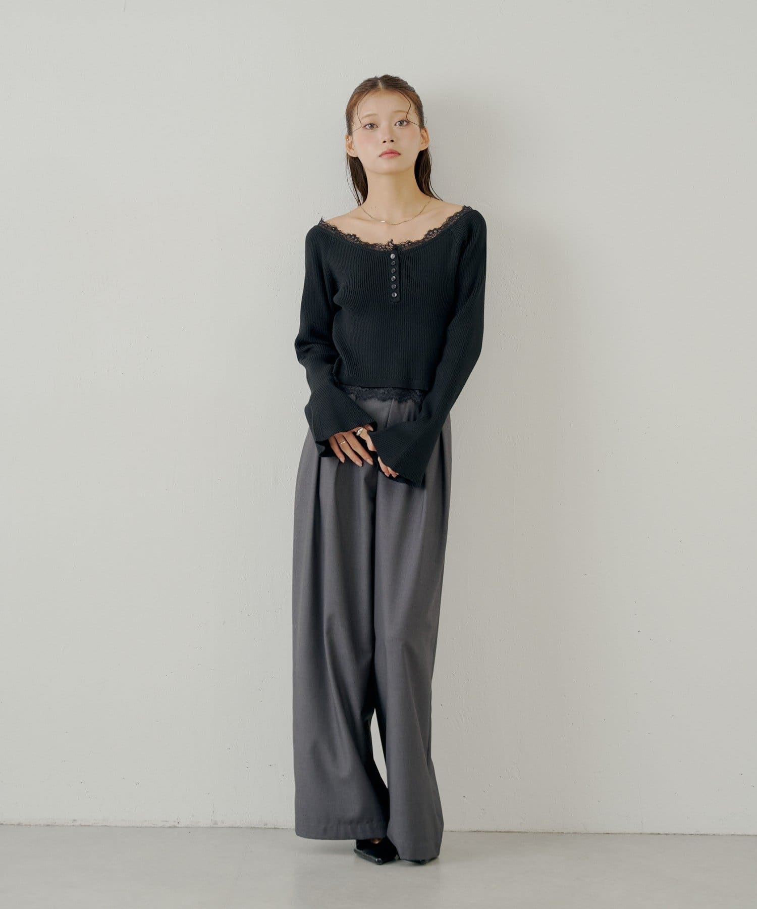 繊細なレースが、大人の甘さを引き出すオフショルレースヘンリーニット