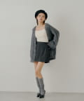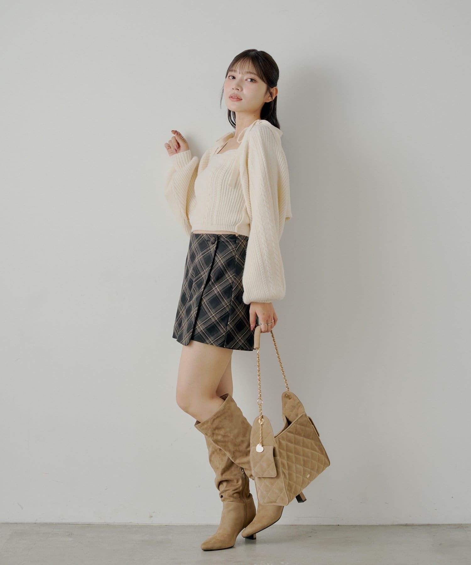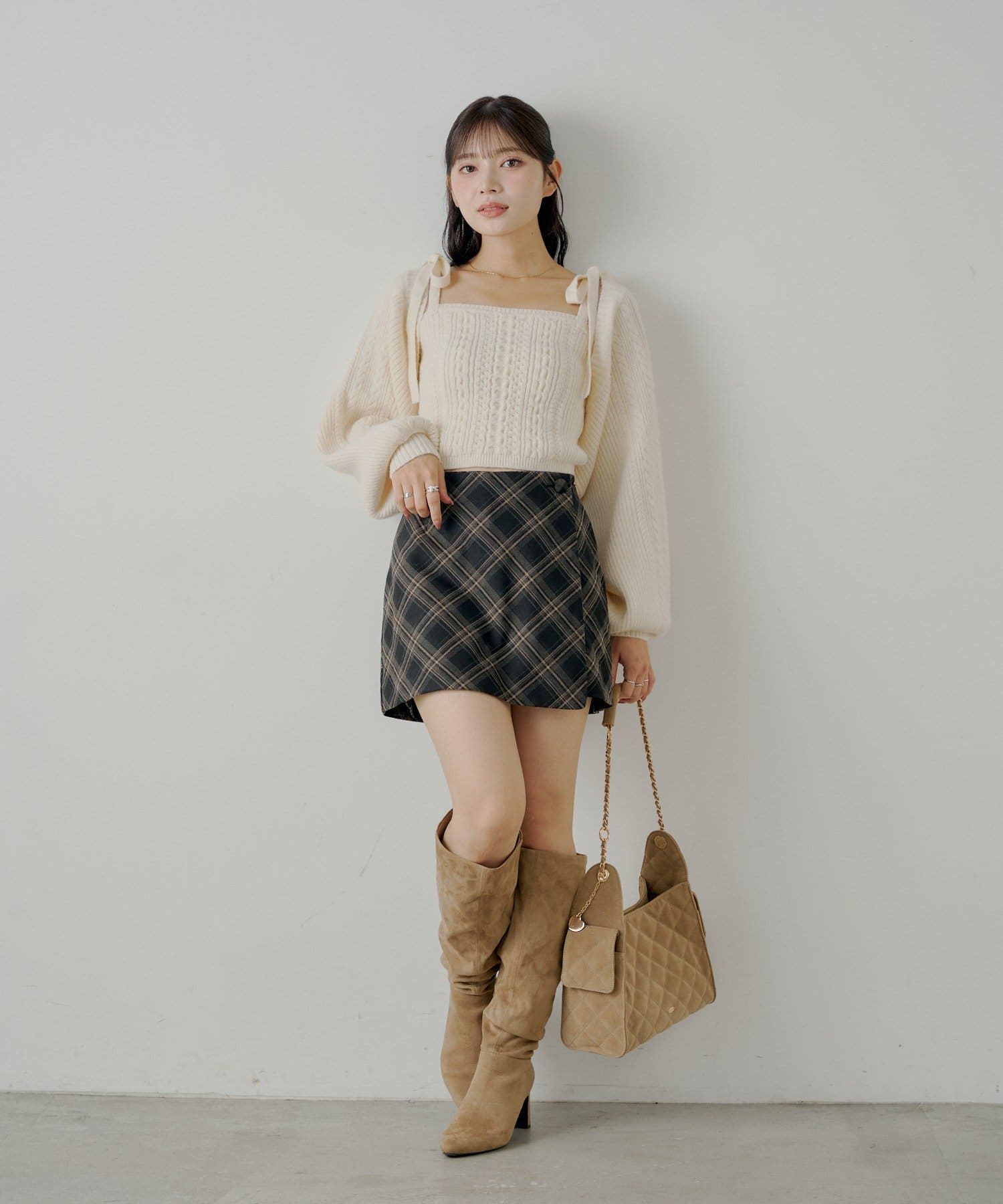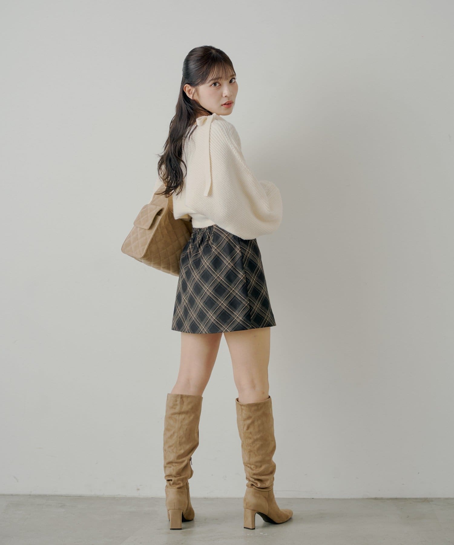・ショートブーツやロングブーツなど足元にボリュームを出すことで、ミニ丈とのバランスが取れ、スタイルアップ効果も◎
