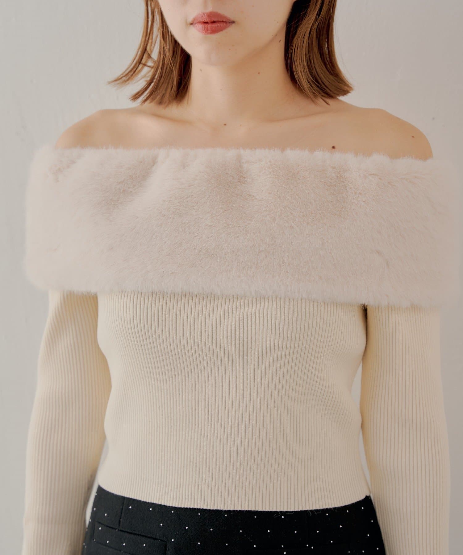 ・ふんわりと柔らかなボリュームファーが、デコルテを美しく彩るオフショルニット。