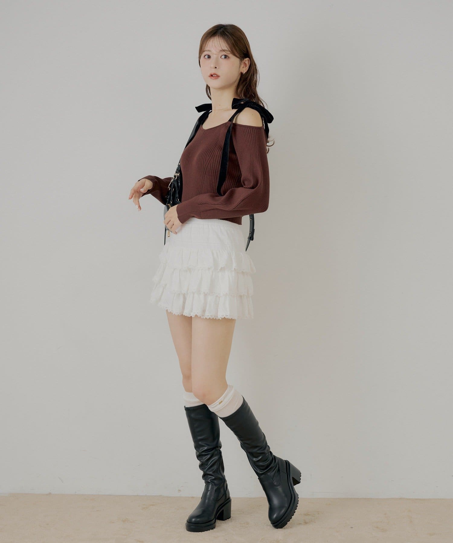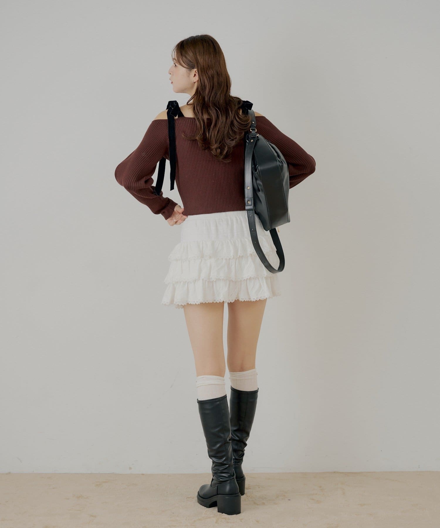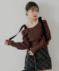 ・肩リボンが、フェミニンな印象をプラスしてくれるオフショルリブニット。