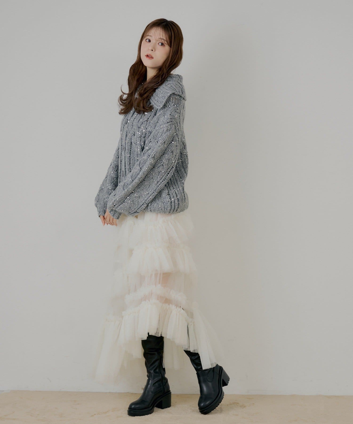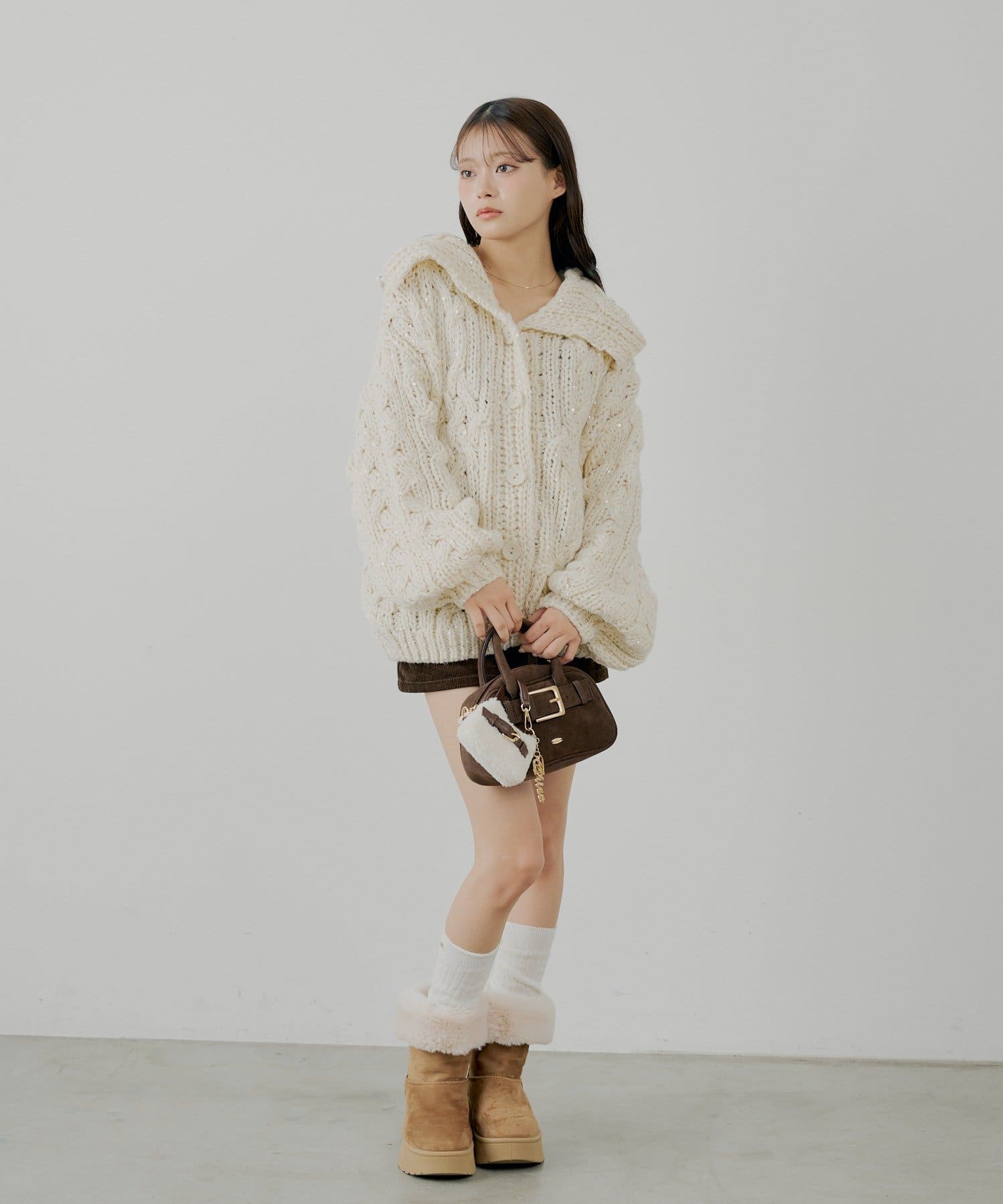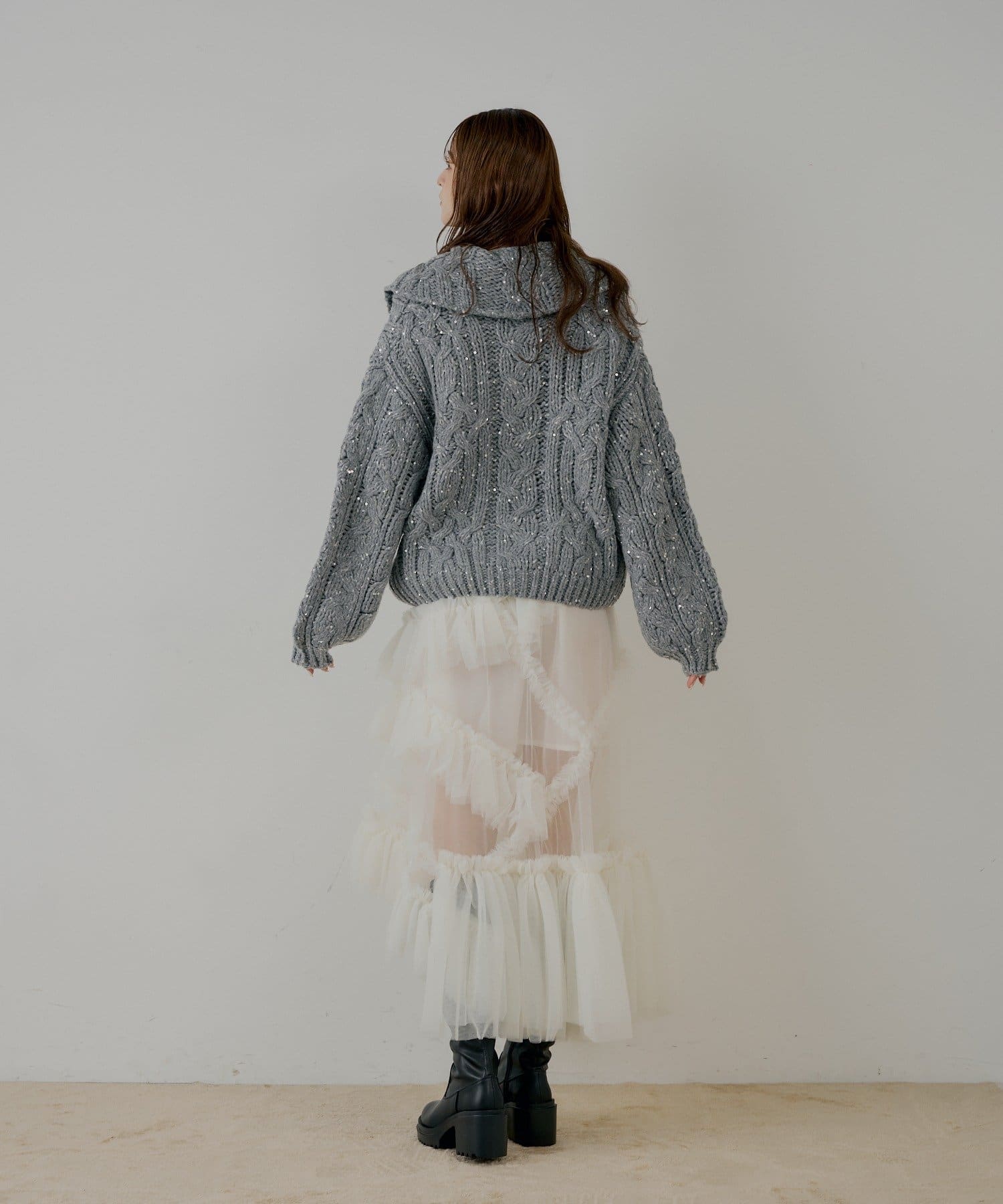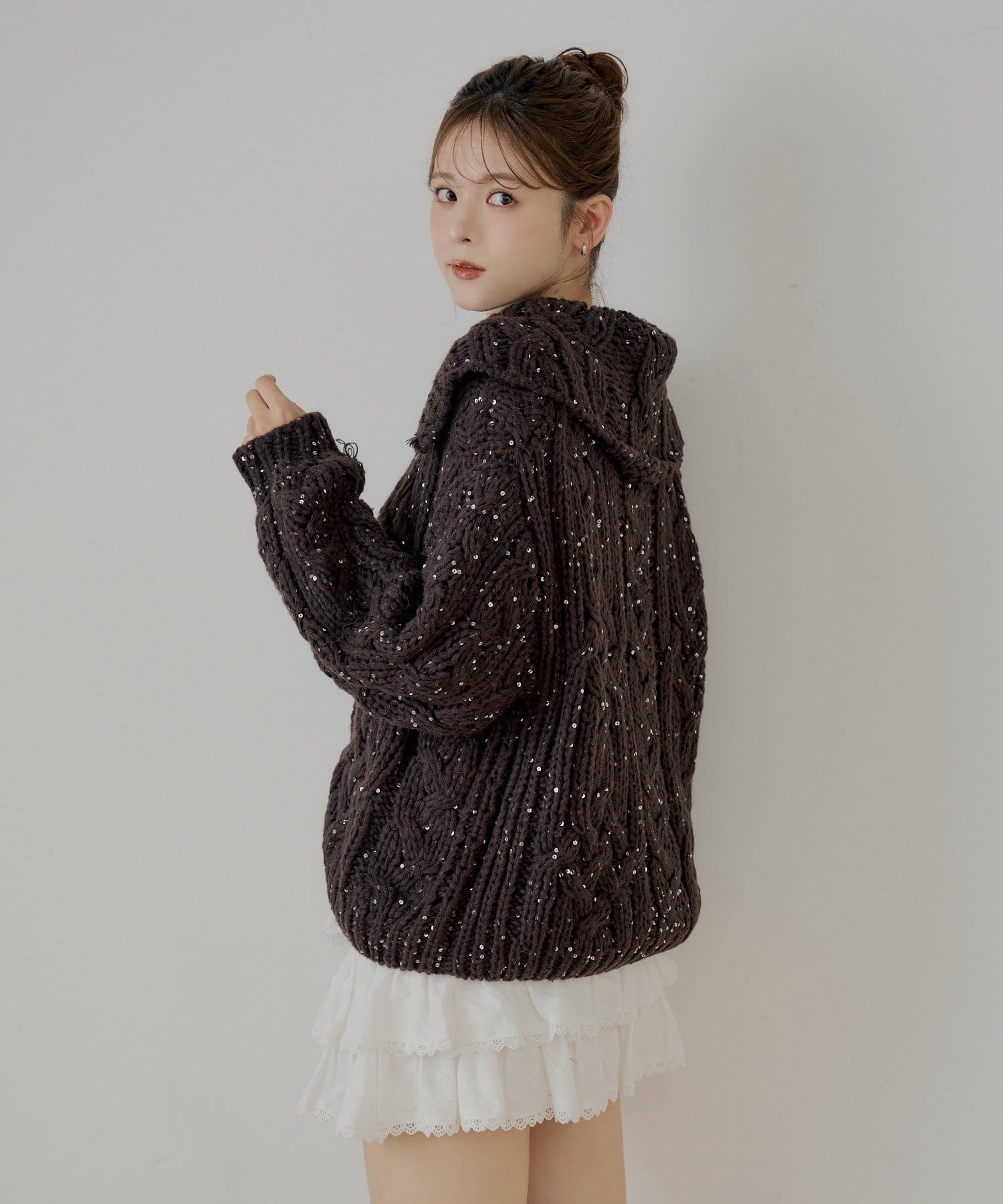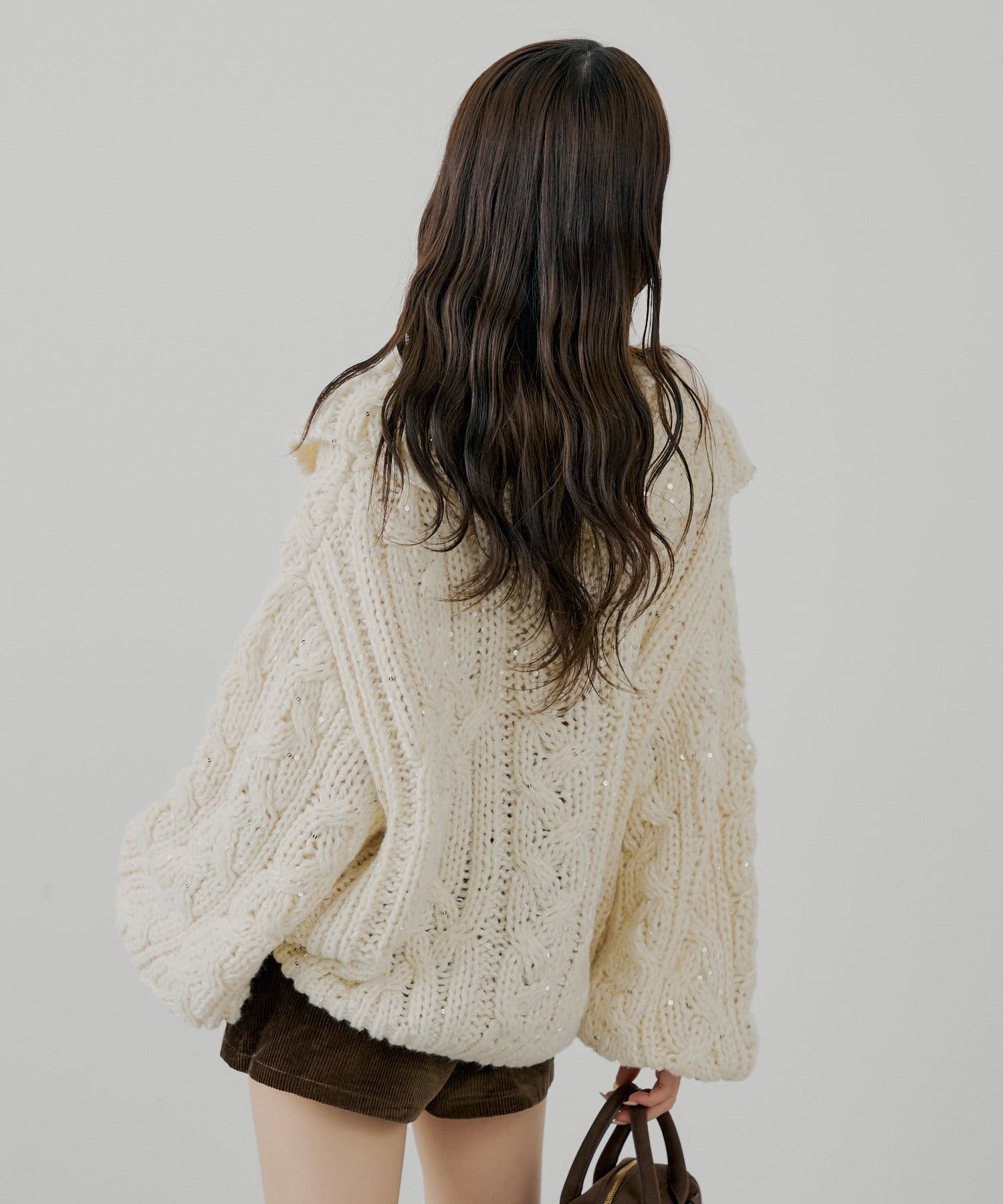 ・ざっくりとしたケーブル編みに、繊細なスパンコールを散りばめたルーズカーディガン。