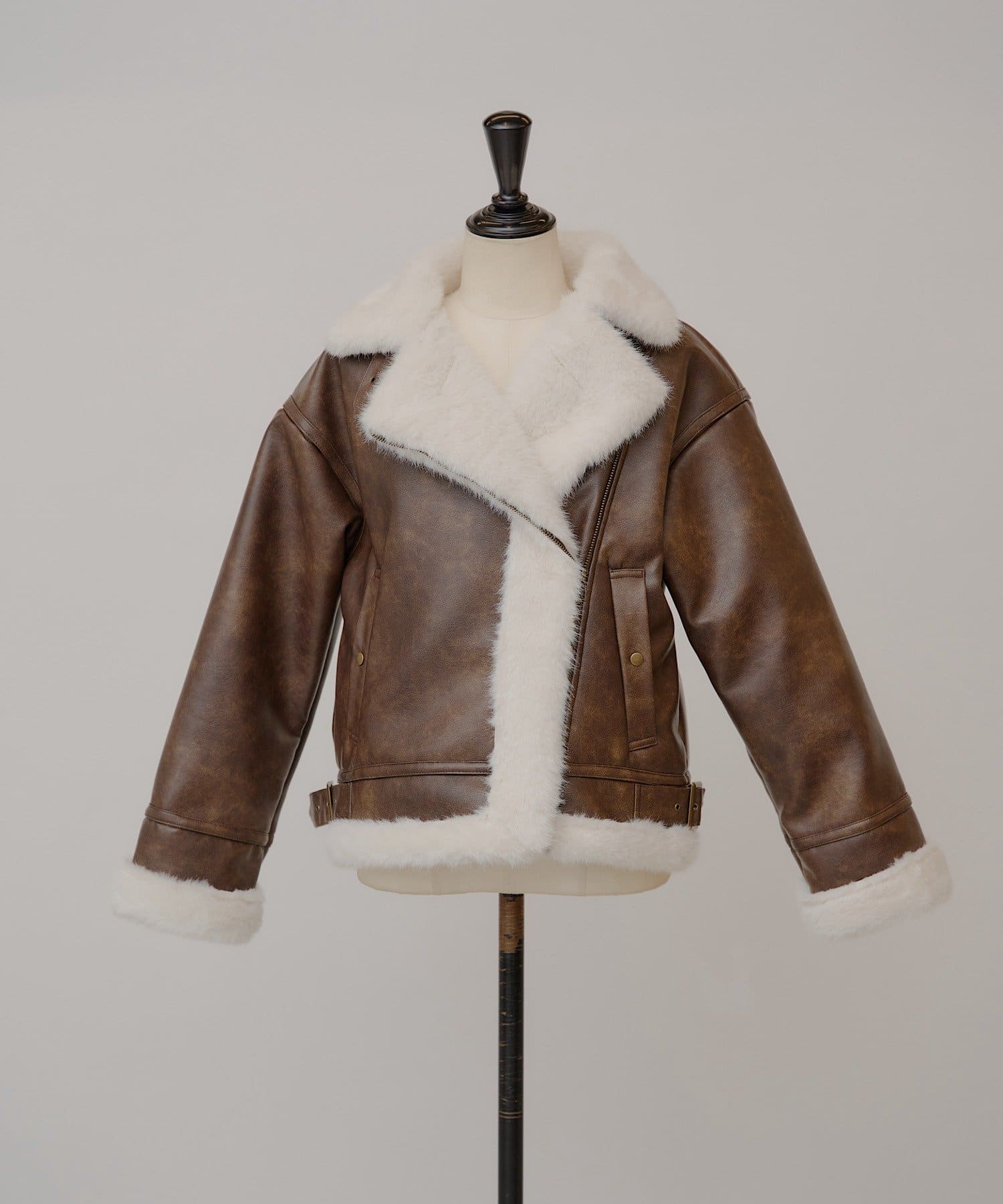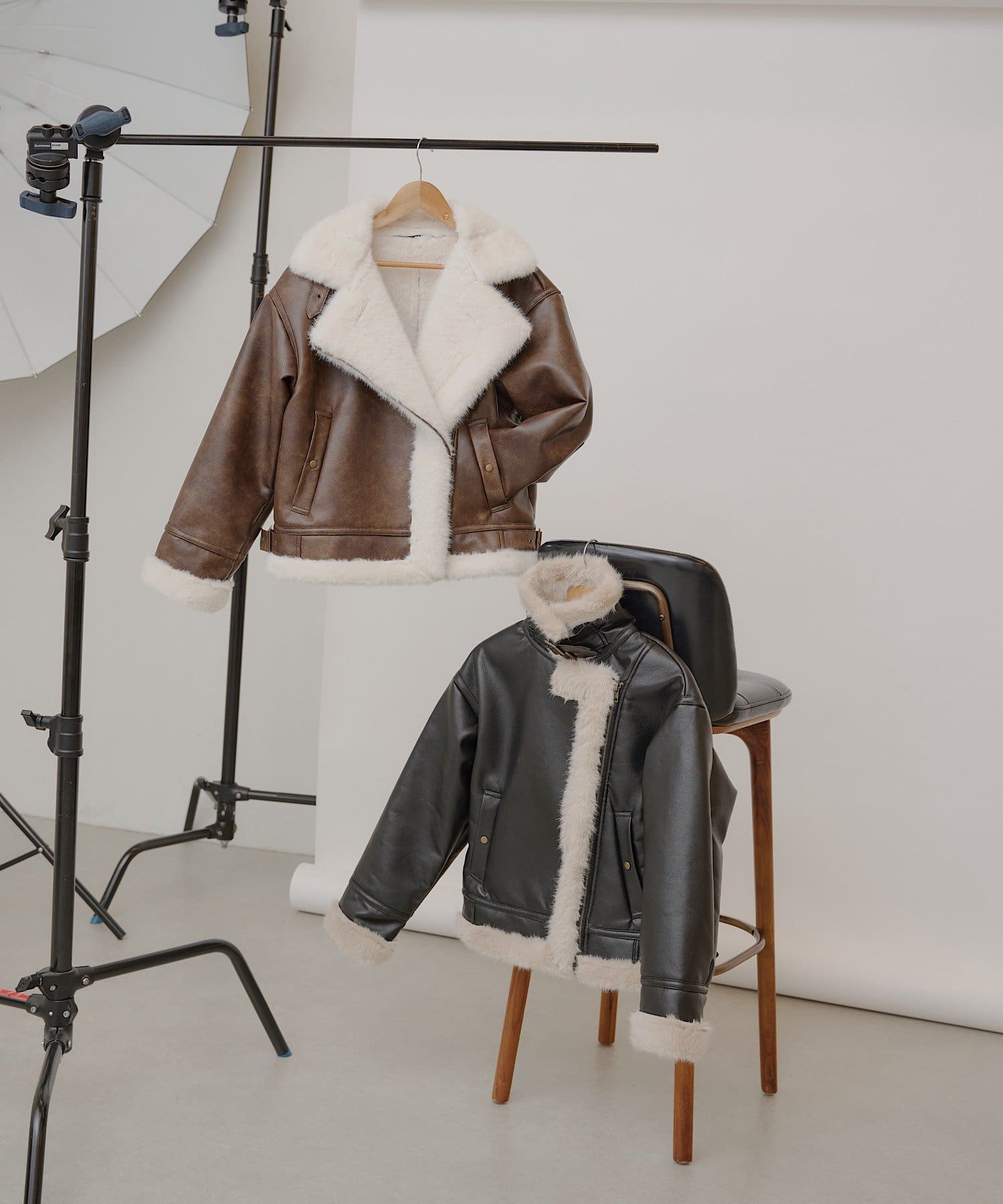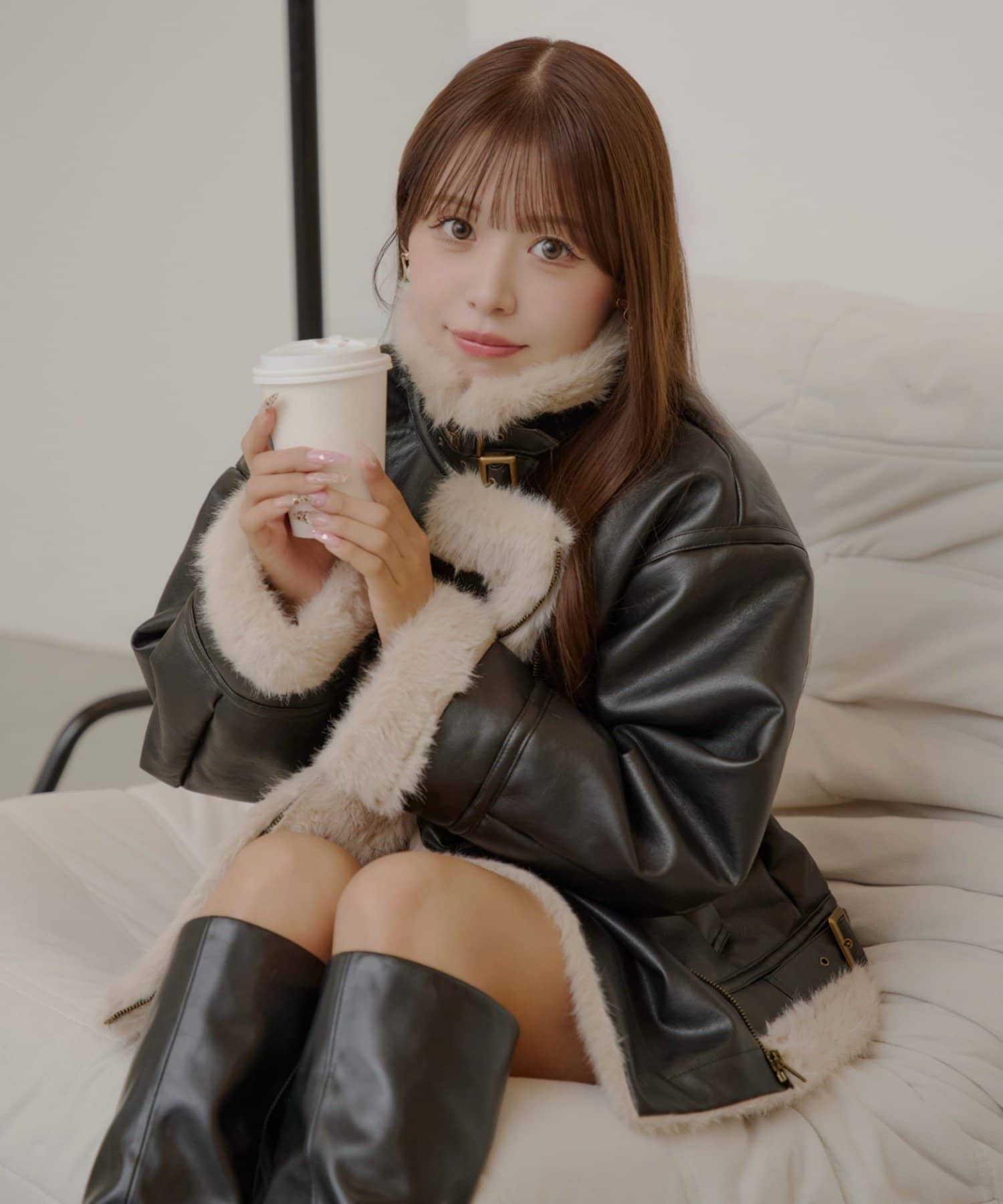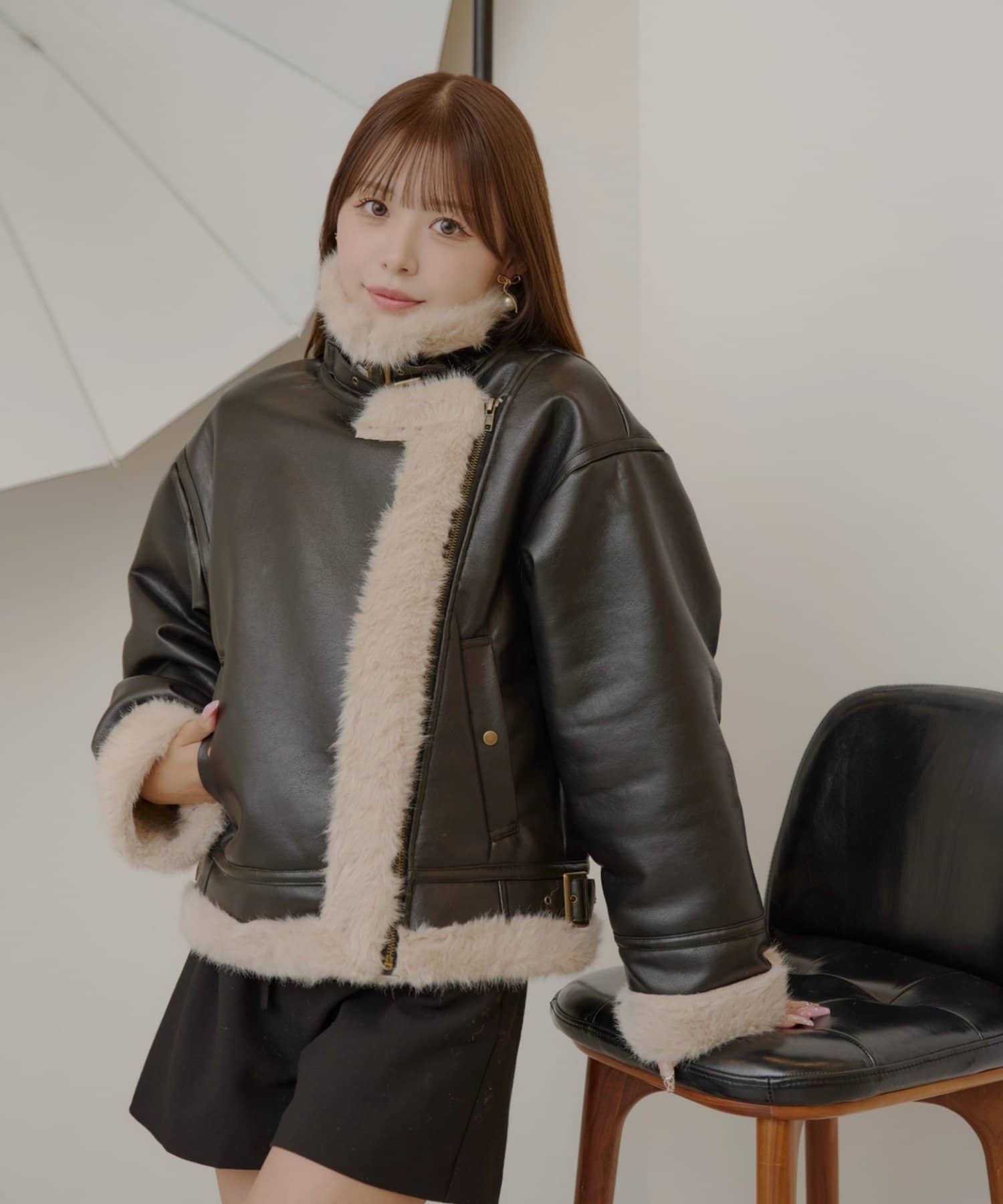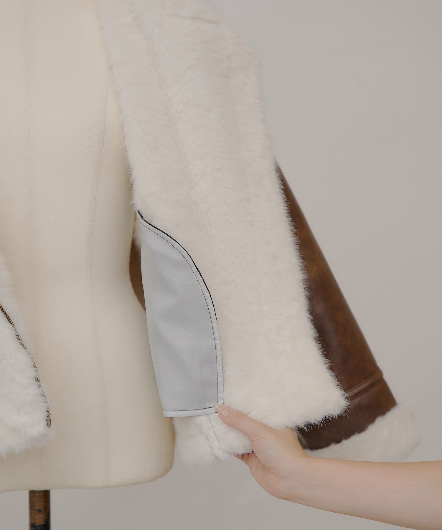・首元、袖口、裾にあしらわれたふわふわのファーが魅力のライダースショートジャケット。