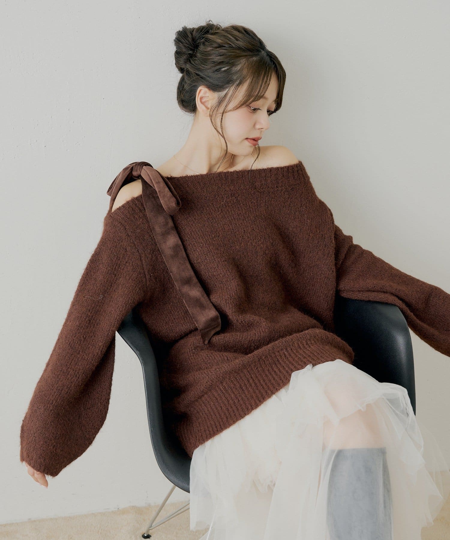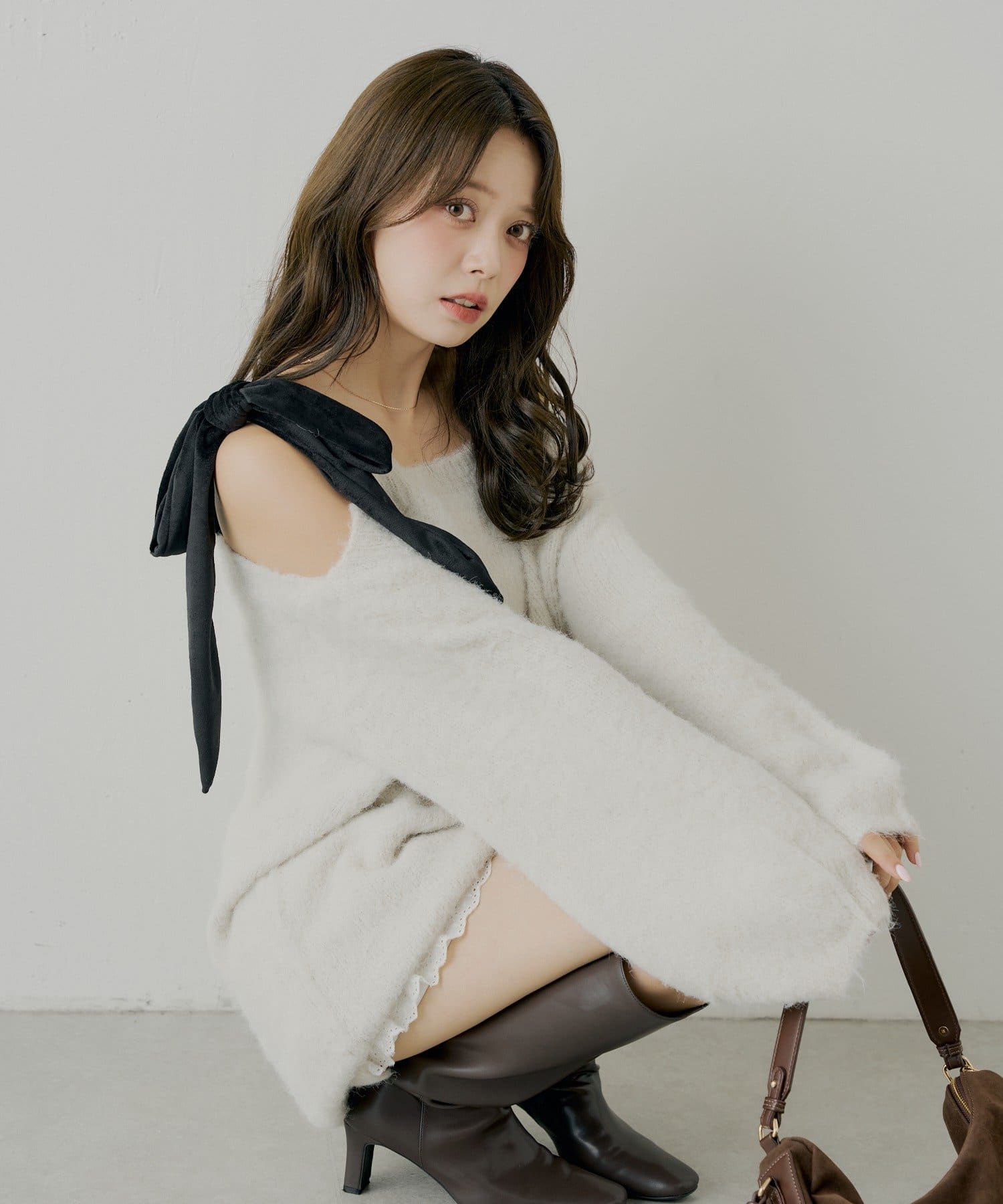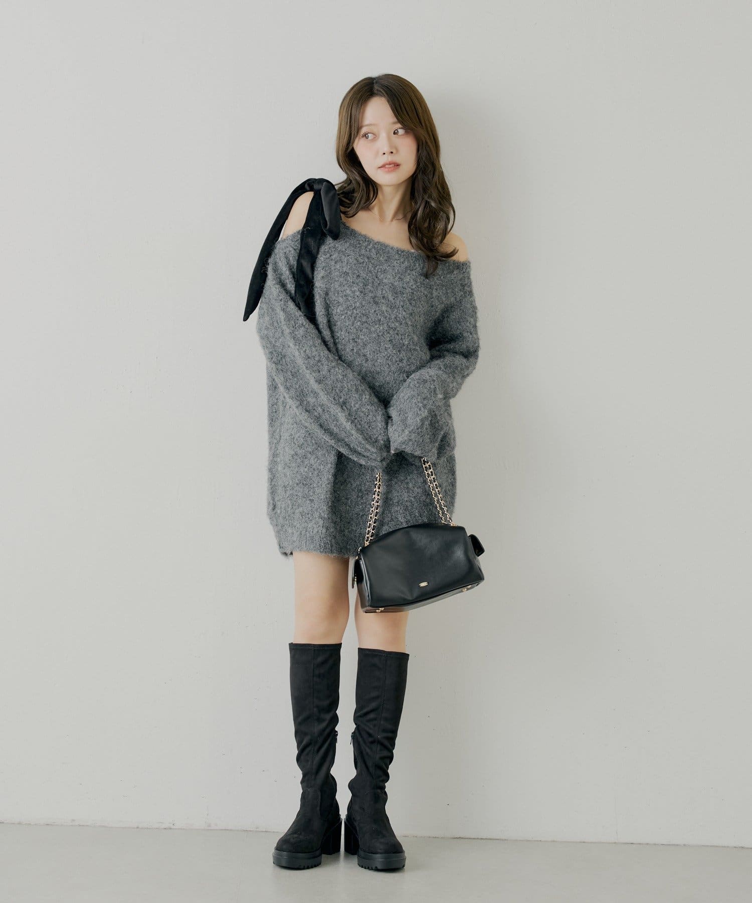 ・上品な光沢のベロア調リボンが、フェミニンな印象をプラス。
